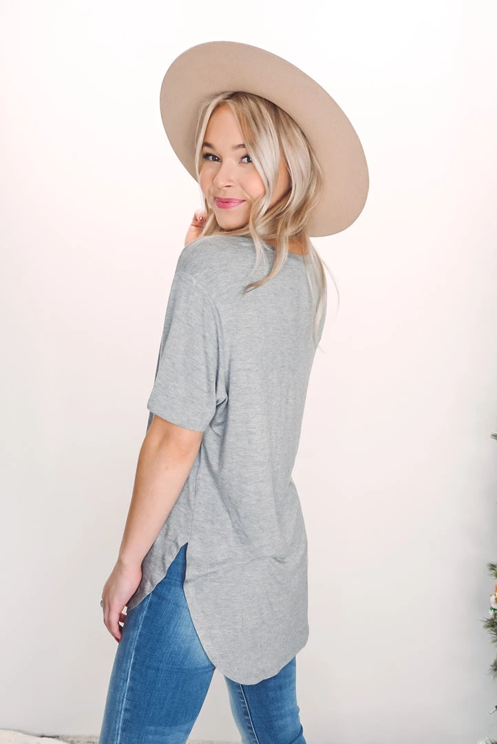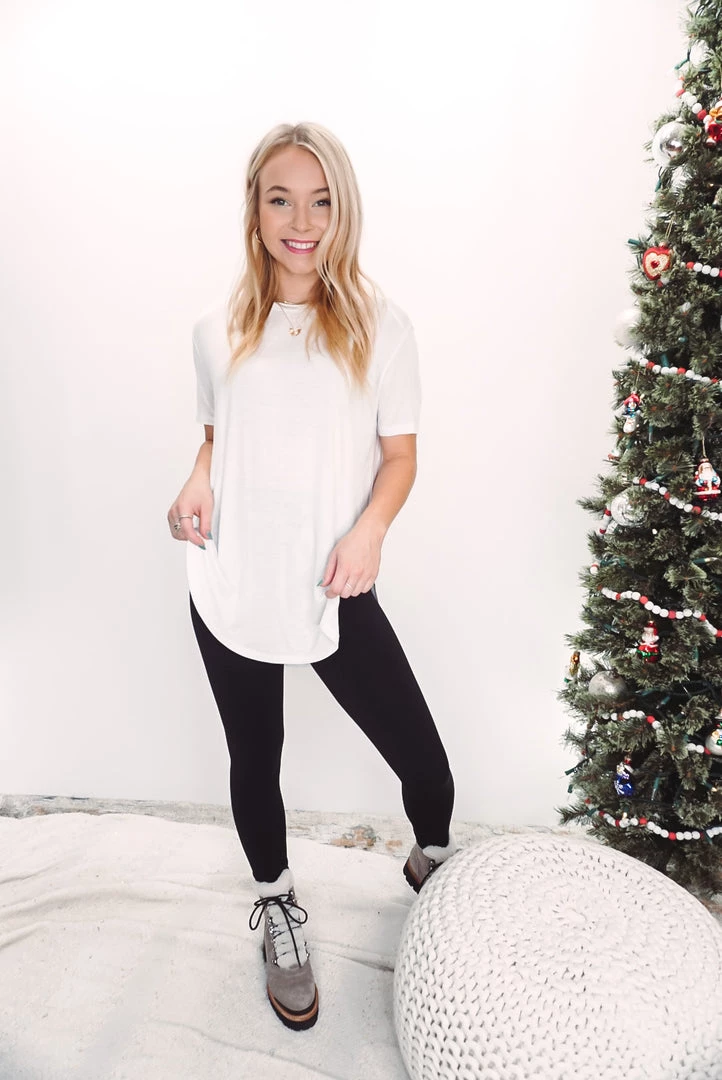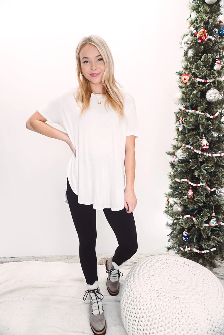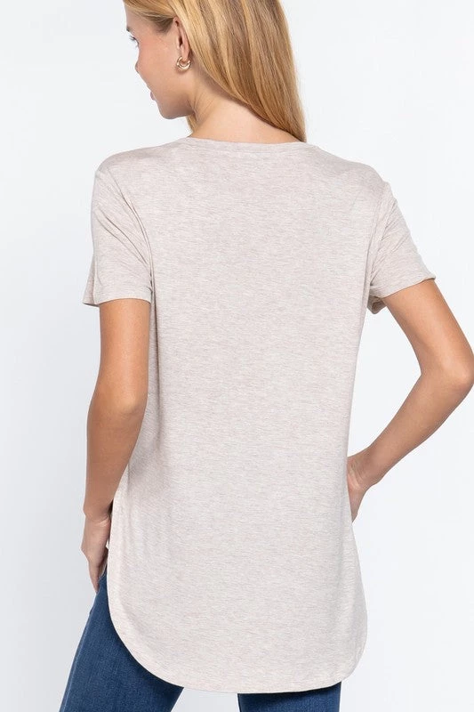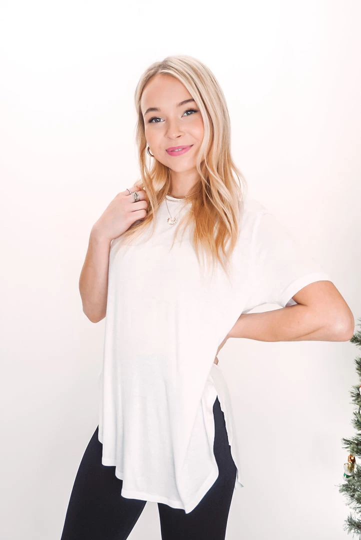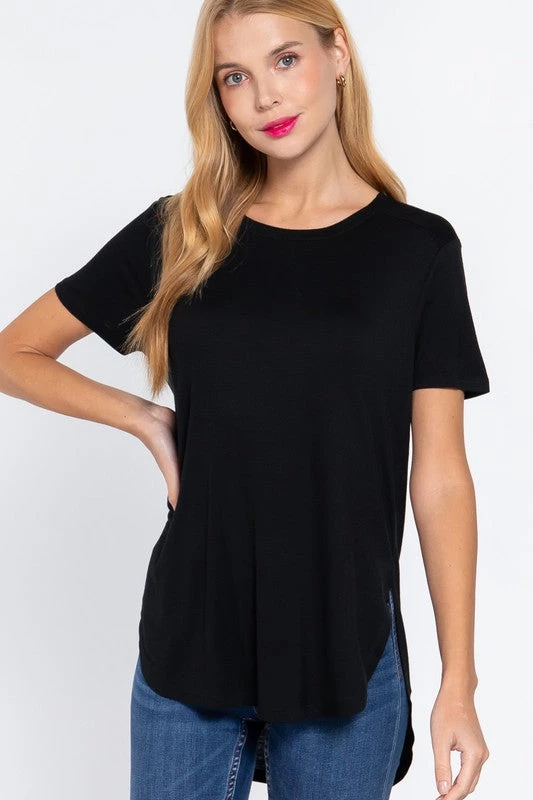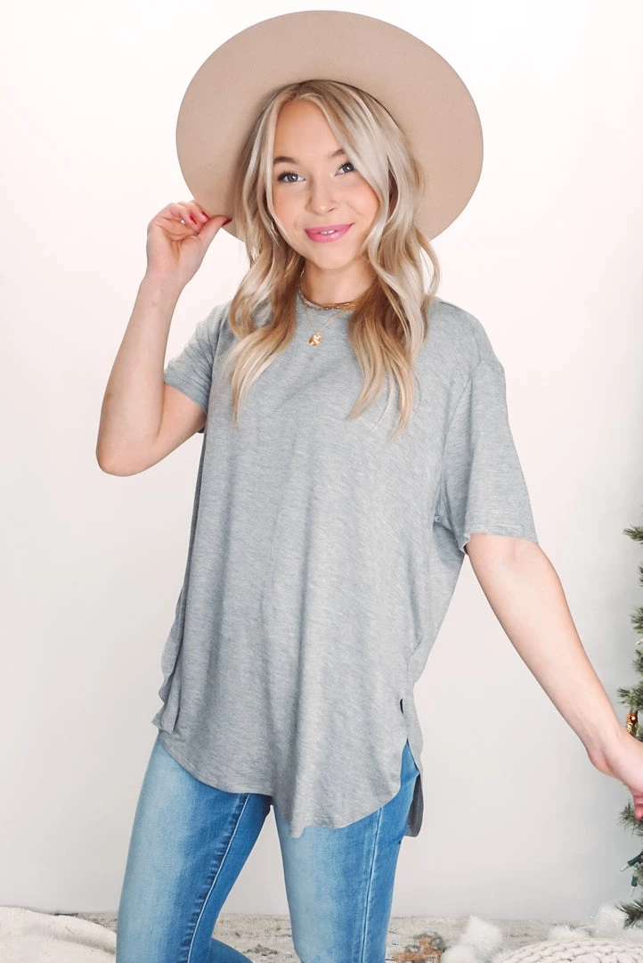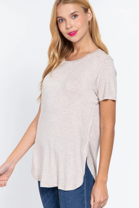 The perfect tee for layering under just about anything. Available in 4 neutral colors, this tee features a round neckline, curved hem, short sleeves, side slits, soft rayon fabric and a relaxed fit.