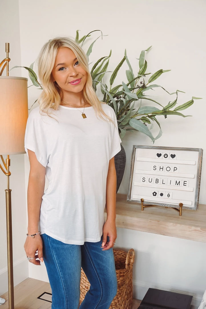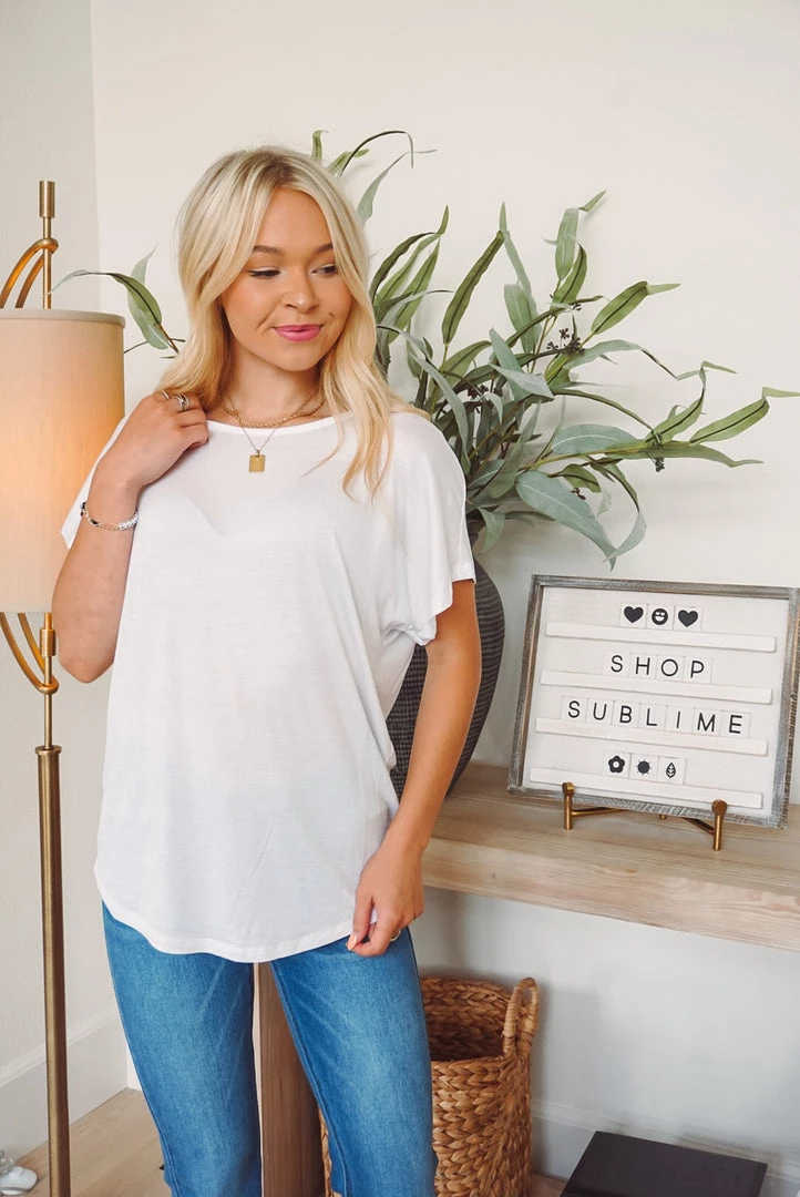 Comfy & casual with endless styling possibilities. This white tee features short dolman sleeves, rounded neckline, lightweight-soft feel, and a comfortable relaxed fit. Wear styled as a mid-layer or by itself with some denim for an effortless look!