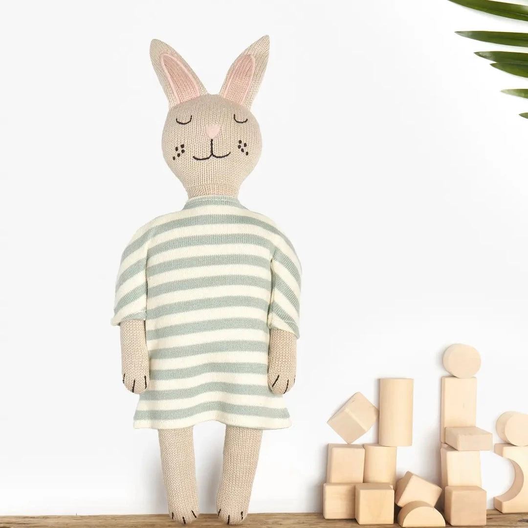 Our organic cotton bunny doll soft toy in a teal stripe dress is made from sustainably sourced organic cotton. Part of our Scandi range of tactile organic cotton toys, this soft doll toy is sure to delight your little one. Perfect for the modern nursery, this bunny doll is made in contemporary colors with a minimalist design and organic cotton fabric. Tested EN71 & CE. Our Scandi toys are all safety tested as suitable from birth and machine washable.
