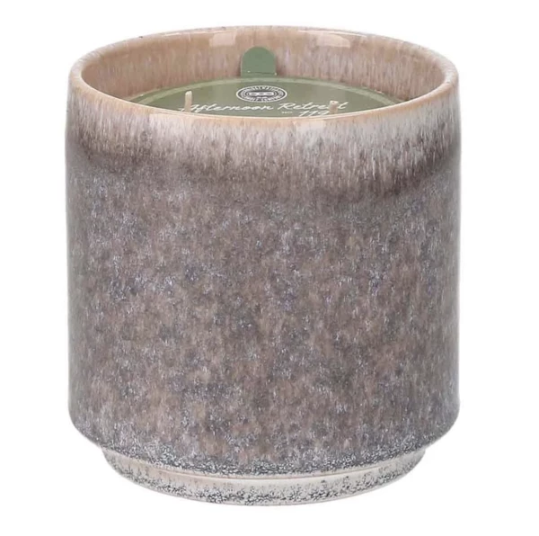 Earth toned hues create a subdued glaze application on this Afternoon Retreat Collection candle. Create a calming escape in your home with this neutral décor piece and the soft scent of Afternoon Retreat. Best described as the scent of soft moss with teak, sandalwood, amber, fresh bergamot and lime, the Afternoon Retreat Candle is made with soy-blend wax, and lead-free cotton wick, and a lot of love!
