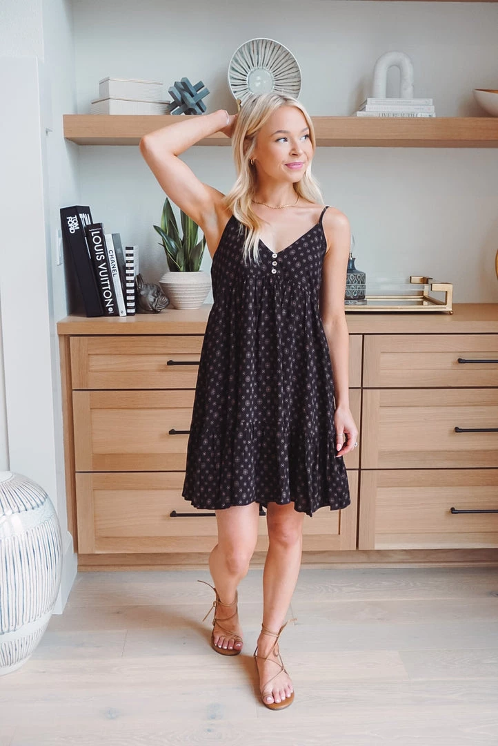 The perfect dress to throw on for summer! The Iggy dress features a woven crinkle fabric, adjustable spaghetti straps, babydoll style, tribal print, and a relaxed fit. Pair with your favorite sandals or wear as a swim cover-up!