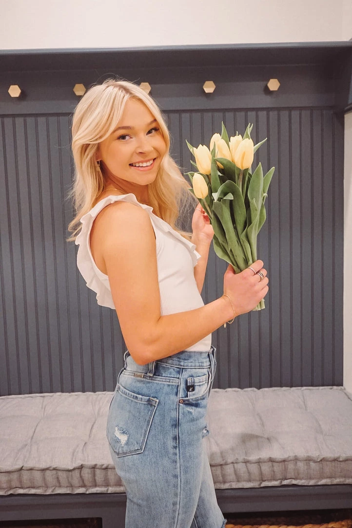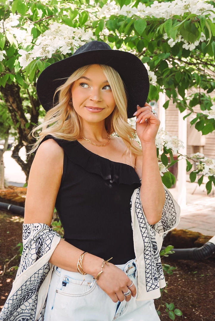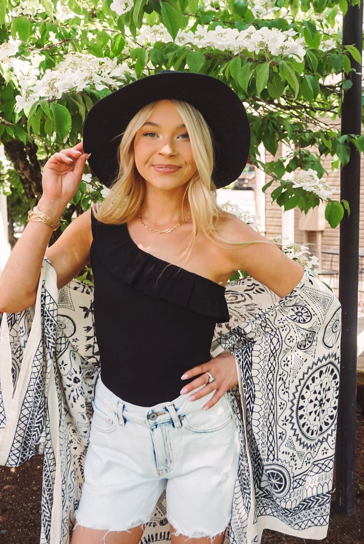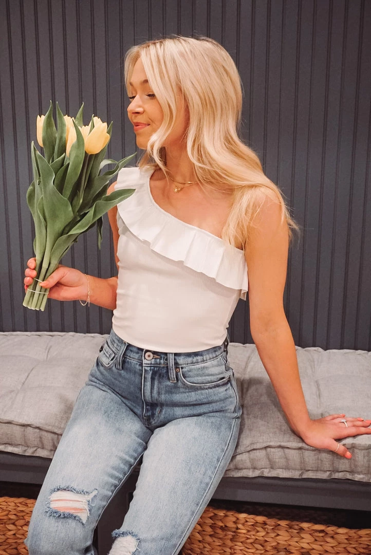 How cute is this one shoulder ruffle tank? Featuring a ribbed knit, fitted silhouette, one shoulder neckline, and ruffle sleeve detailing. Available in black & white, this tank pairs nicely with just about any bottoms for the perfect elevated basic.