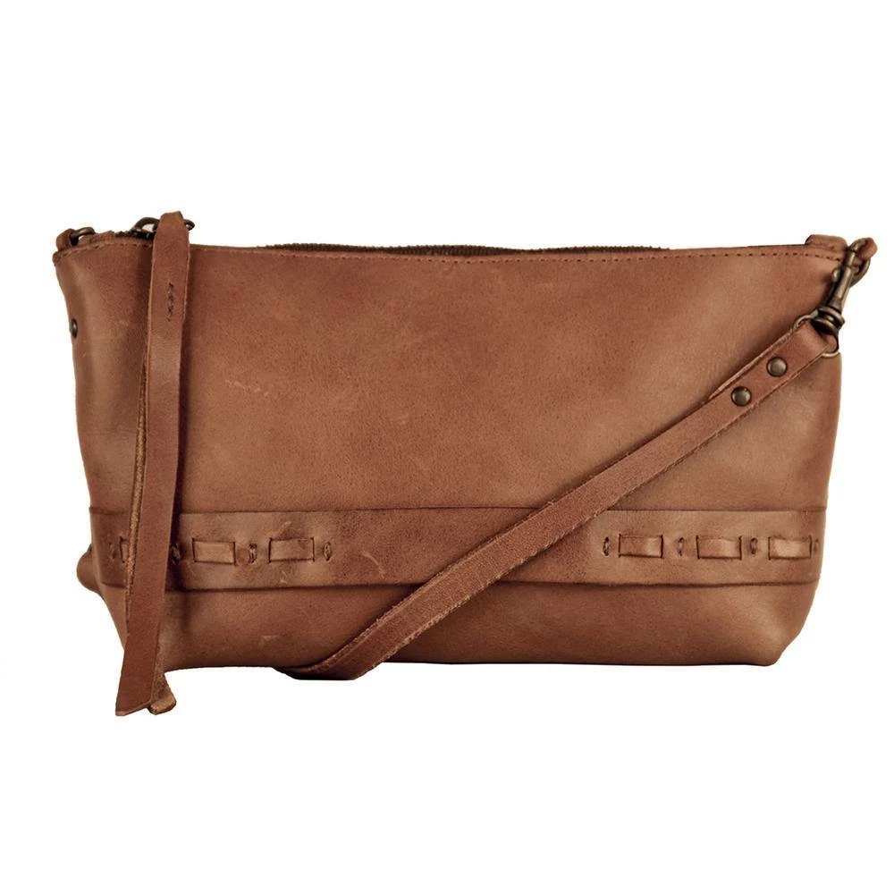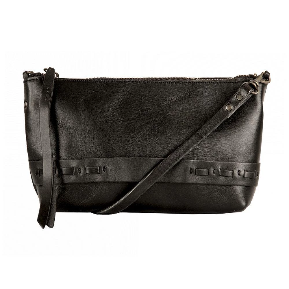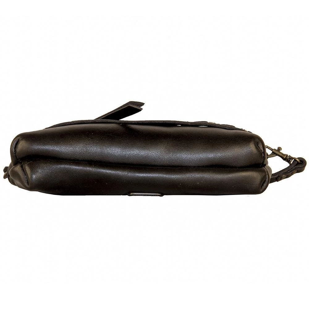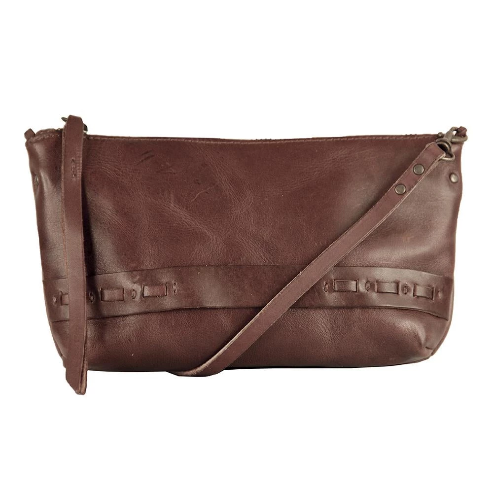 - Design detailing includes interwoven leather cultch strap & small antique brass rivets plus long leather zipper pull