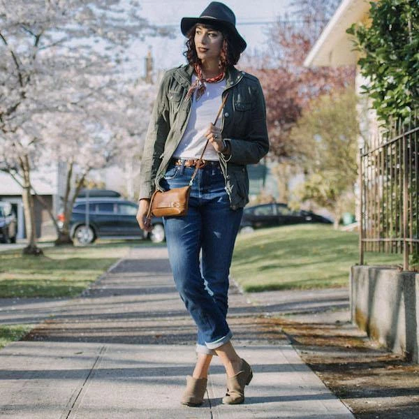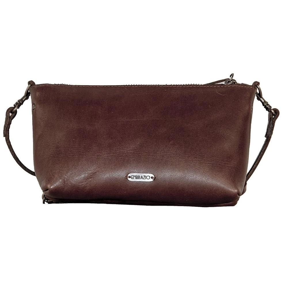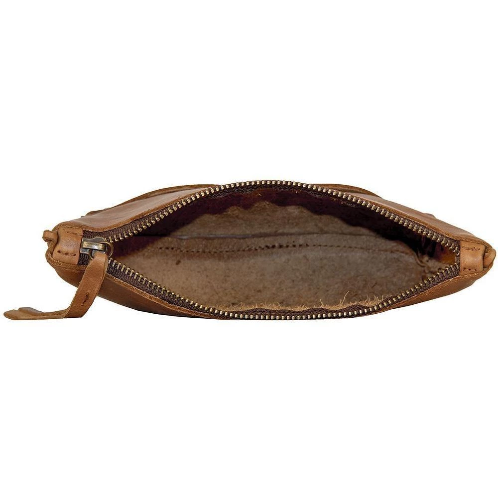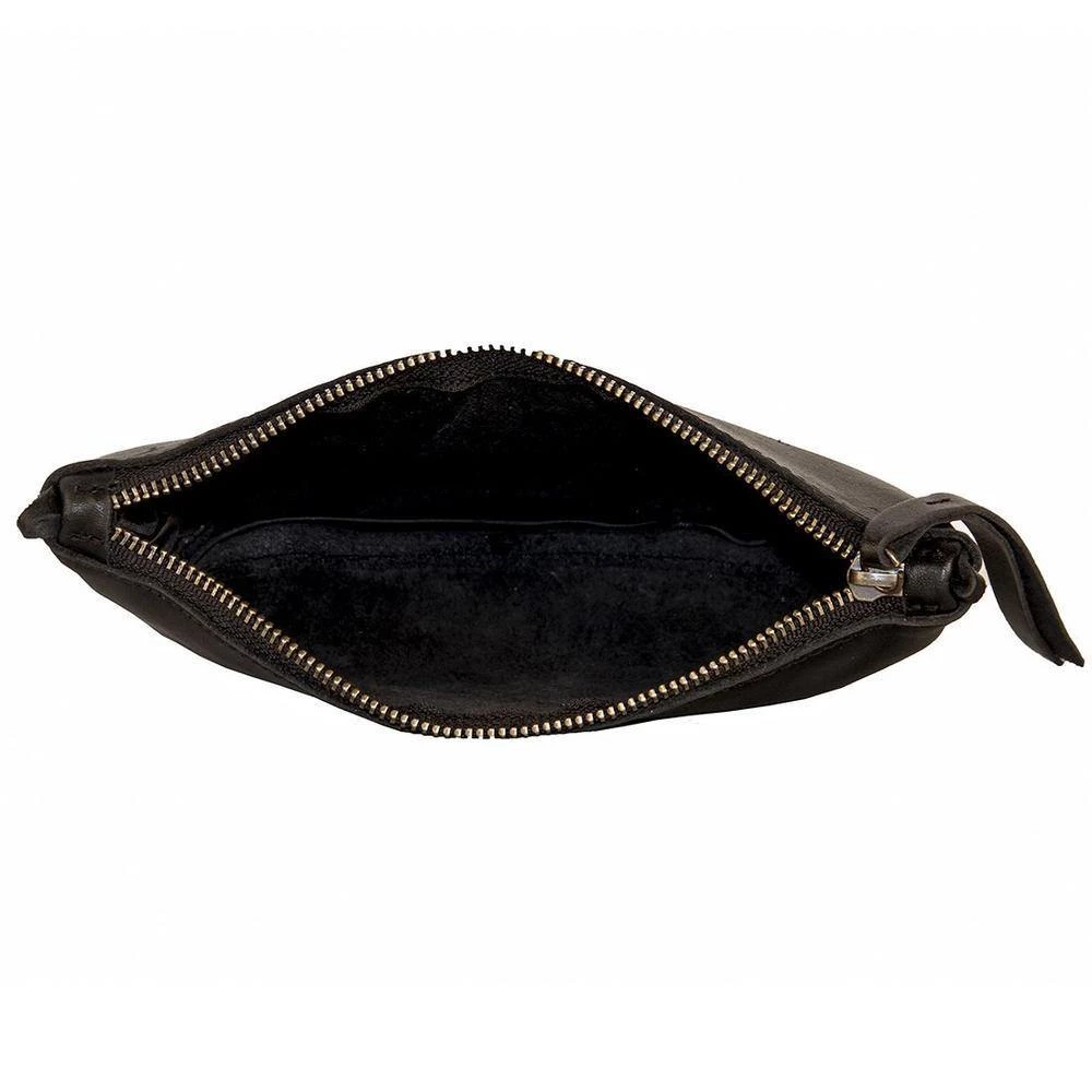 - Design detailing includes interwoven leather cultch strap & small antique brass rivets plus long leather zipper pull