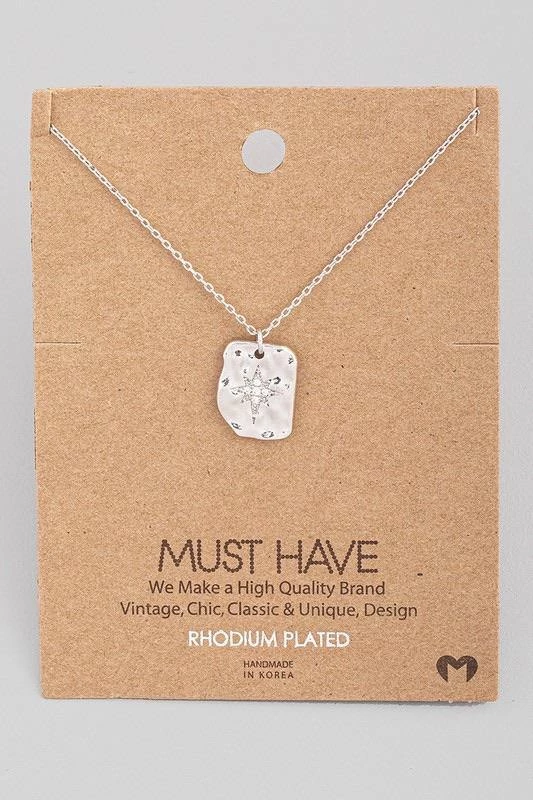 A unique pendant necklace featuring a distressed square shape pendant with North Star detailing. Available in a gold & silver finish on a delicate chain.