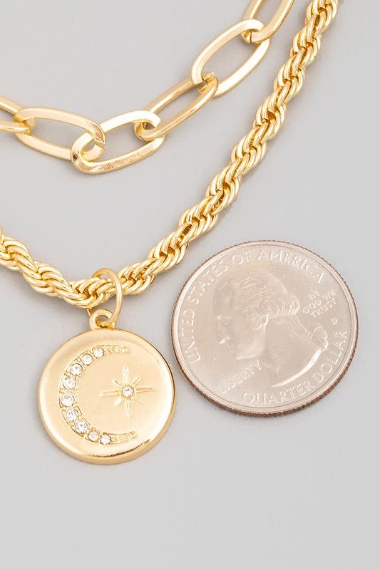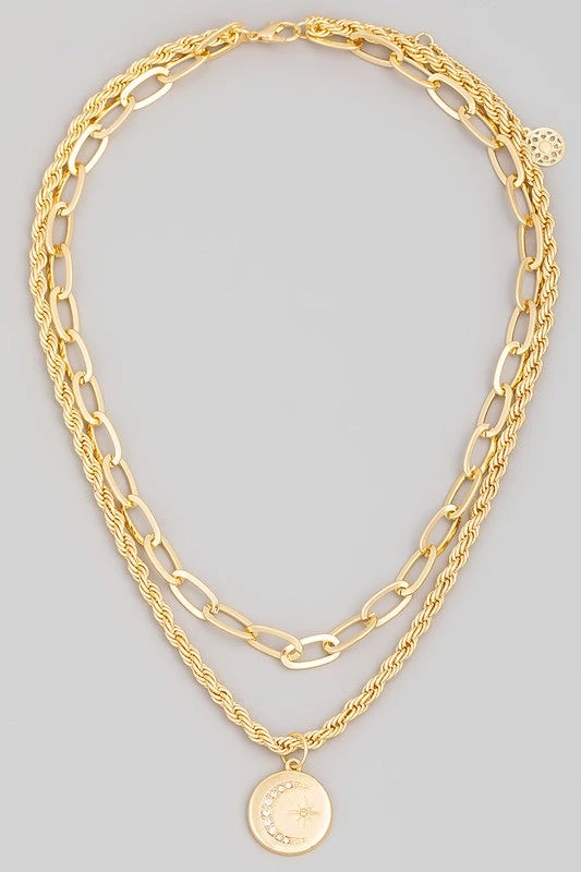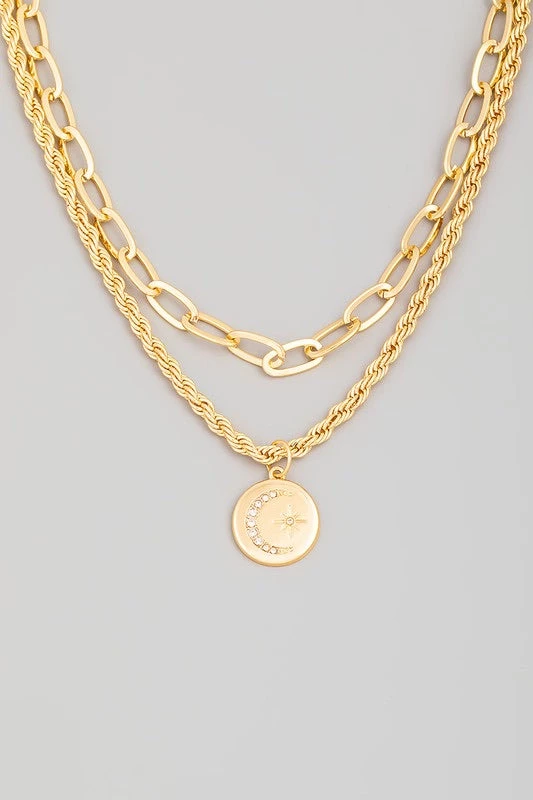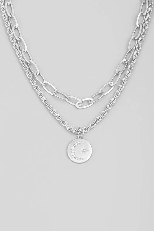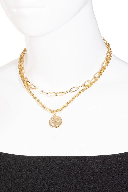 Achieve a darling layered look with this gorgeous pendant necklace. Featuring a contrast chain edgings, circle pendant detailing and clasp closure. Available in silver & gold.