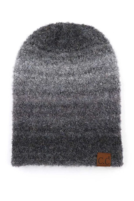 A unique accessory to add to any outfit this winter! This C.C multi color ombre knitted beanie features a shearling mohair & cuff style.