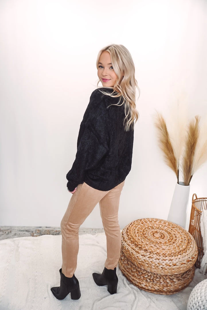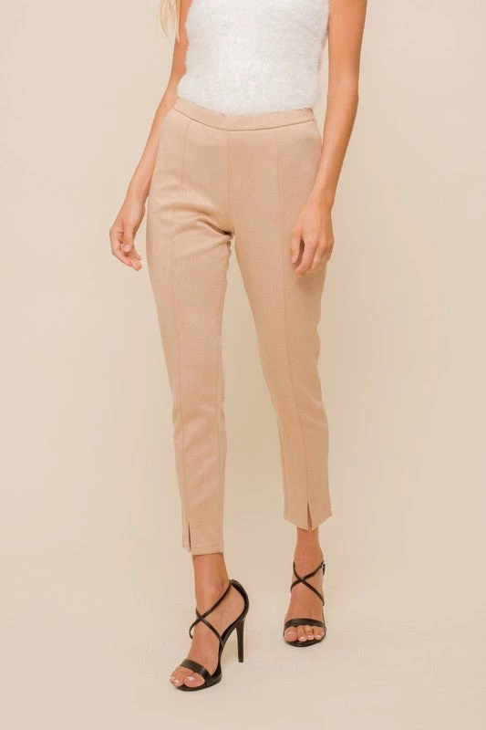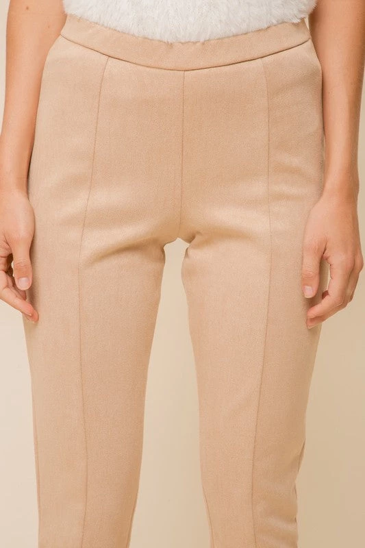 This “legging” style pant is such a fun bottom! Featuring a notch hem, suede feel, elastic waist, front seam detailing, ankle length, and a fitted silhouette. Pair with a chunky sweater or dress up with a blouse! The neutral hue of these pants make them easy to pair with a variety of styles!