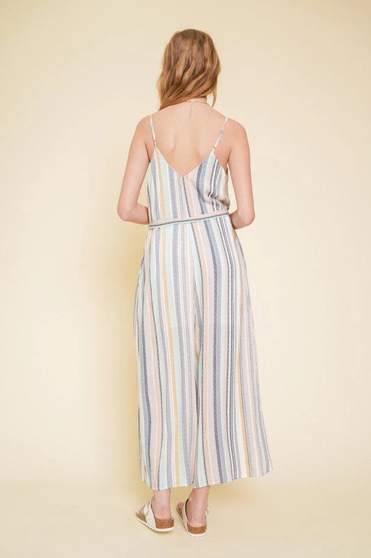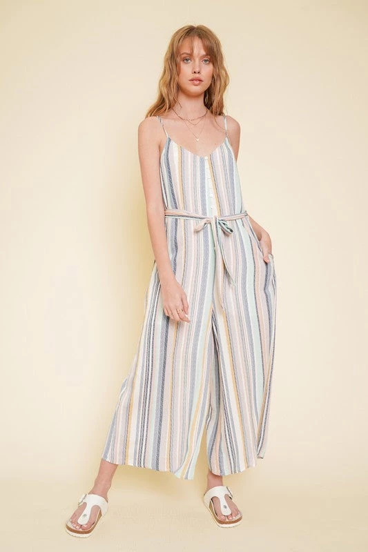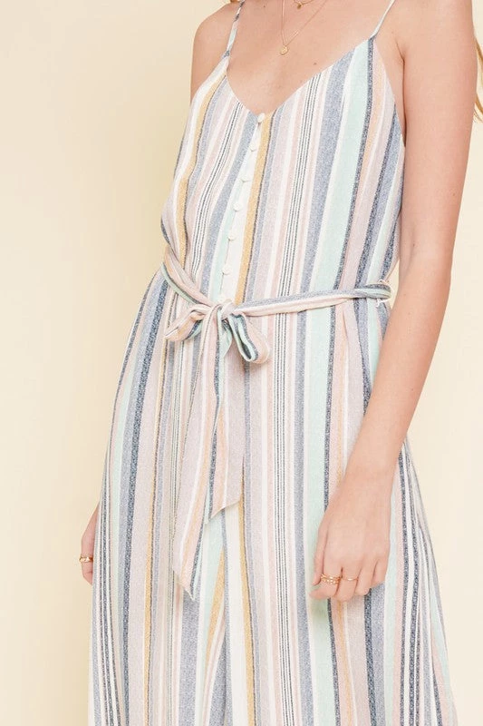Add some color with the Party Line Jumper! Such a stunning ensemble yet an effortless wear. Featuring a multicolor stripe design, button front detailing, belted waist accent, side pockets, wide legs, and a relaxed fit. Layer with a denim jacket or wear by itself paired with sandals for a darling summer style!