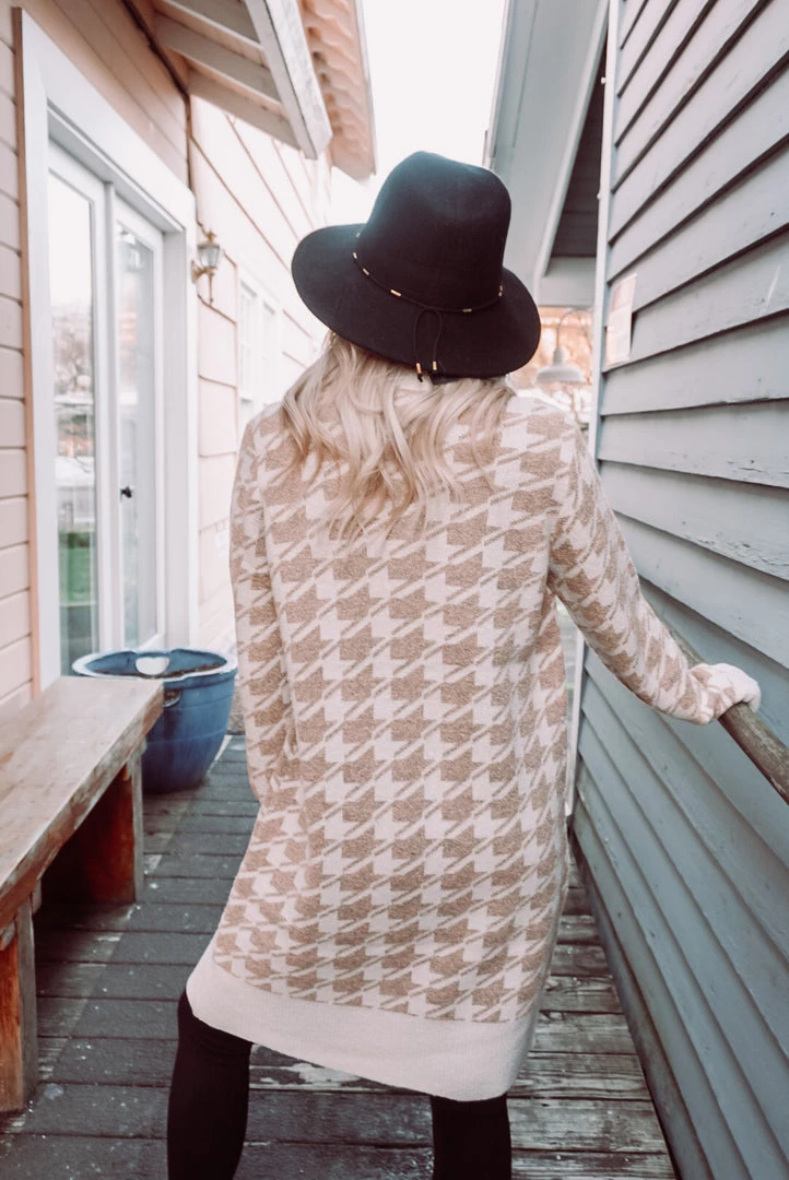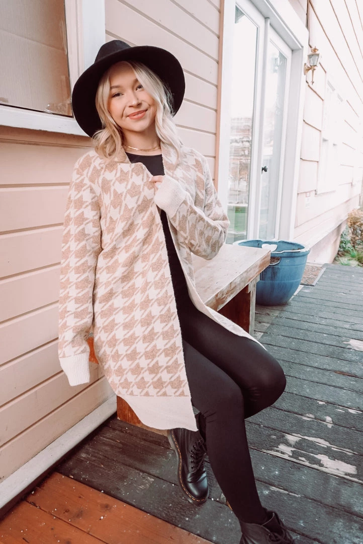 Cozy up in this neutral Houndstooth print cardigan! Featuring an open front design, long line silhouette, long sleeves, ribbed cuffs & hem, and a relaxed fit. Layer over just about anything for an easy-to-wear style yet stunning look!
