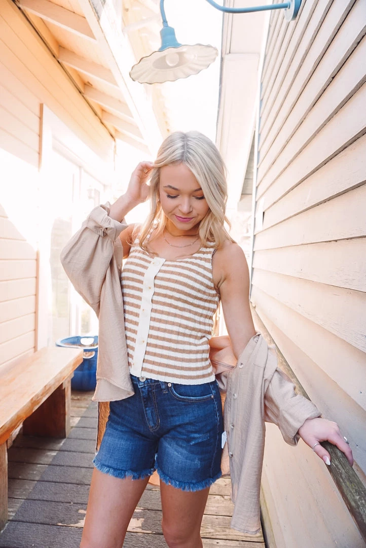 Cute & comfy! This tank features a striped pattern, ribbed texture, button front detailing, and a fitted silhouette. Layer or wear by itself for an easy wear & great transitional style.