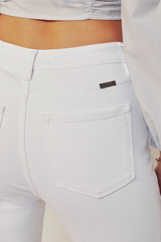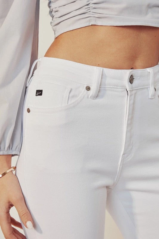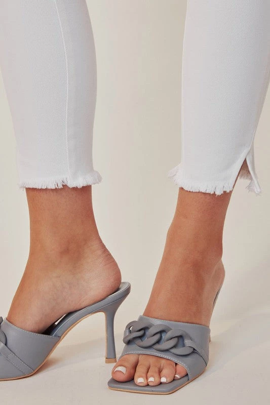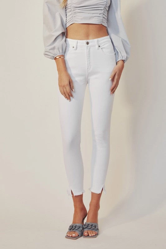 These Rico high-rise ankle skinny jeans are the classic skinnies that you can dress up or down. These jeans have a twisted side seam and an open bottom hem detail for an extra flare. Features a classic five-pocket design, single-button front, and zip fly closure. Finished with silver-colored hardware.