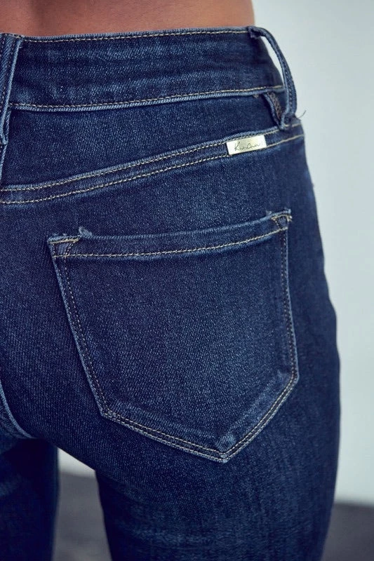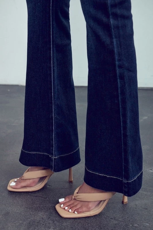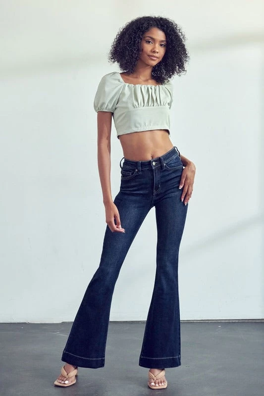 Our Ryder High Rise Flare Jeans come in a dark wash with whisker details for classic non-distressed look. Sits above the natural waistline as it tapers down the thigh and begins to flare out at the calf. made with stretch denim that holds its shape for a flexible and comfortable fit. Features a classic five-pocket design, single-button front, and zip-fly closure.