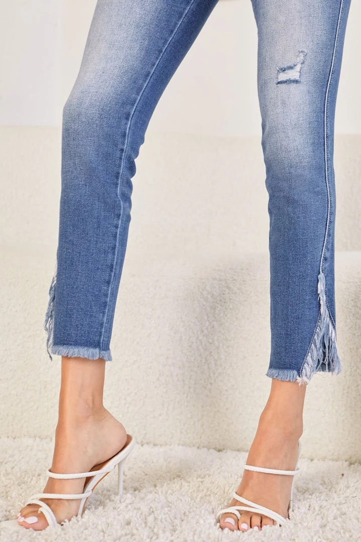 The Caleb High Rise Ankle Skinny melds a faded medium wash with a slit, raw hem to create a chic fit. Sitting above the waist with minor whiskering at the front, these jean’s goal is to dazzle and attract all the right attention.
