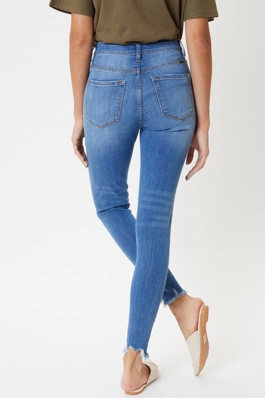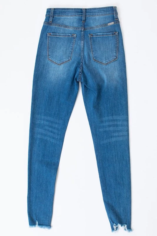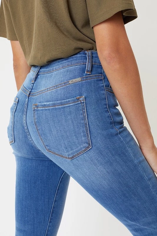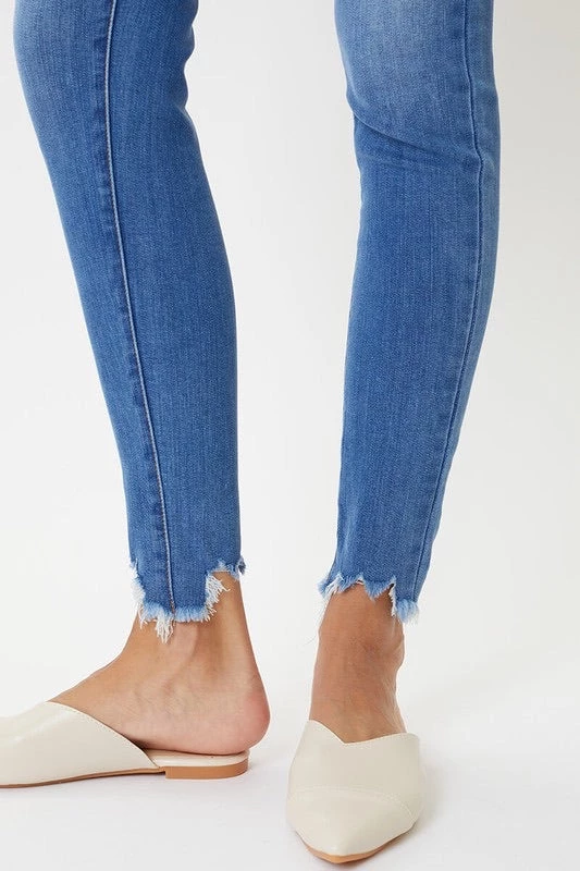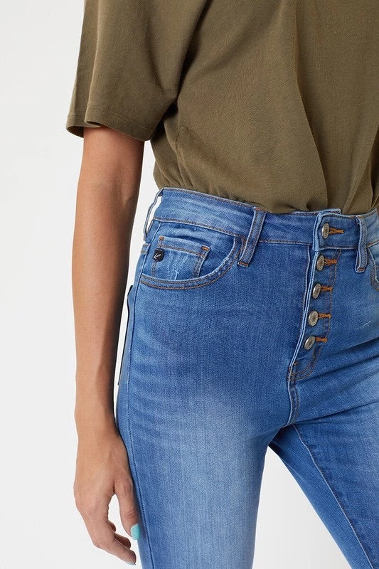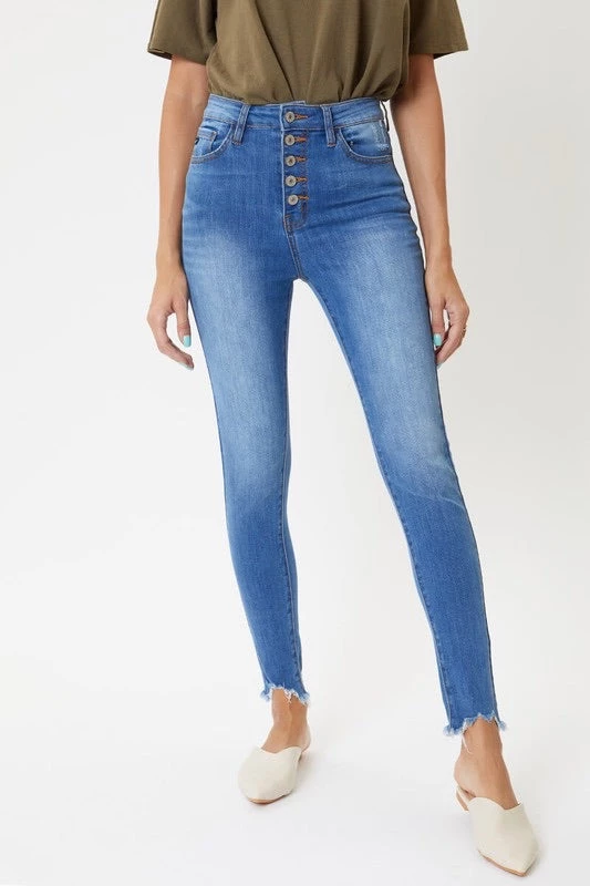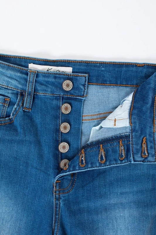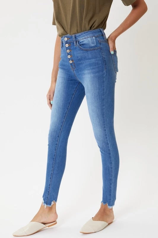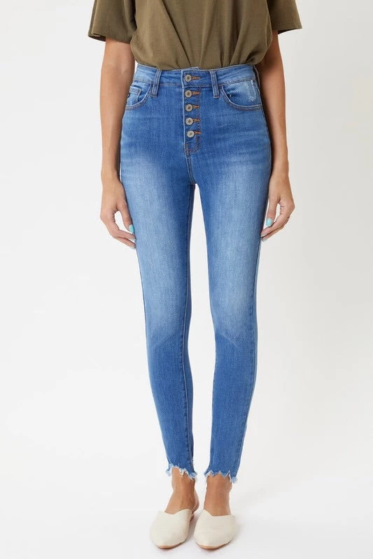 The Connor Denim comes in a faded medium blue wash perfect for any season. Its raw hem gives this style a vintage look while its button front closure gives it a modern feel. Sitting above the waist with a super skinny fit and just enough stretch for comfortable, everyday wear.Â