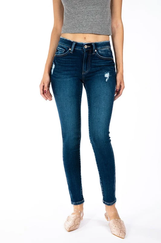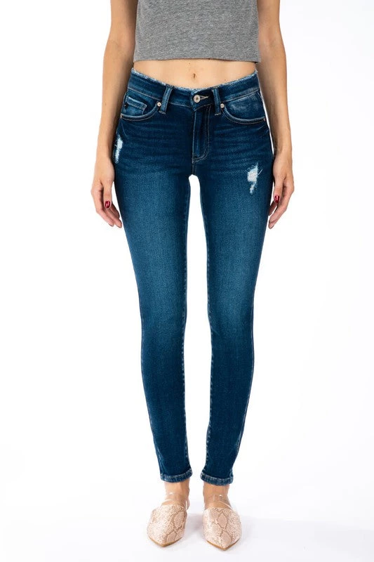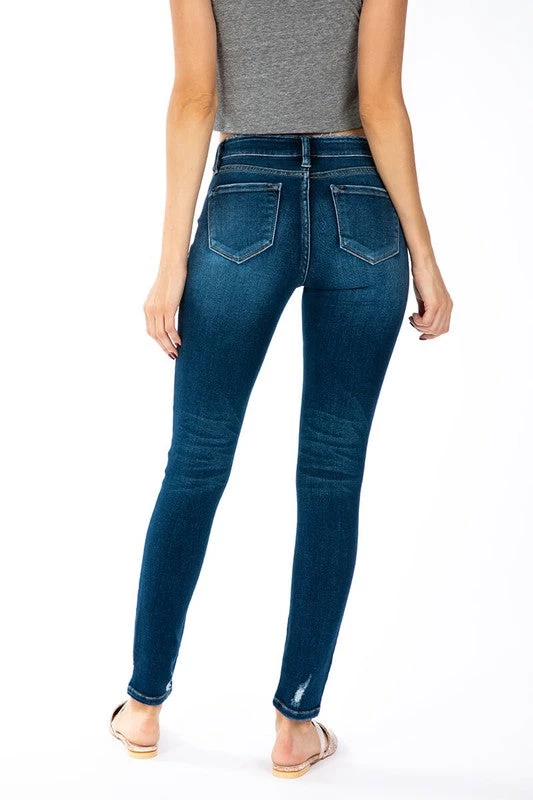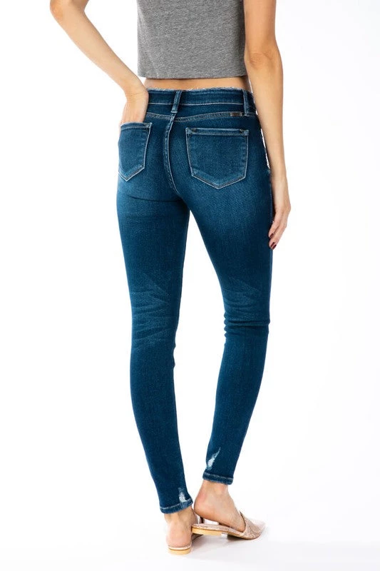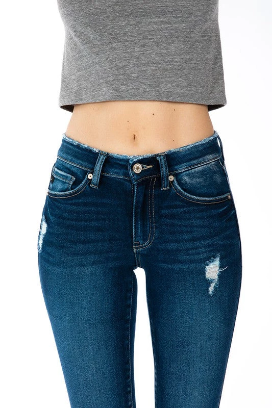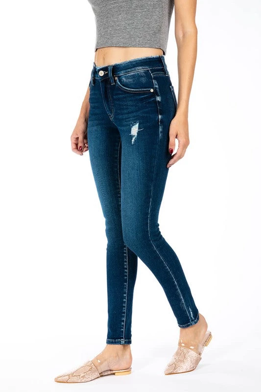 These mid rise skinnies are such a staple. Slight distressing all around add the perfect touch to these classic mid wash skinny. They even have a tiny bit of distressing at the hem to make them even cuter when cuffed.