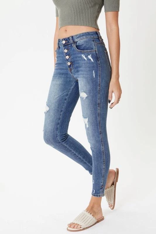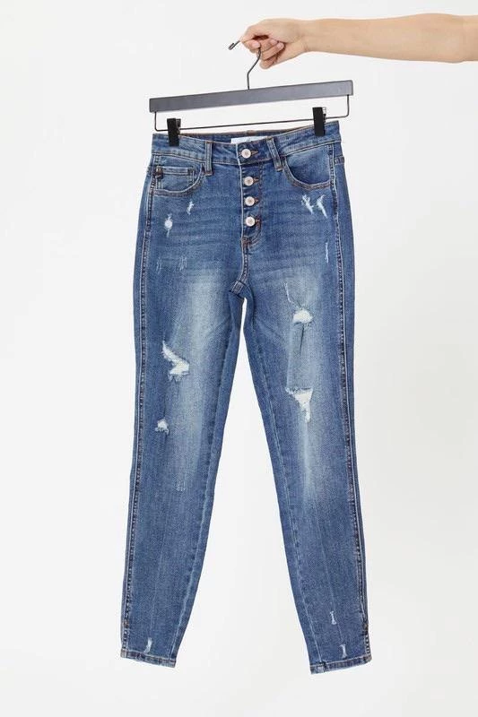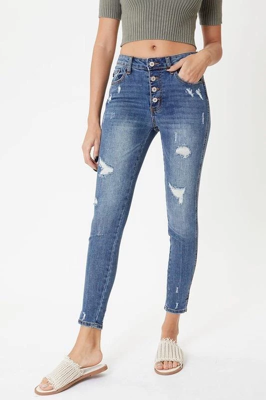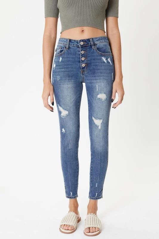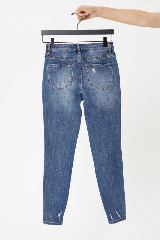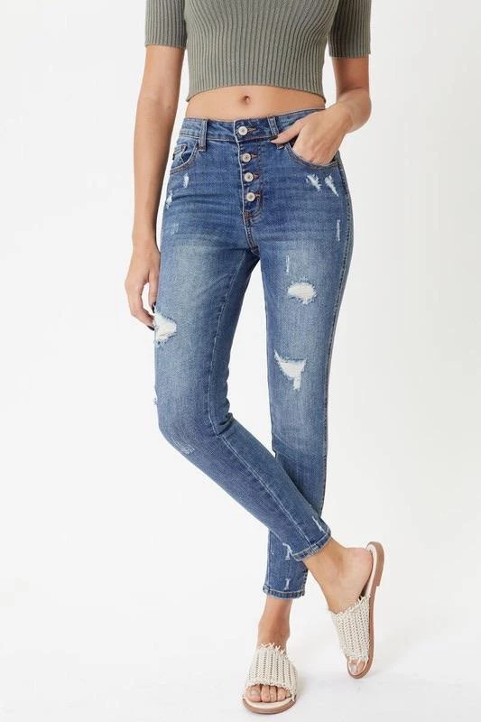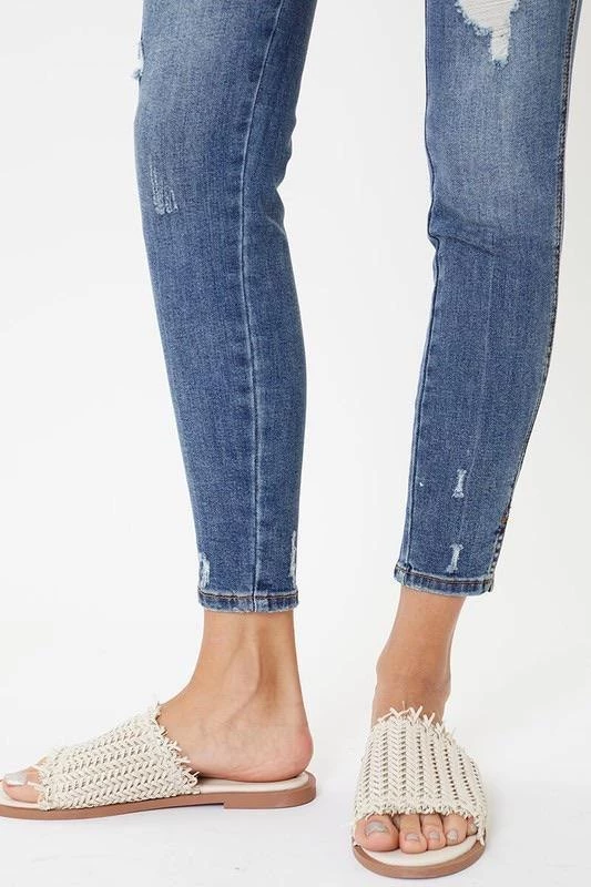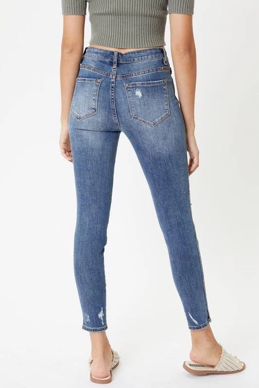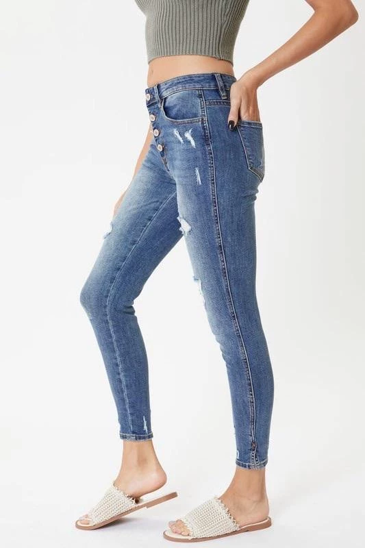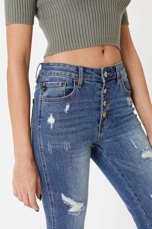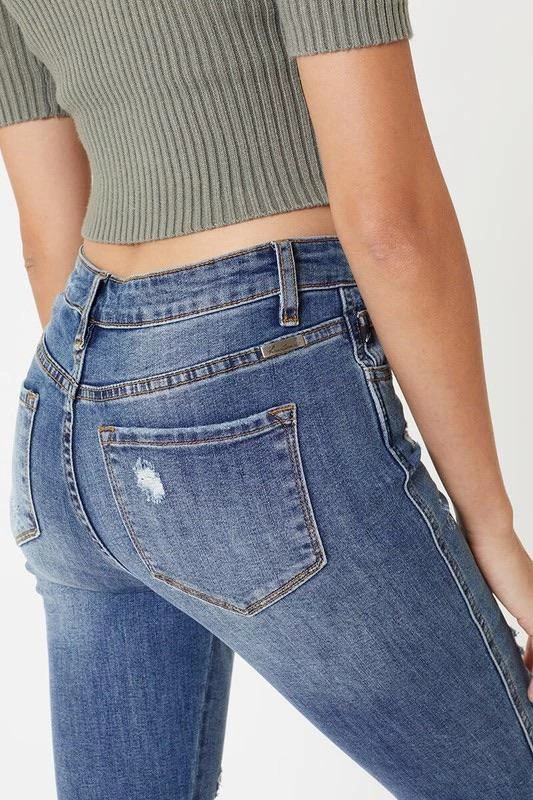 This medium wash with moderate distress and whiskering has our Oliver mid rise denim looking as chic as can be. Create subtle or bold looks to fit right into any occasion. Sitting just above the waist with a slit hem and dark stitch design, this style was made to stand out.