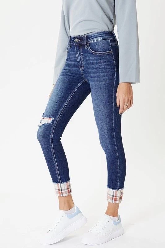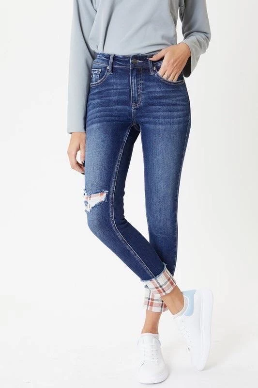 Something a little different to mix up your denim! The Pieper is a darling denim featuring a plaid lining in the distressing and on the cuffs. Cut in a mid rise and skinny silhouette.