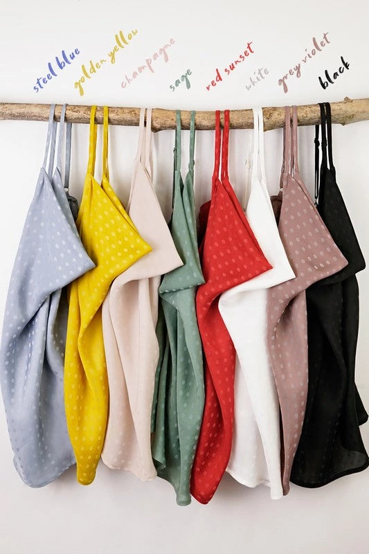 Simple yet so sweet! The Brindle Tank features a subtle polka dot print, cowl neckline, cami straps, flared hem, and a relaxed fit. Layer under cardigans and jackets for a fun texture & comfortable wear!