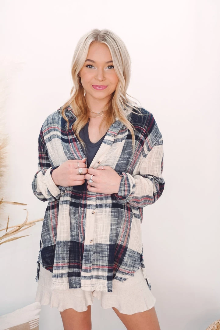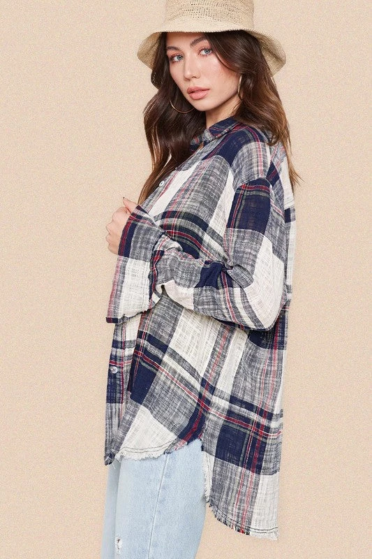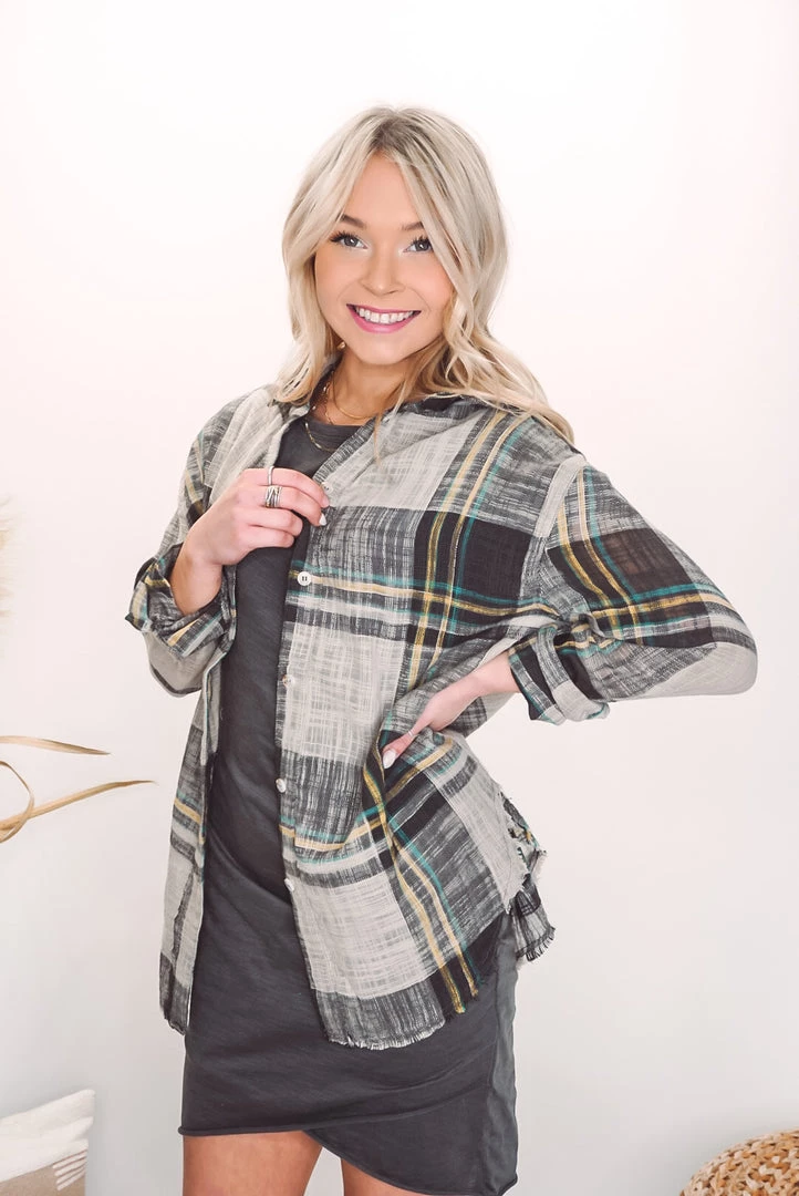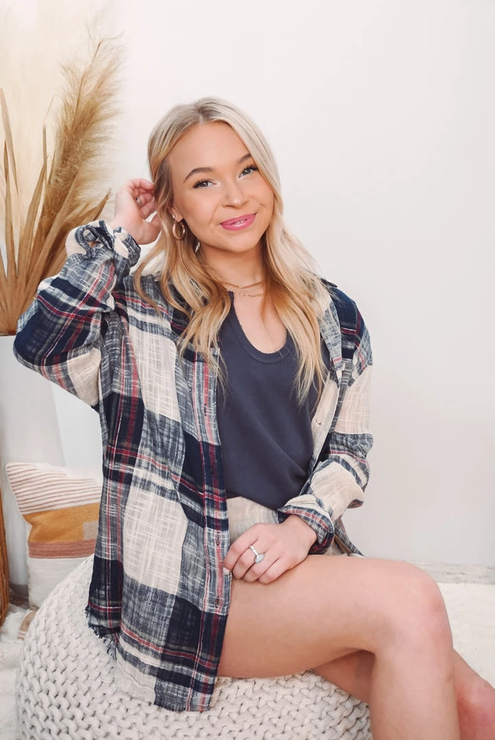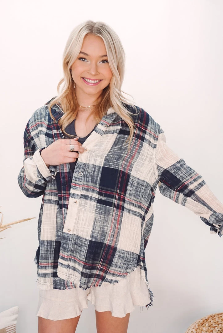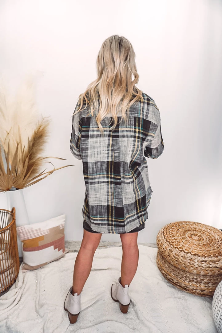 We are obsessing over this lightweight button down flannel! Add edge to any look with this effortless plaid shirt. Features a perfect bold plaid print and slouchy, relaxed fit with long sleeves and distressed detailing throughout for the perfect lived-in look. Long, high-low hemline wears well over anything!