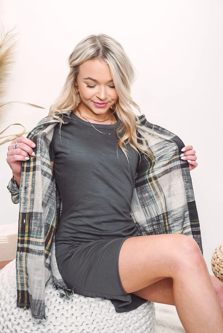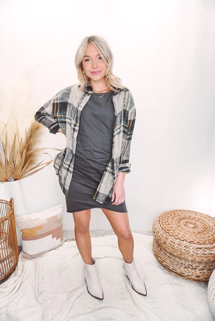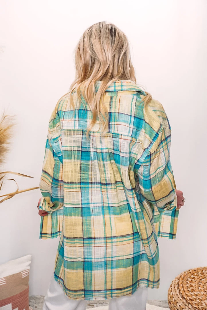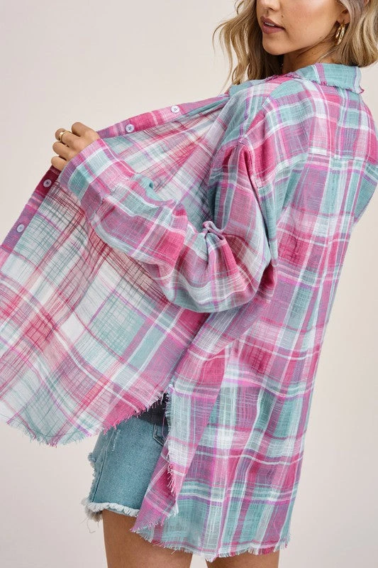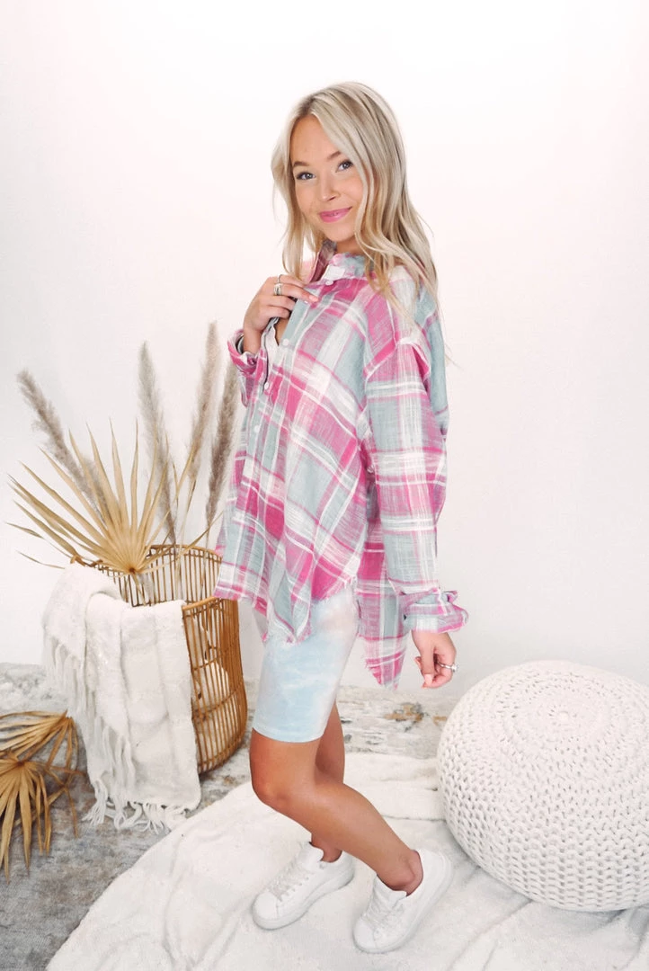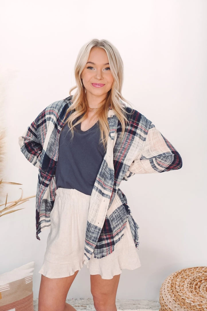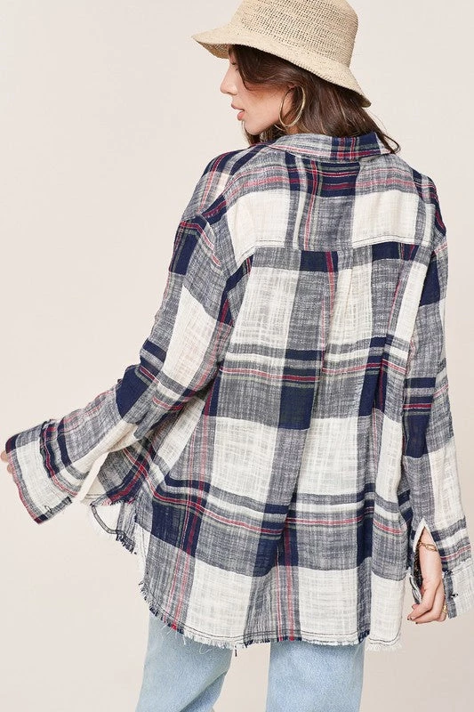 We are obsessing over this lightweight button down flannel! Add edge to any look with this effortless plaid shirt. Features a perfect bold plaid print and slouchy, relaxed fit with long sleeves and distressed detailing throughout for the perfect lived-in look. Long, high-low hemline wears well over anything!