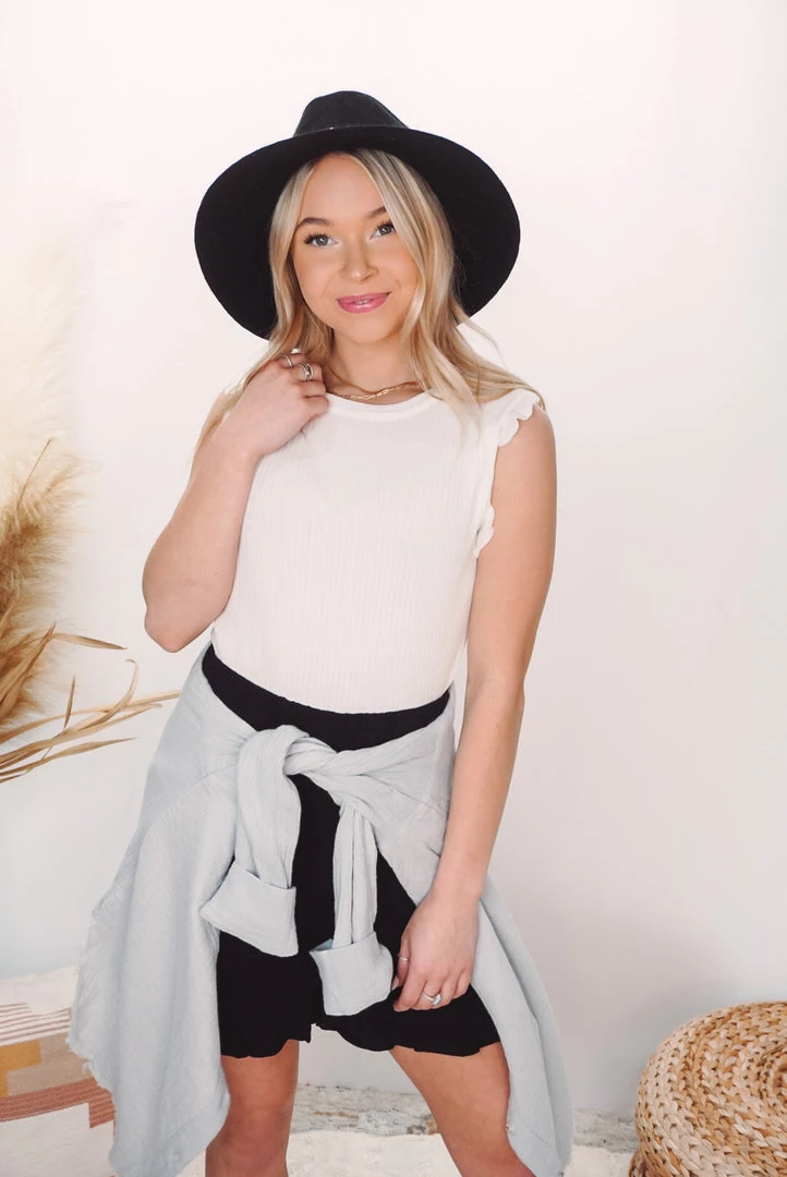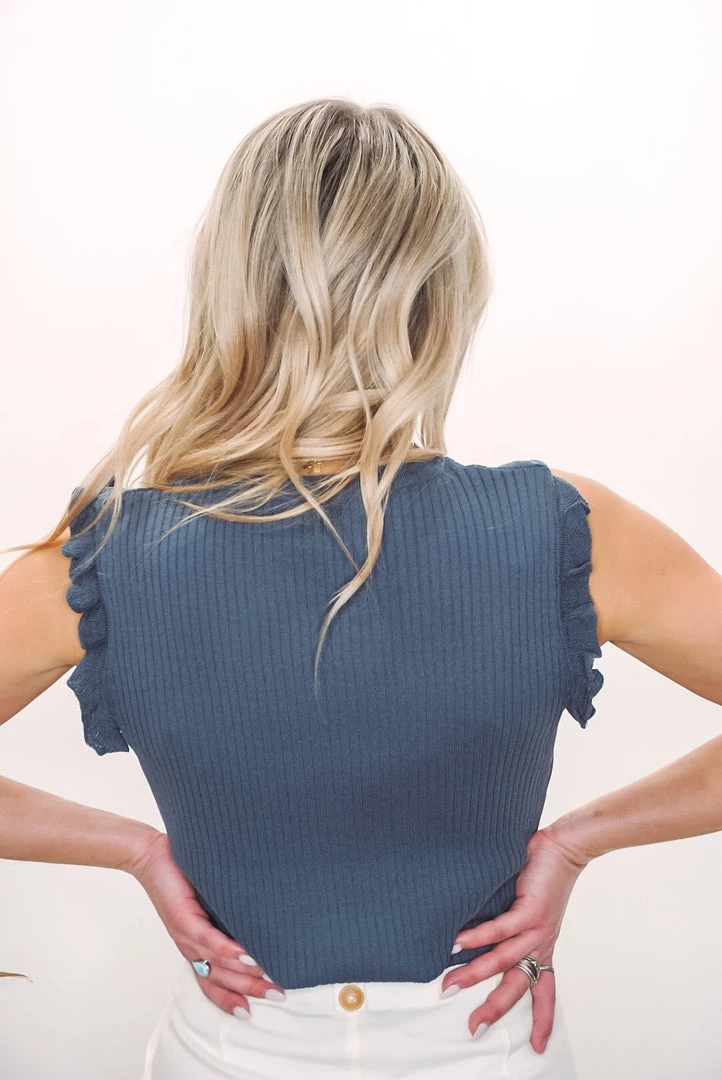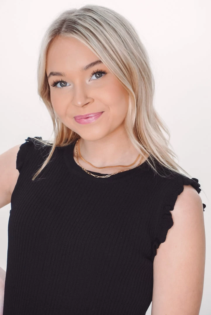 This sleeveless top makes a statement with ruffles and a high neckline. She’s comfortable for all day wear, has a figure-flattering fit and features the cutest ruffle details. Style effortlessly with jeans or tuck it into high-rise shorts.