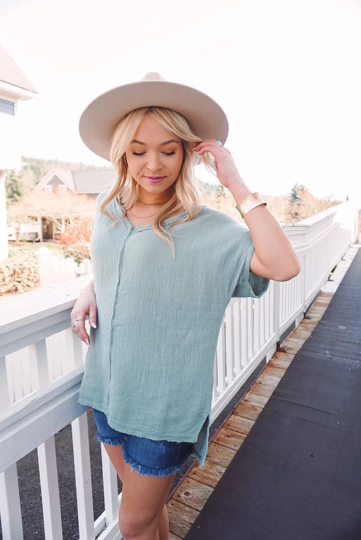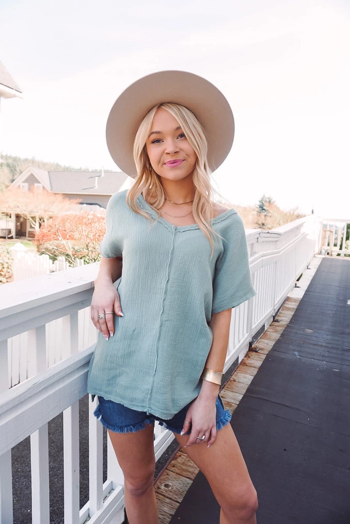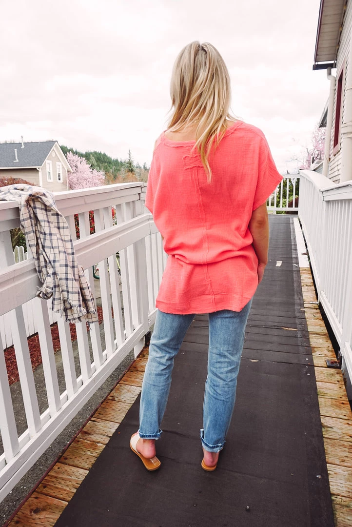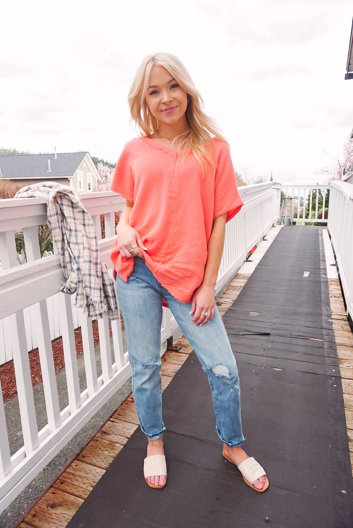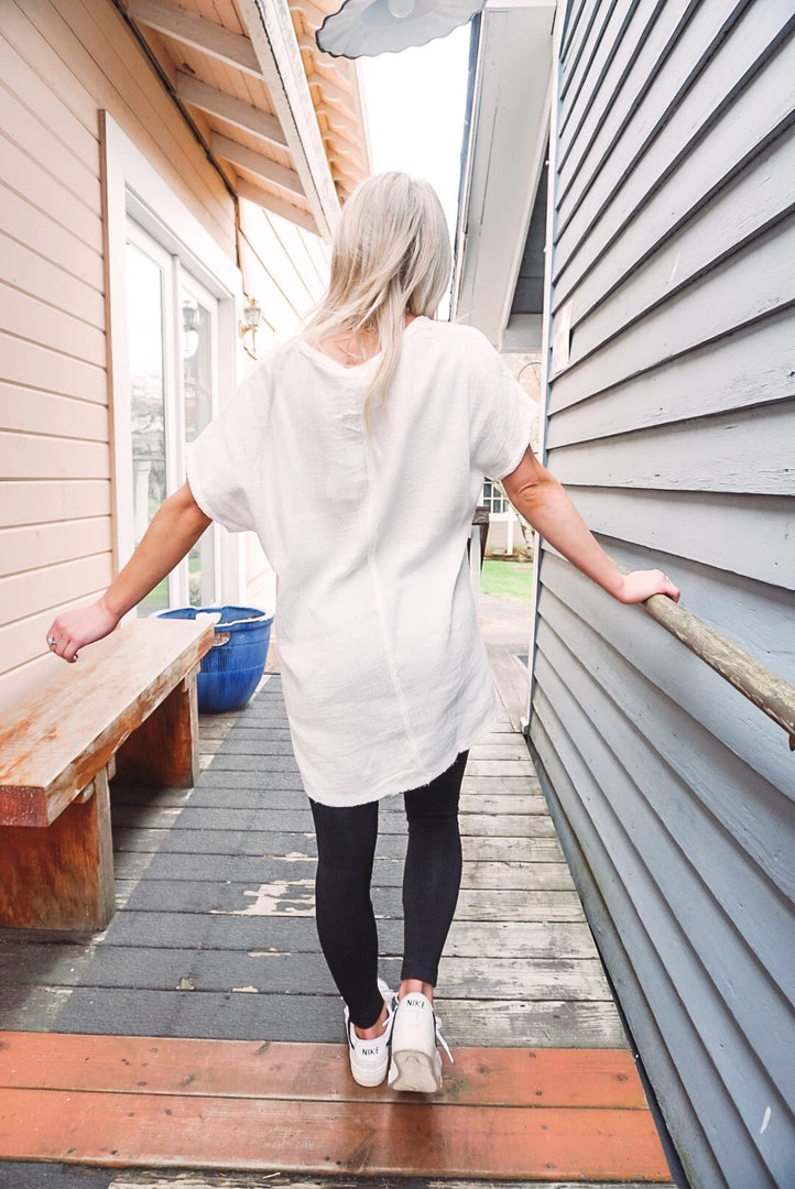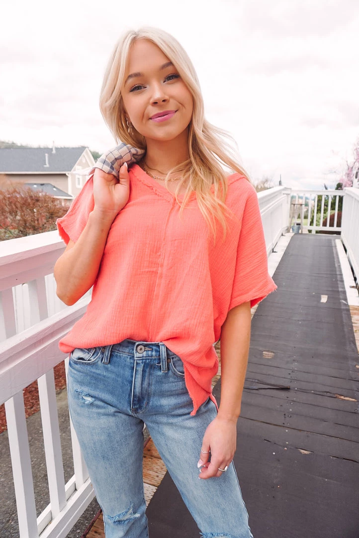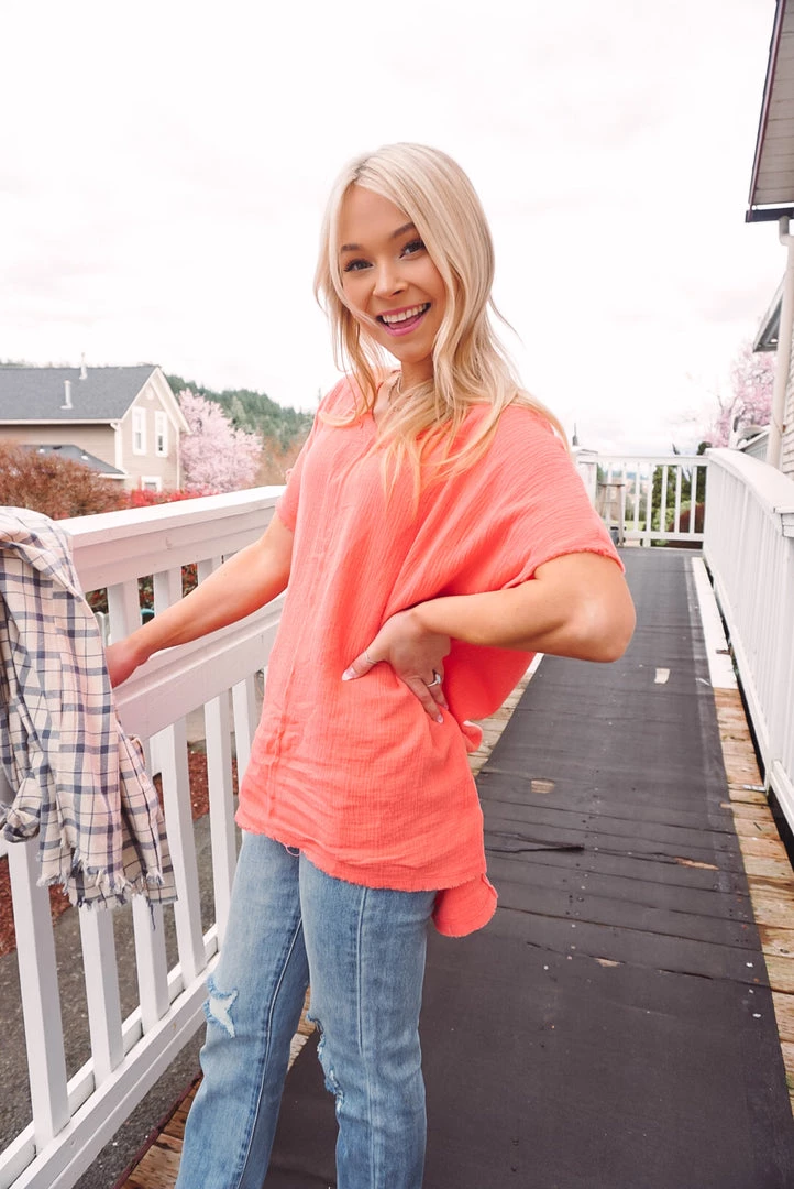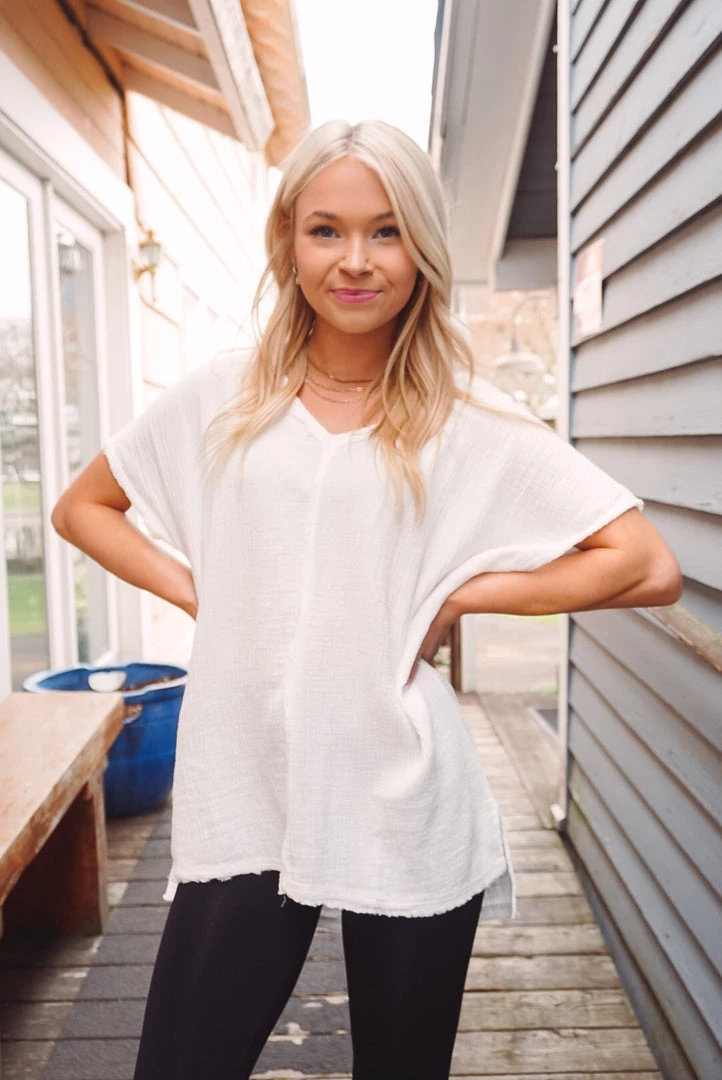 Easy & breezy! We love the Summery Vibes V for so many reasons. Featuring a V-neckline, soft cotton gauze feel, raw edge details, side slits at the bottom and high-low bottom hem. Wear tucked in or left out with your favorite bottoms for an effortless wear!