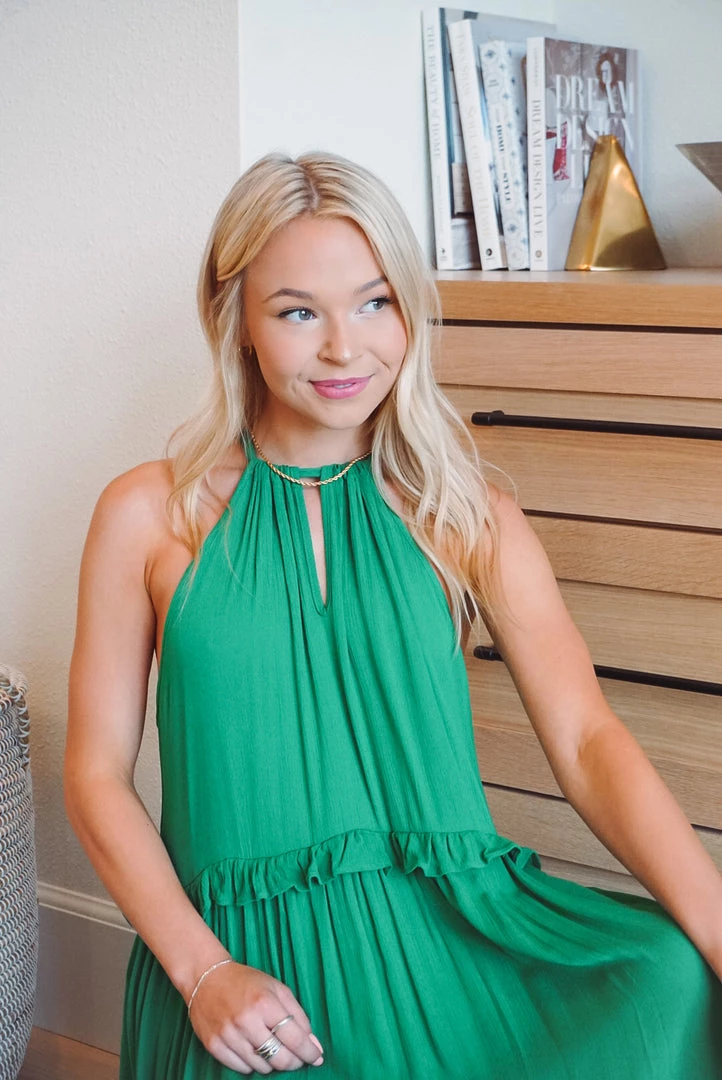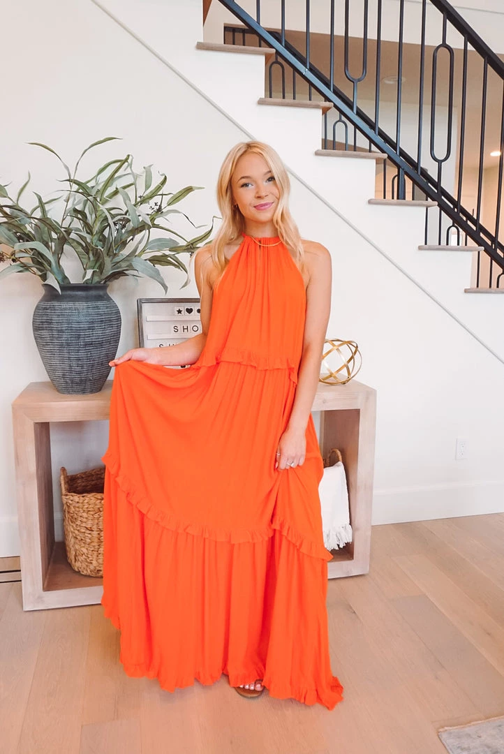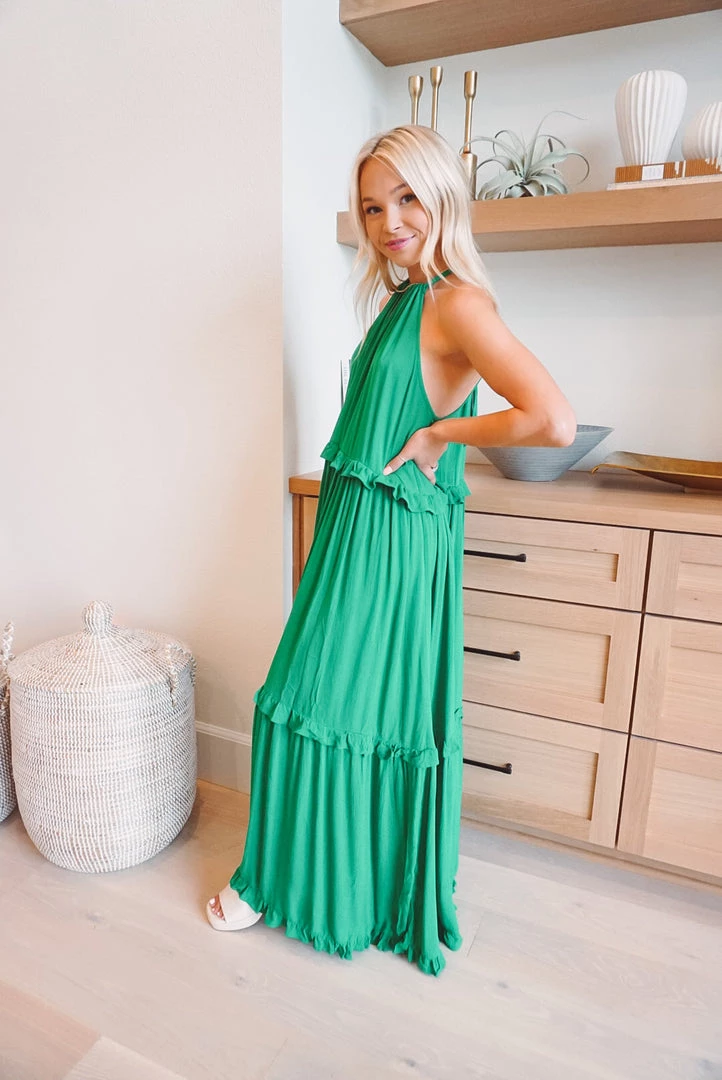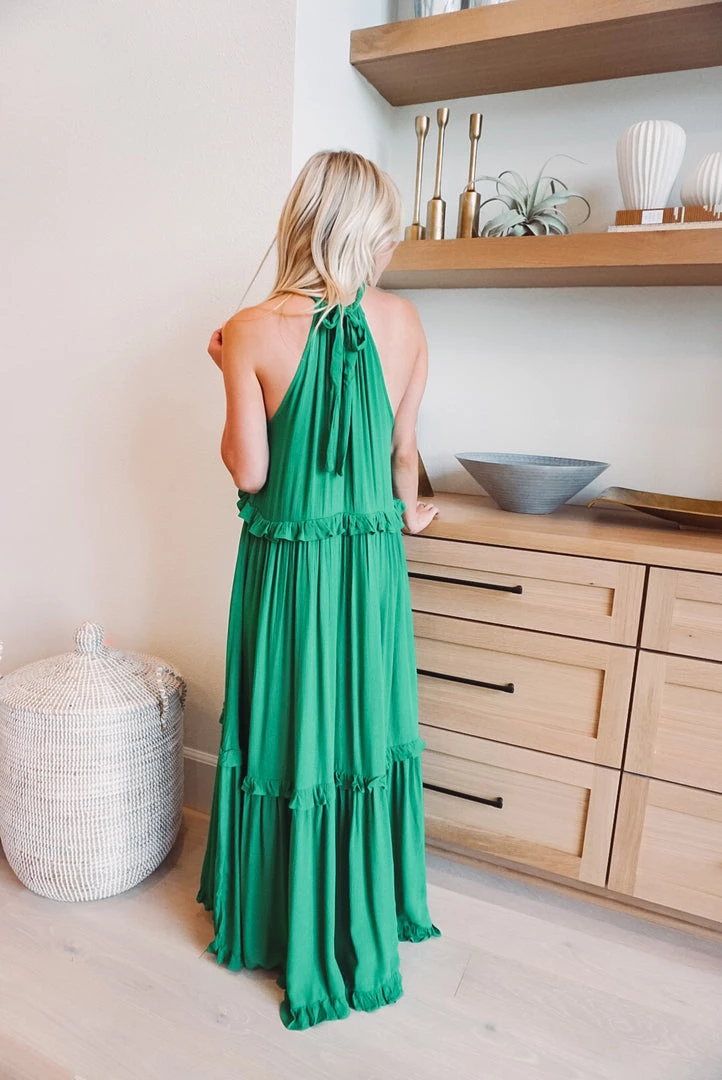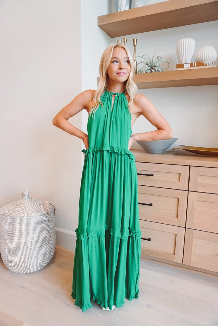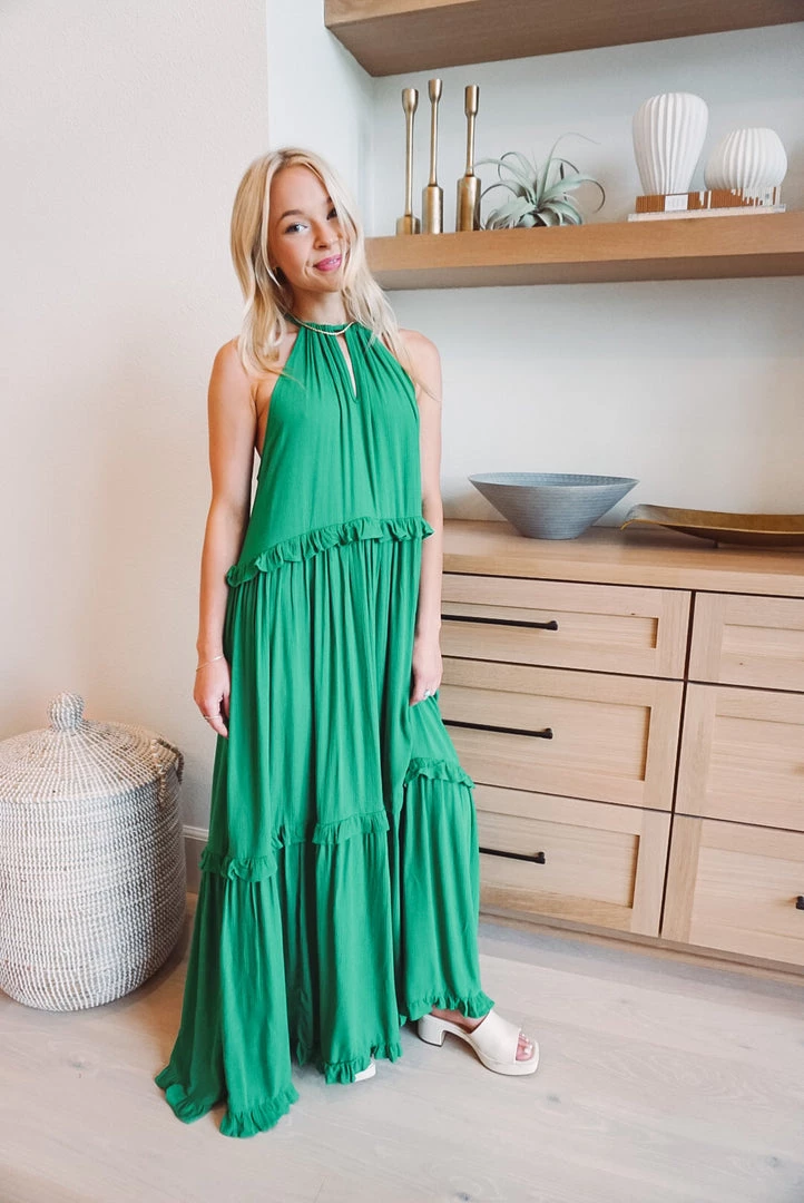Take on summer in this stunning maxi dress! The Bottega Dress features a tiered ruffle skirt, keyhole halter neckline, tie back detailing, relaxed fit, and a soft lightweight feel. Available in 2 vibrant colors perfect for summer!
