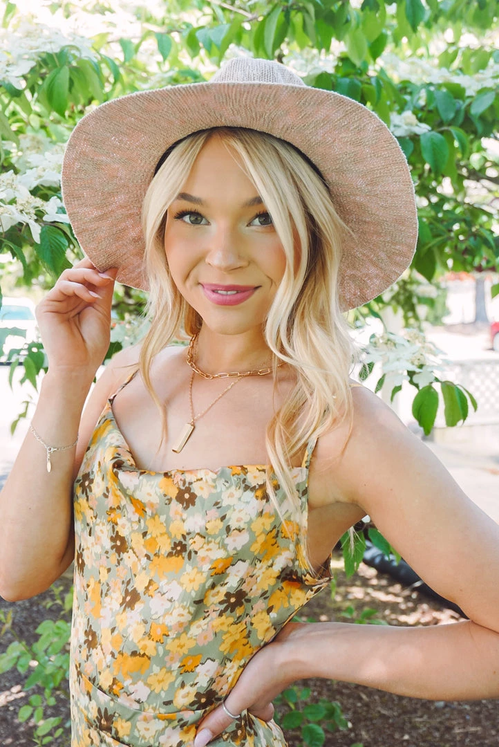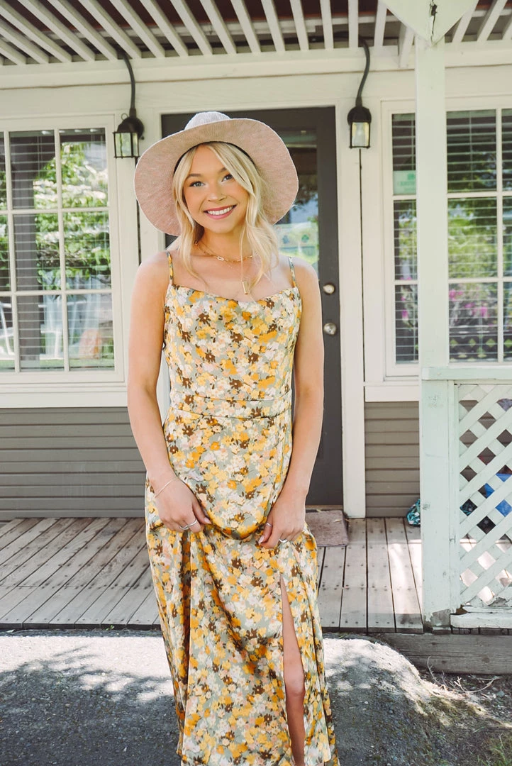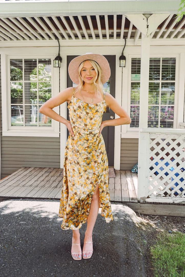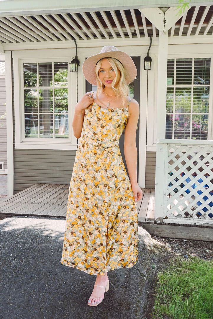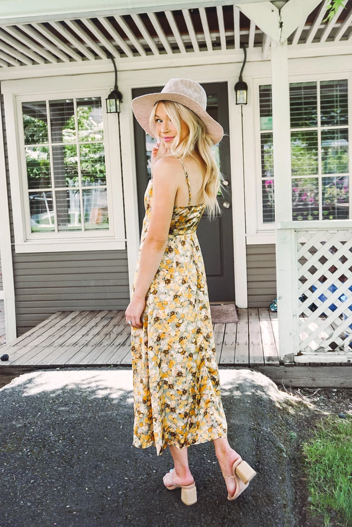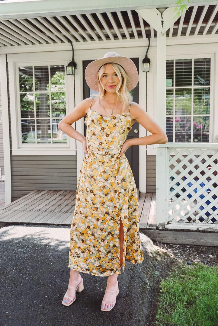 How stunning is this dress? The Tea Time Dress features a midi length, rounded neckline, adjustable cami straps, side slit detailing, back zipper closure, sheen floral print, and a fitted silhouette. Pair with heels or sandals for the perfect ‘dressed up’ summer style!