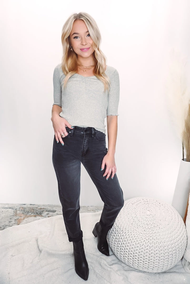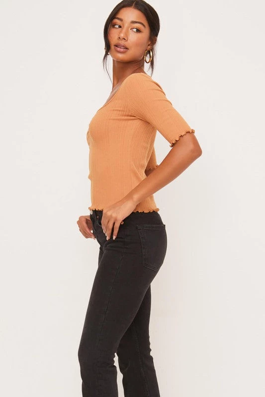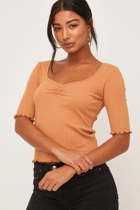 A simple top with a darling cinched detail and lettuce trim. The Kaya Top features a lightweight ribbed knit, fitted bodice, short sleeves, and lettuce edge detailing. Layer this top under cardigans and jackets for a easy-to-wear & casual style.
