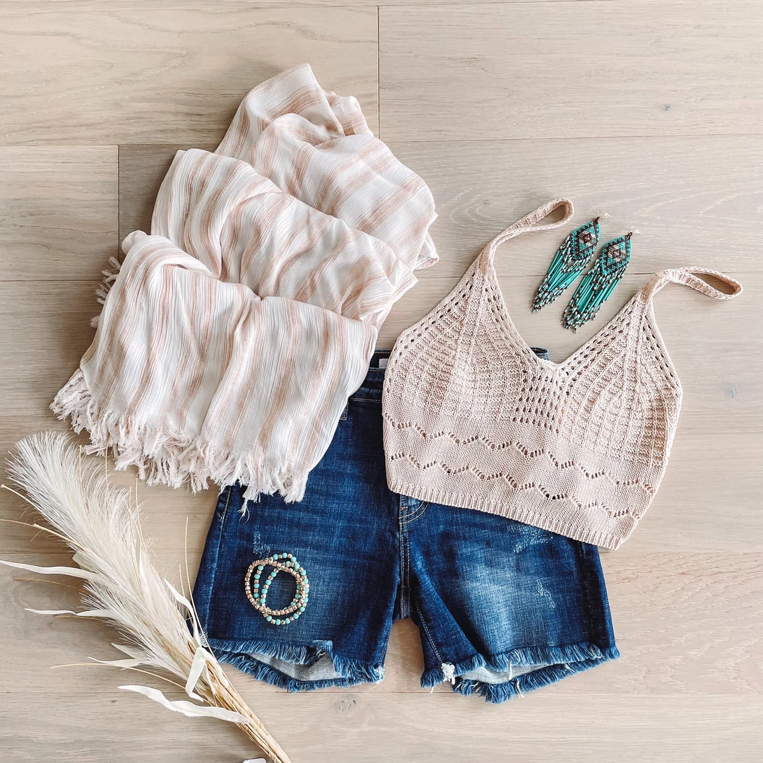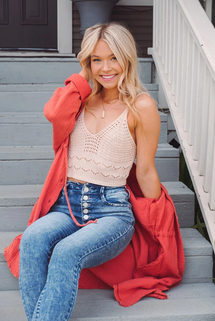 How cute is this little knit tank? Featuring a crochet detailing, v neckline, cropped length, cami straps, and a fitted silhouette. Pair with your favorite high-waisted bottoms for a fun summer style!