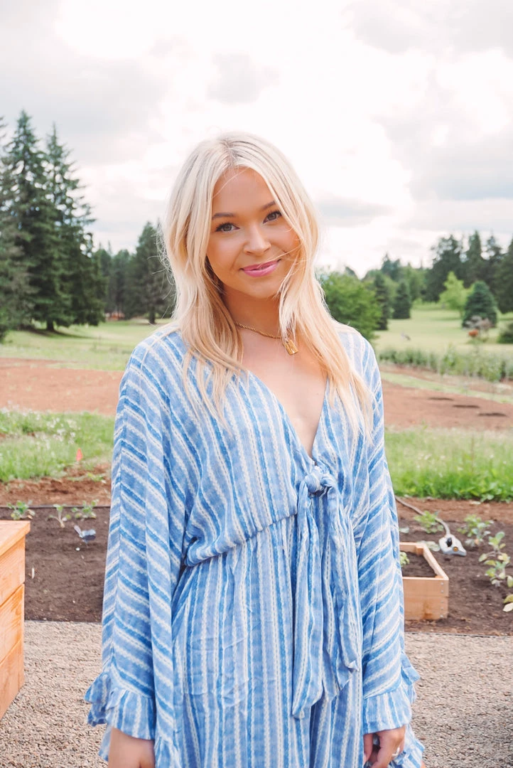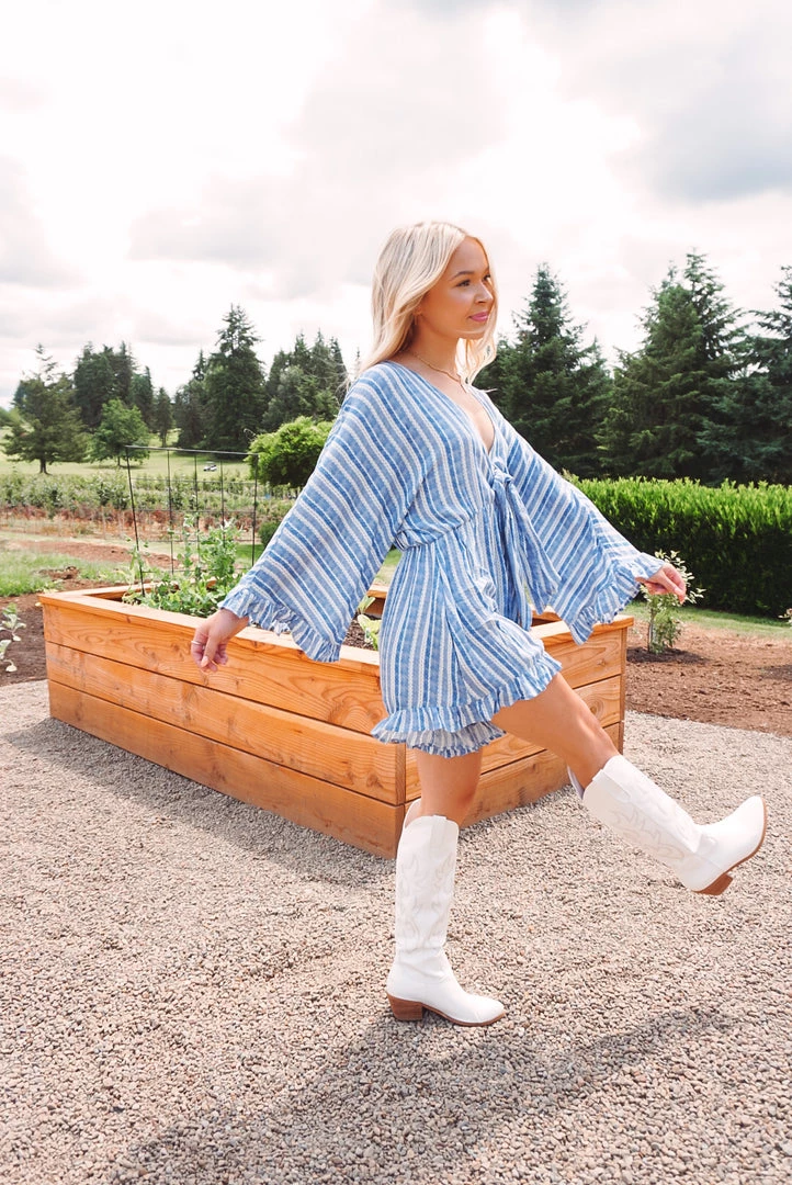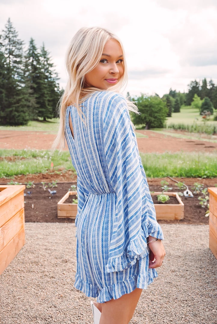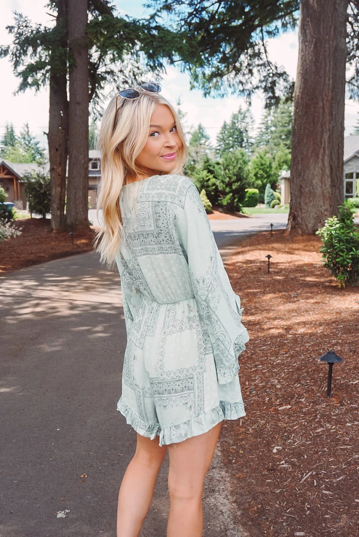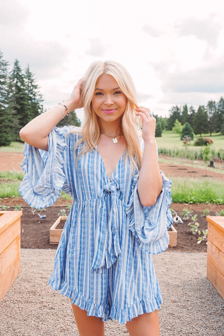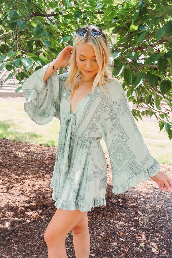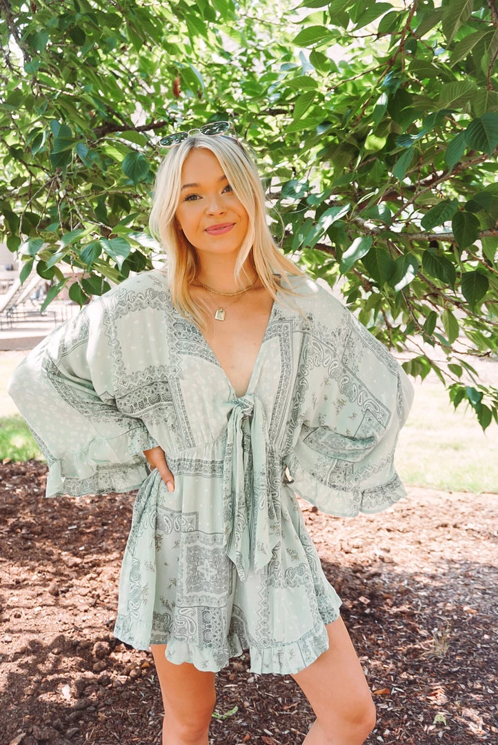 How cute is this little romper? Available in 2 colors, this romper features a v neckline, tie front detailing, ruffle trim accents, long bell sleeves, side pockets, key hole back, and a relaxed silhouette. Pair with your fa route sandals or sneakers for an easy wear & trendy look!