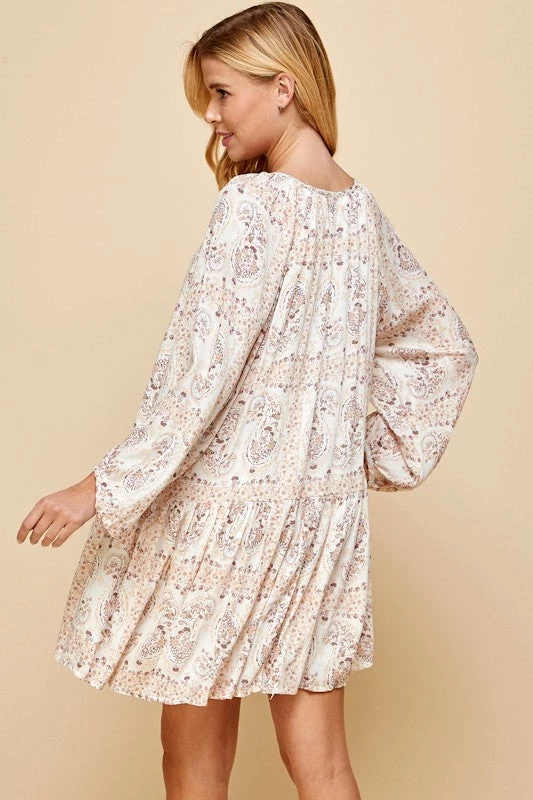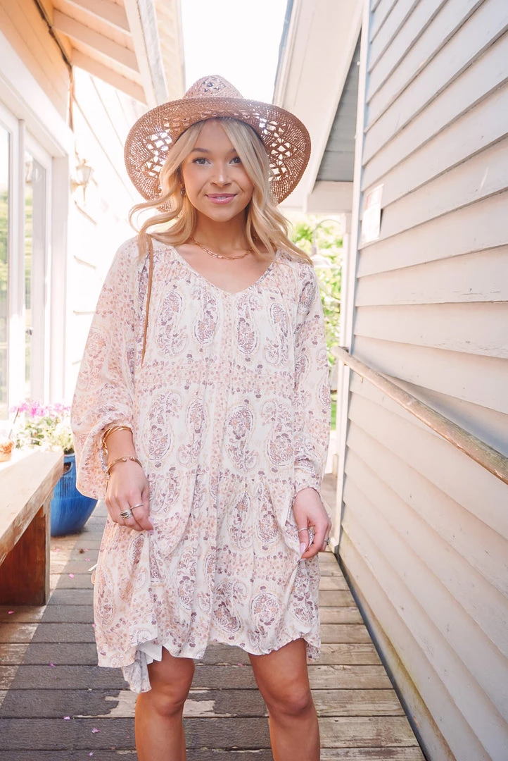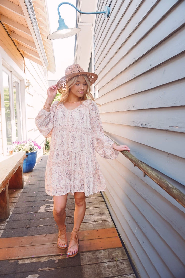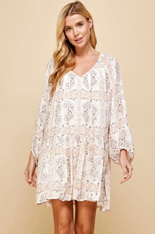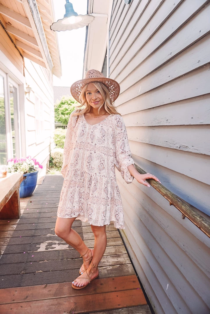 Say hello to the perfect summer dress! Easy to wear & a lightweight, breezy feel. Featuring a relaxed-loose fit, boho print, 3/4 balloon sleeves, thigh length, and v neckline. Pair with sandals or booties for an effortless wear yet stunning boho-inspired look!