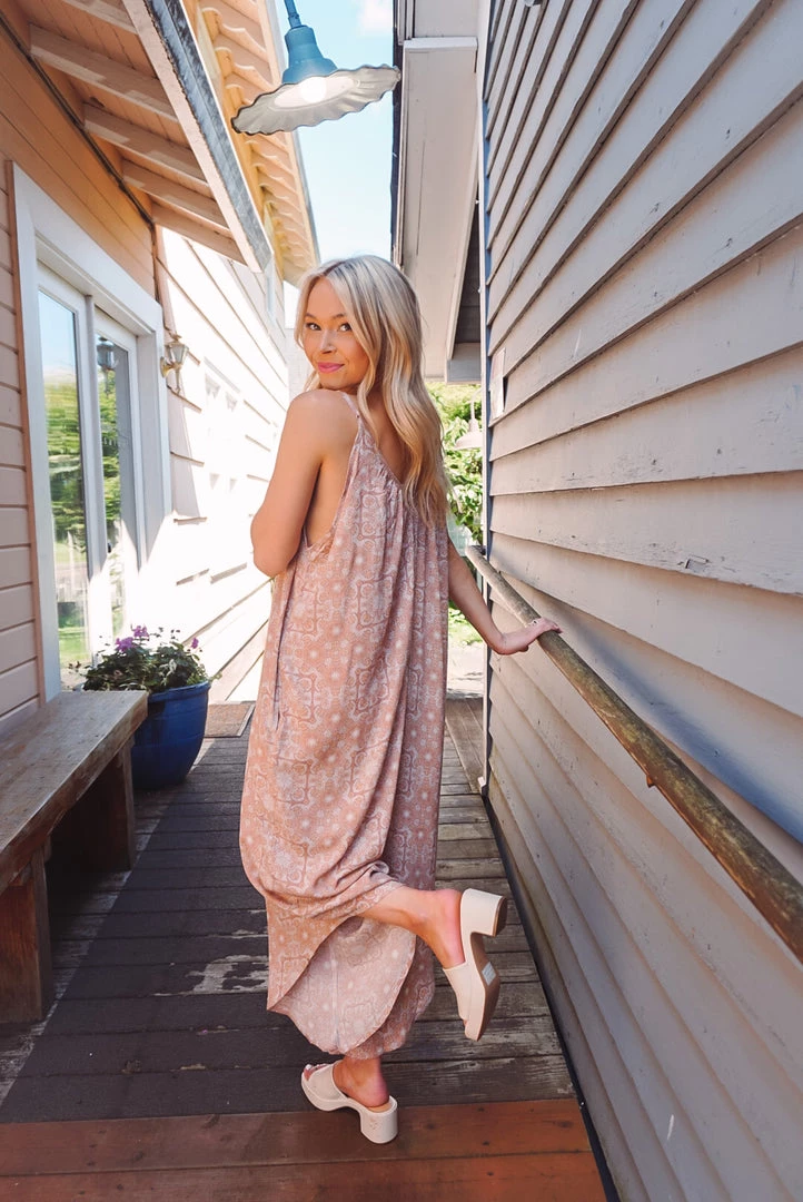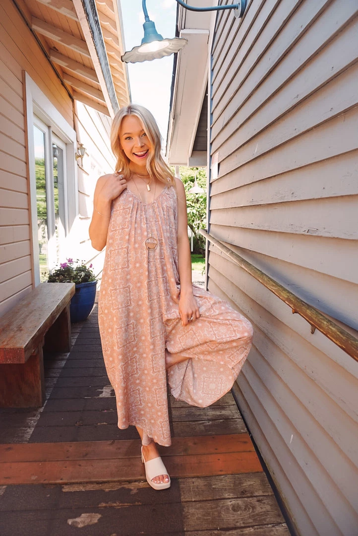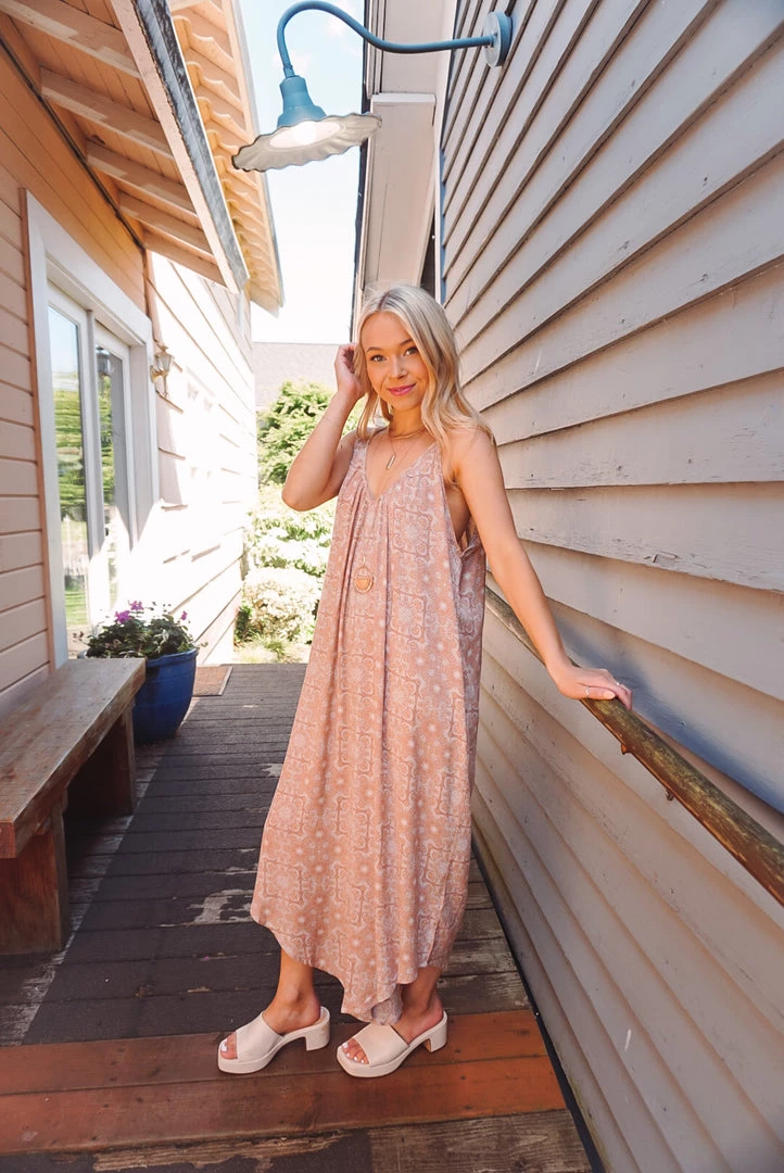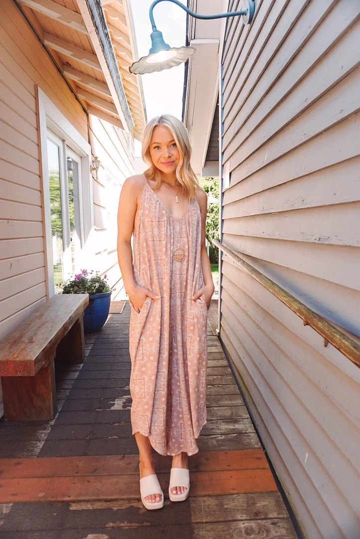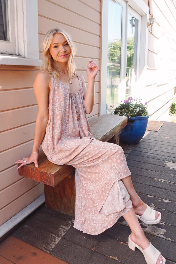 A simple silhouette with a stunning print! Wear this effortless jumpsuit for a comfortable yet cute style. Featuring a scoop neckline, adjustable spaghetti straps, side pockets, cropped length, and a relaxed fit.