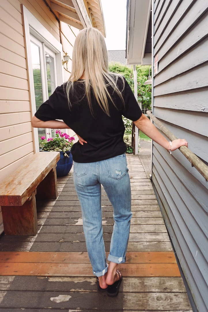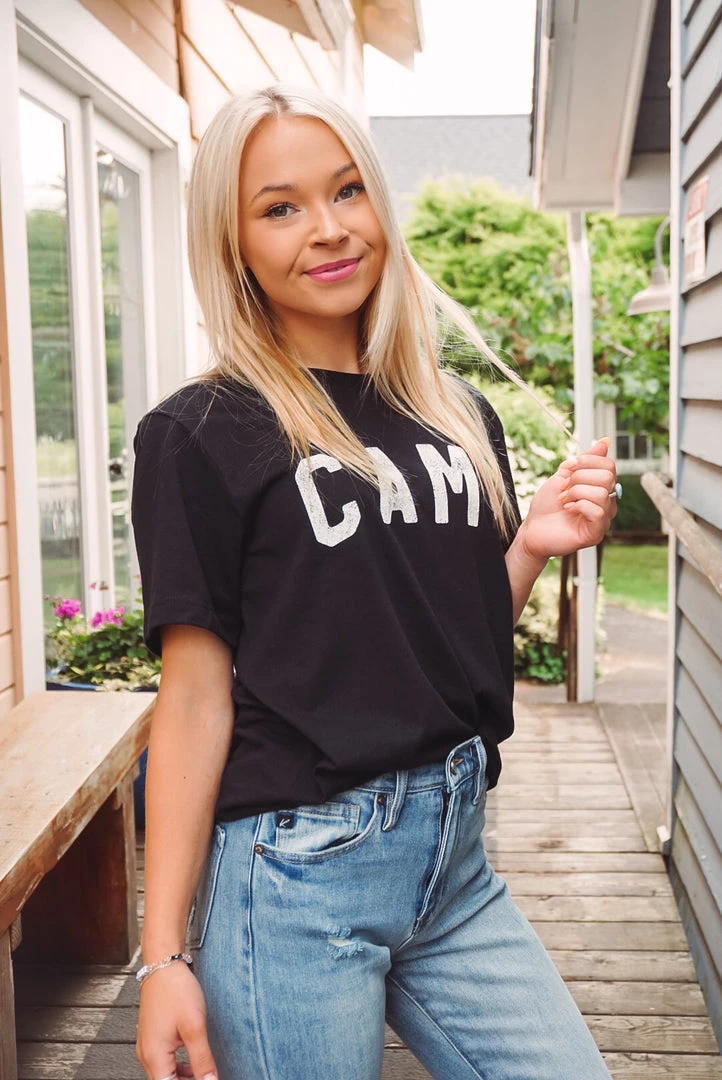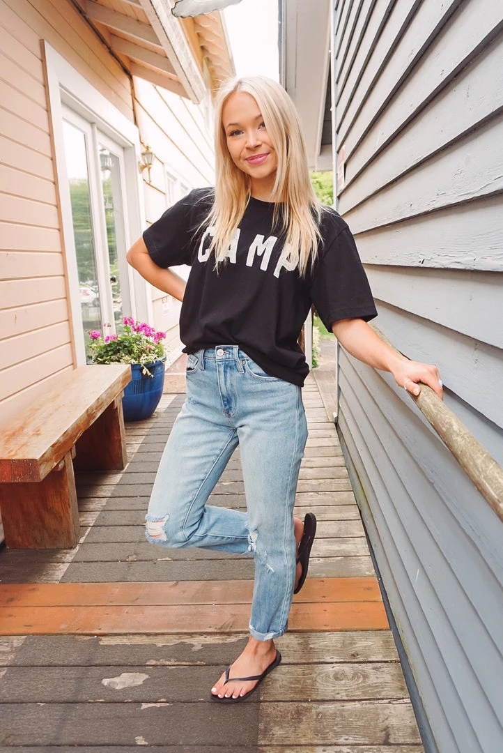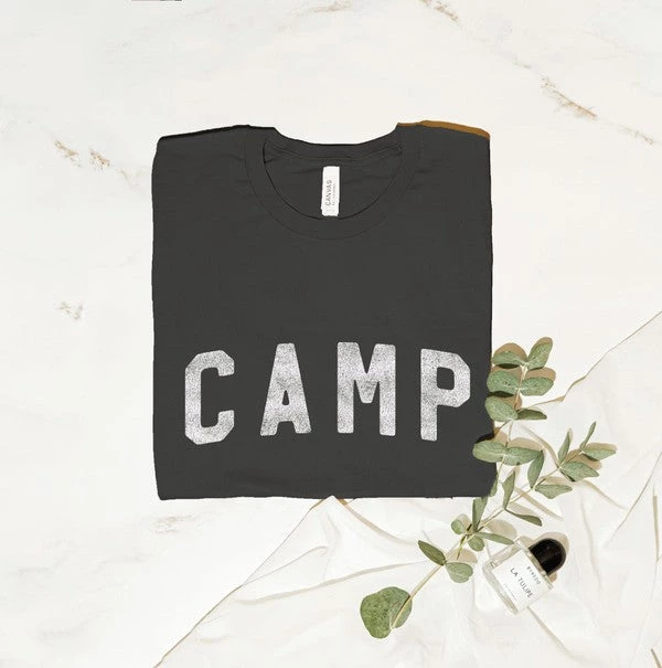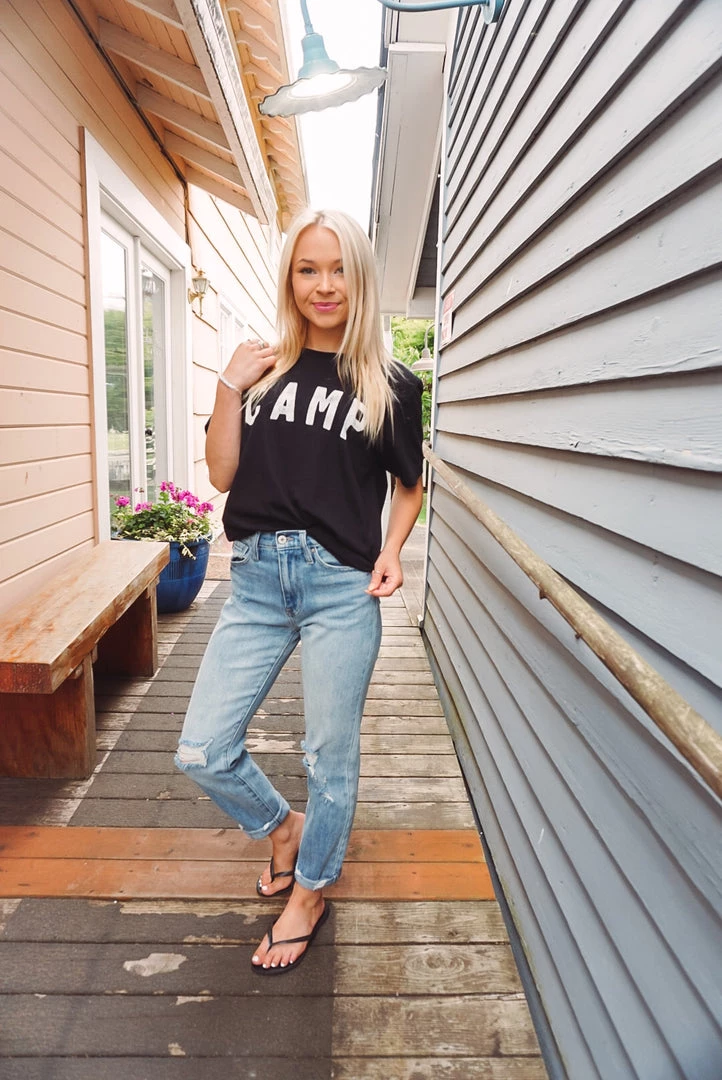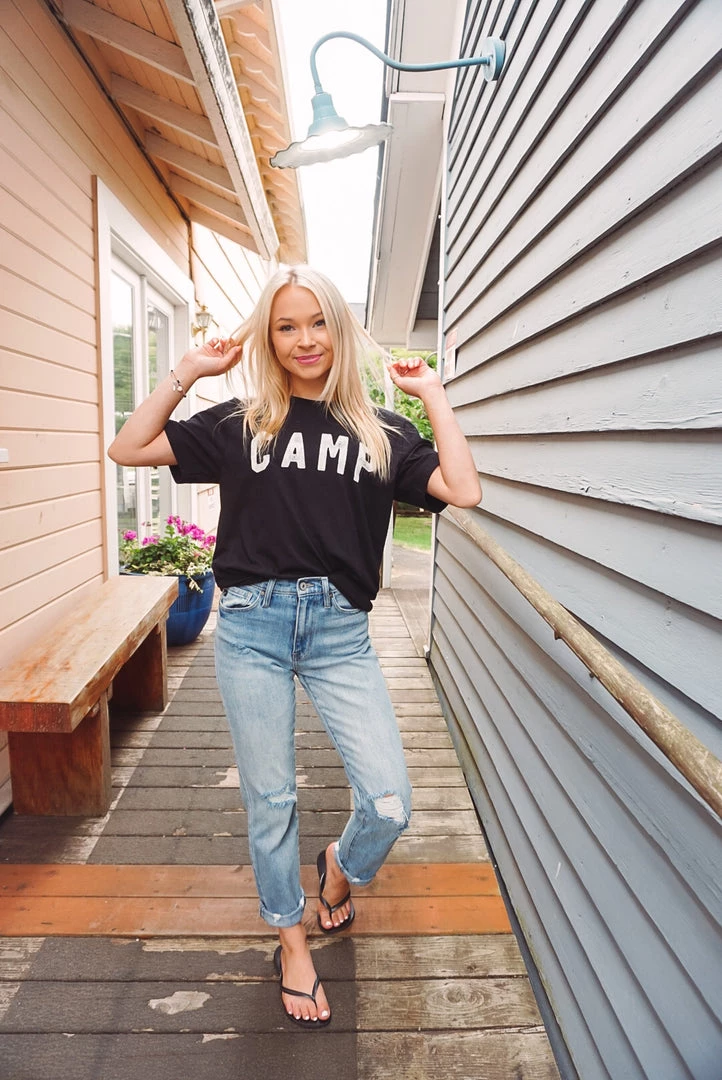 Going camping? Look cute & be comfy in our Camp Tee! Featuring a crew neckline, short sleeves, and a loose-relaxed fit. Throw over a swimsuit or pair with shorts for a perfect camping or summer look!