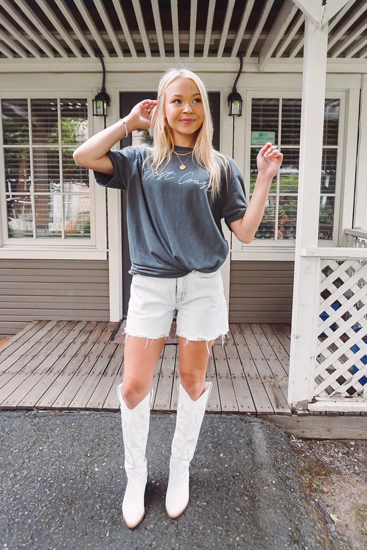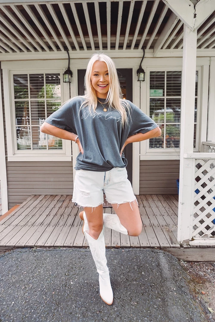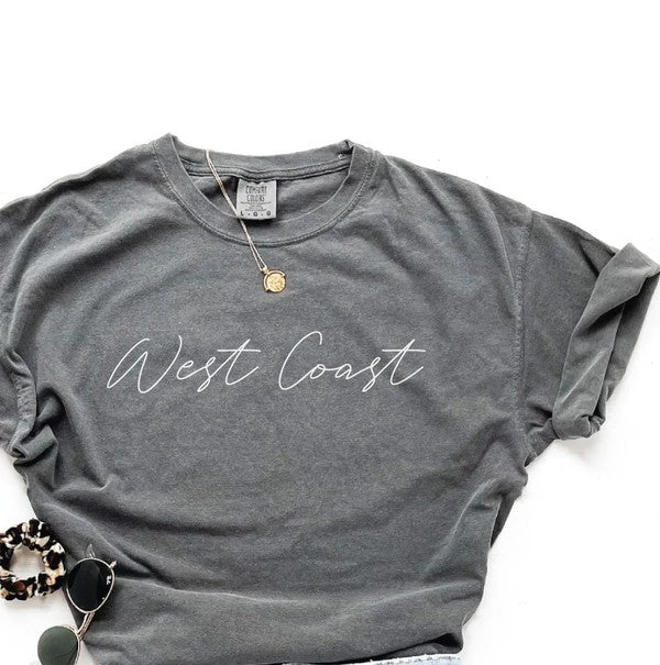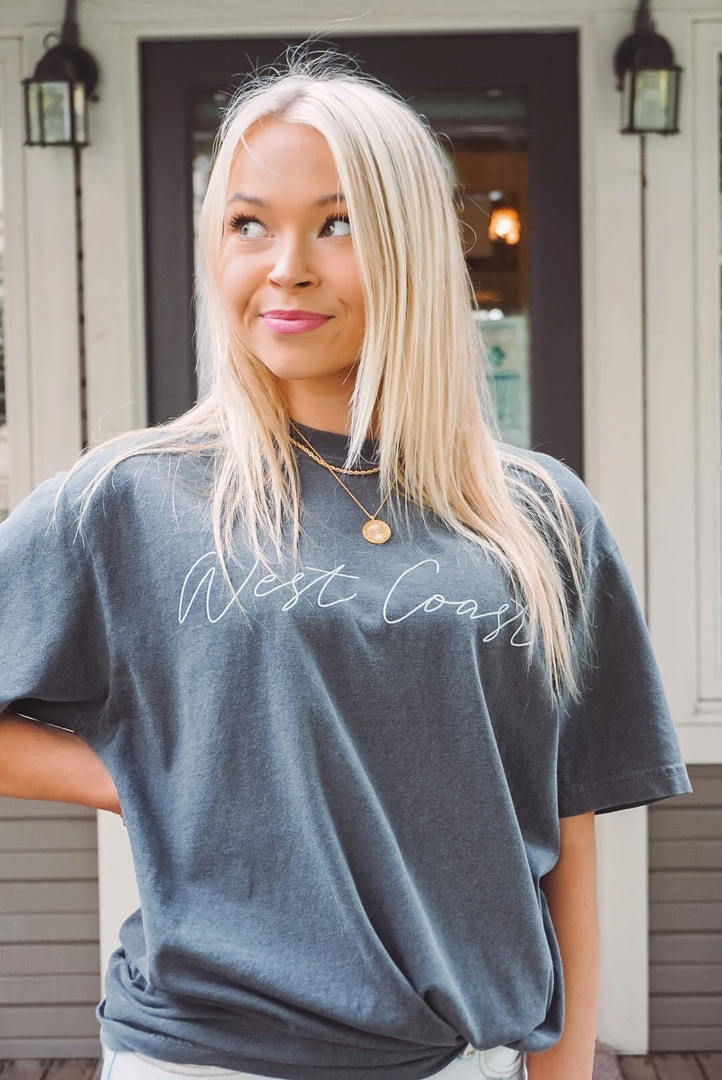 Represent the best coast in this cute cursive graphic tee. Featuring a crew neckline, short sleeves, soft feel in a vintage wash fabric, and a loose-relaxed fit. Layer or wear by itself!