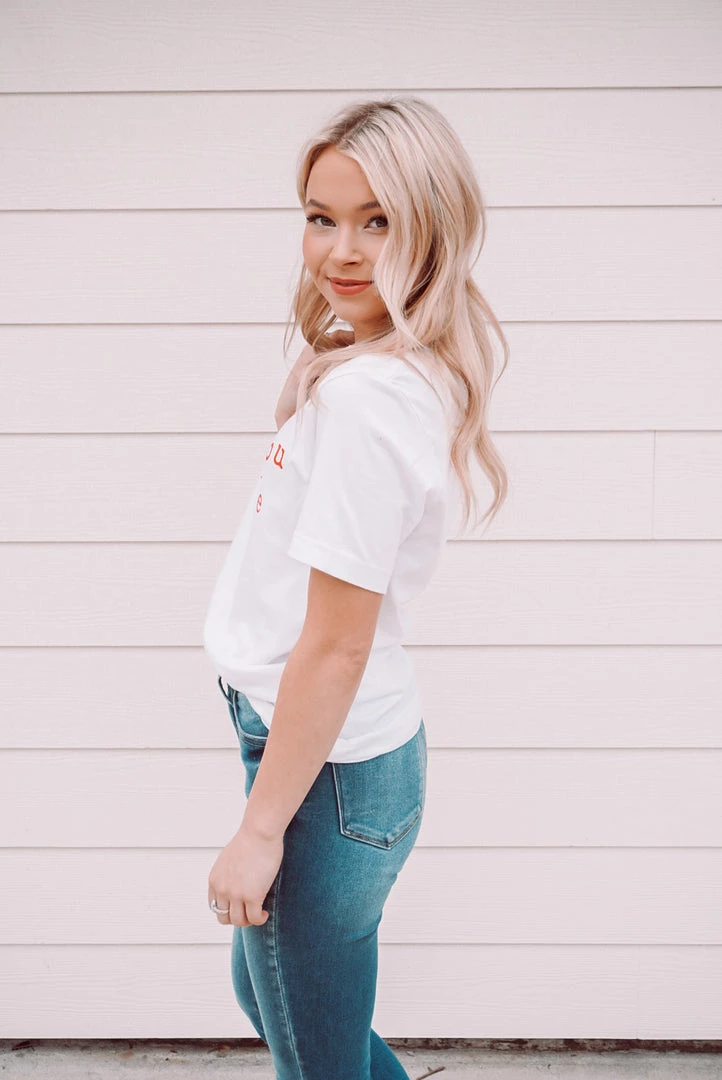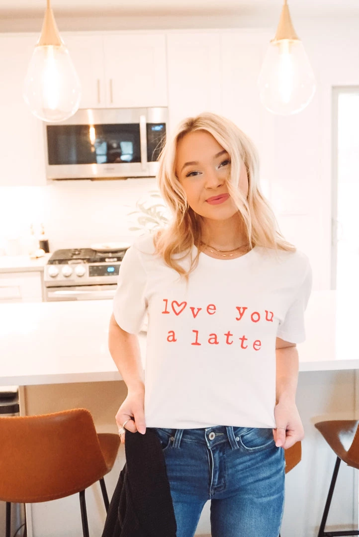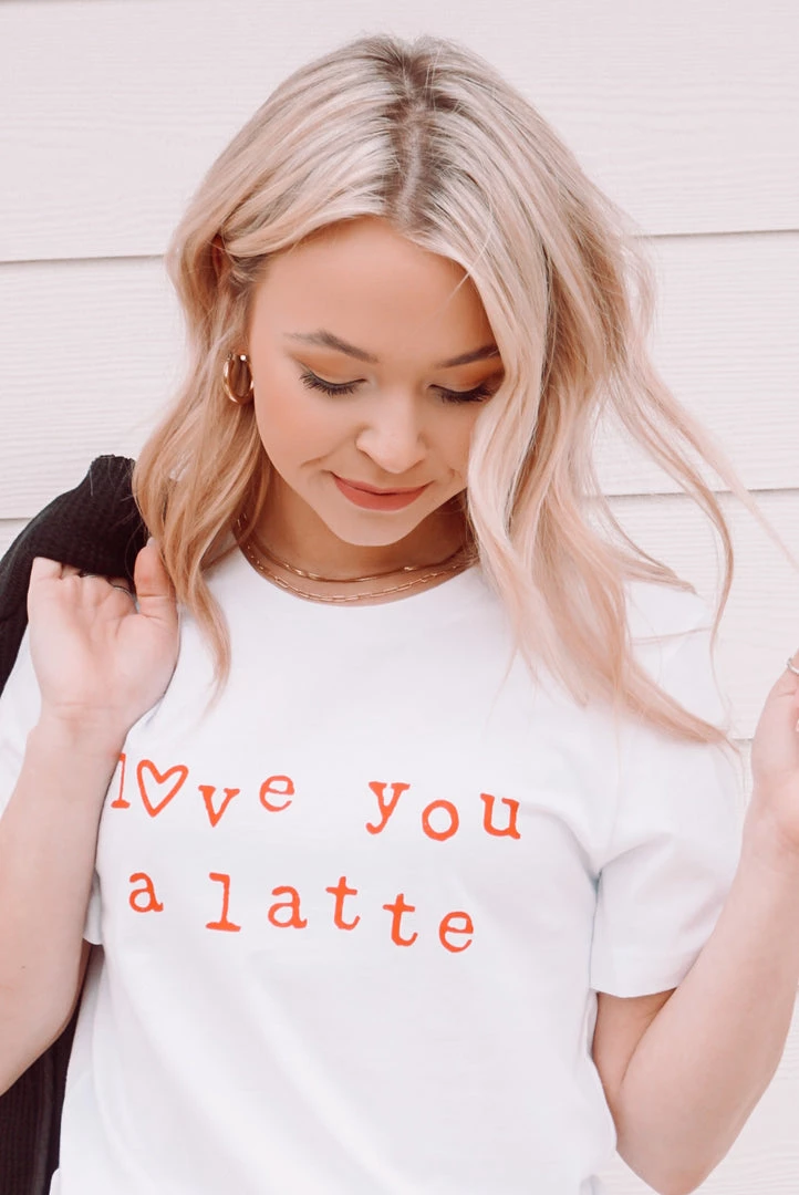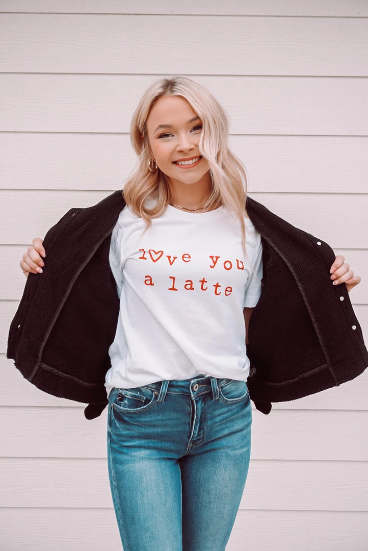 All you need is love & coffee…. This tee features a graphic “ Love You A Latte” text, short sleeves, crew neckline, and a relaxed fit. The perfect top for layering under your favorite jacket or cardigan! Wear tied up, tucked in or left out for a comfortable & versatile style.