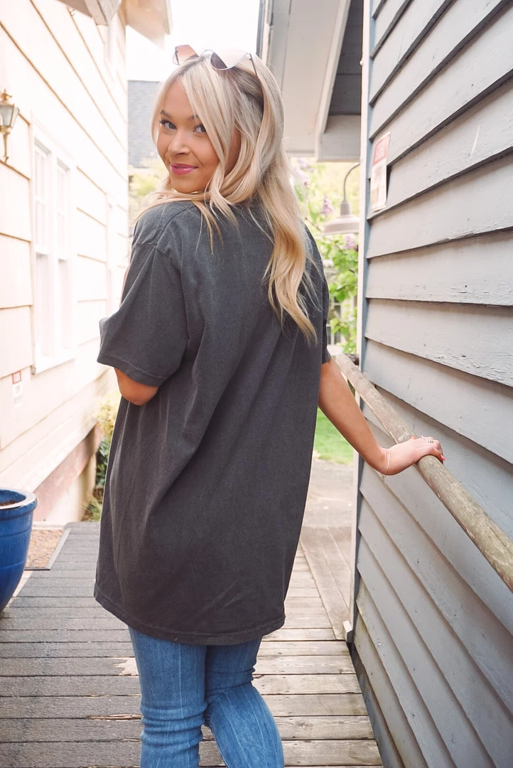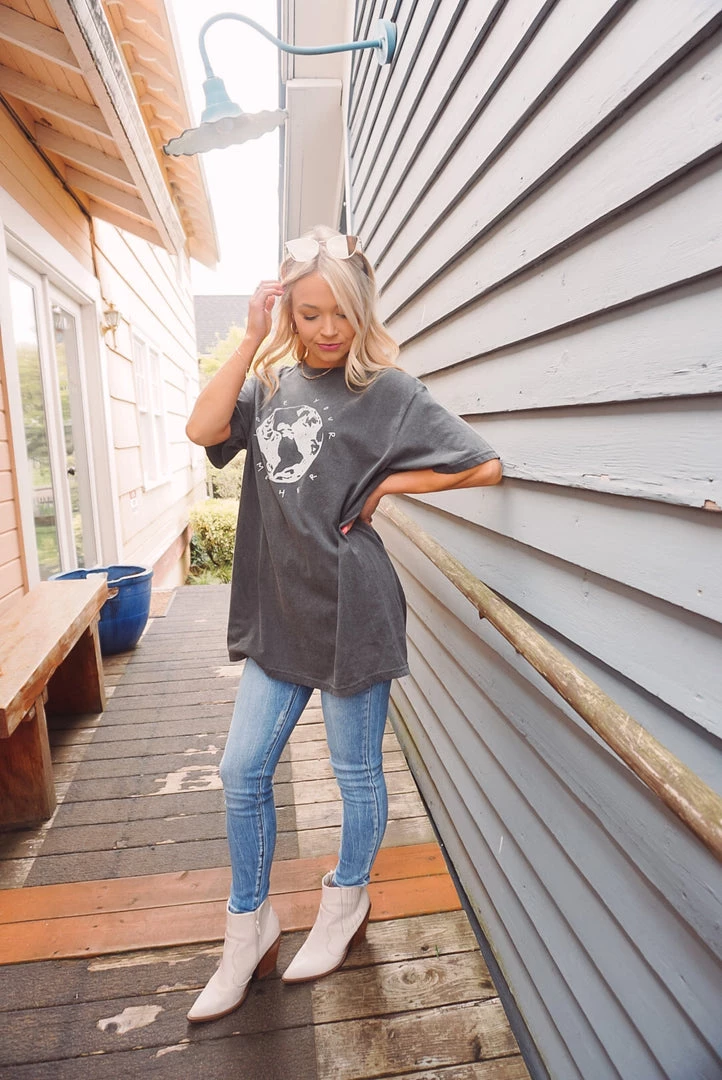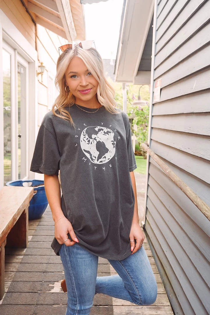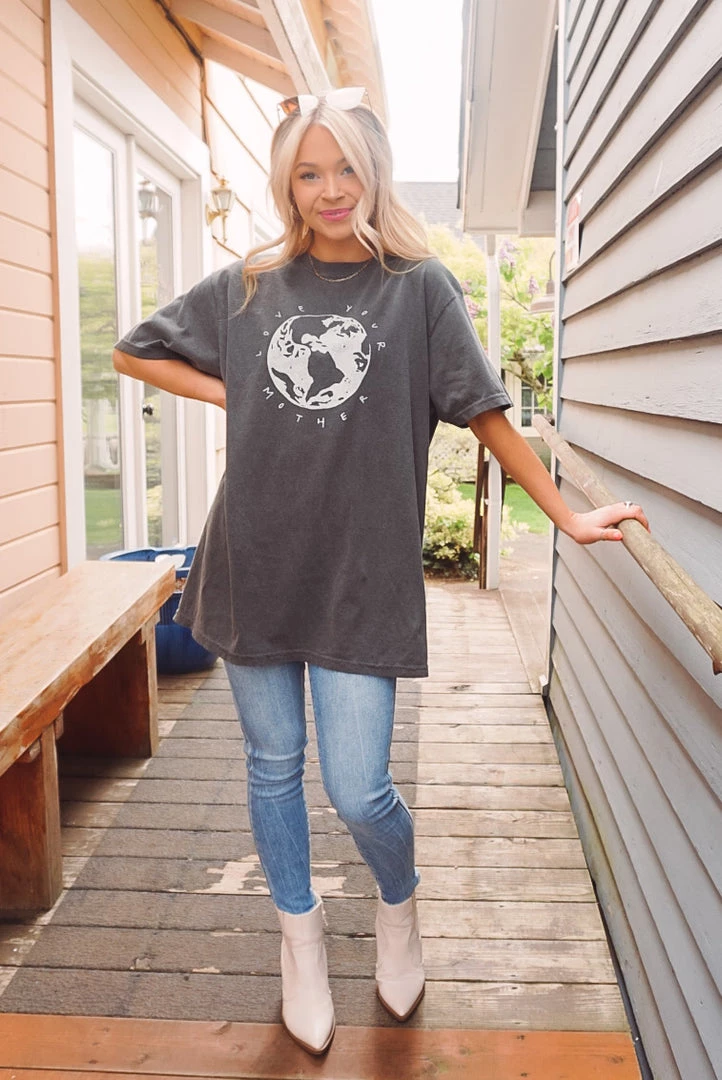 A good message & cute graphic! The Love Your Mother Tee features an earth graphic design, crew neckline, short sleeves, and a relaxed fit. Wear tucked in or tied up for a elevated look- both layered or by itself with your favorite bottoms!