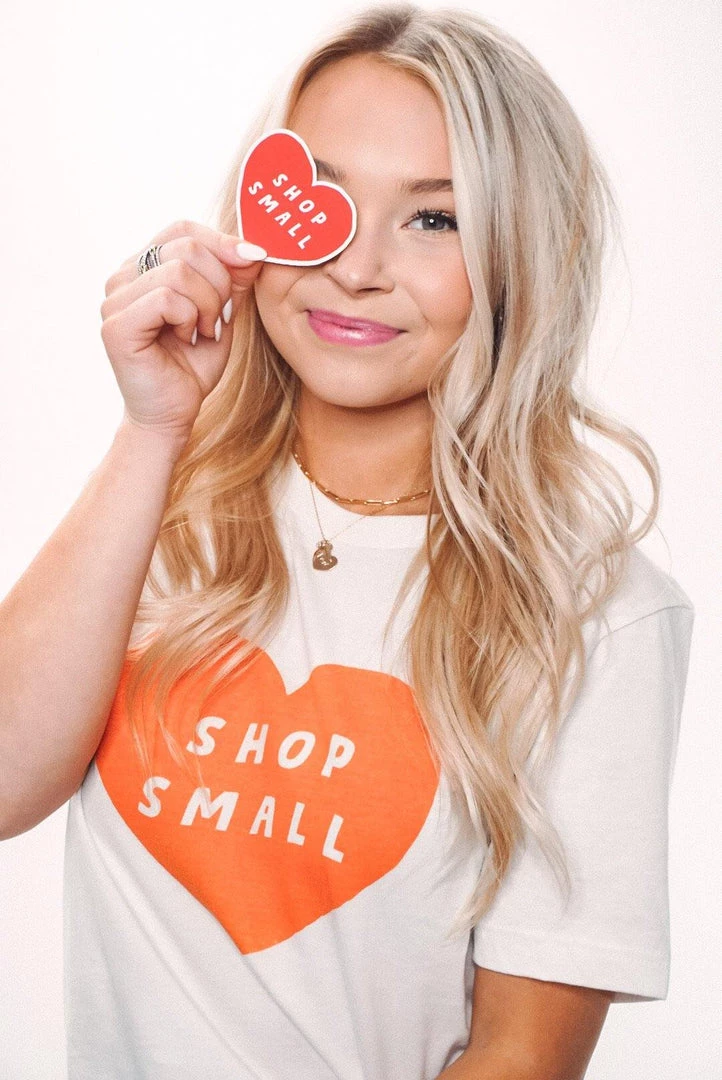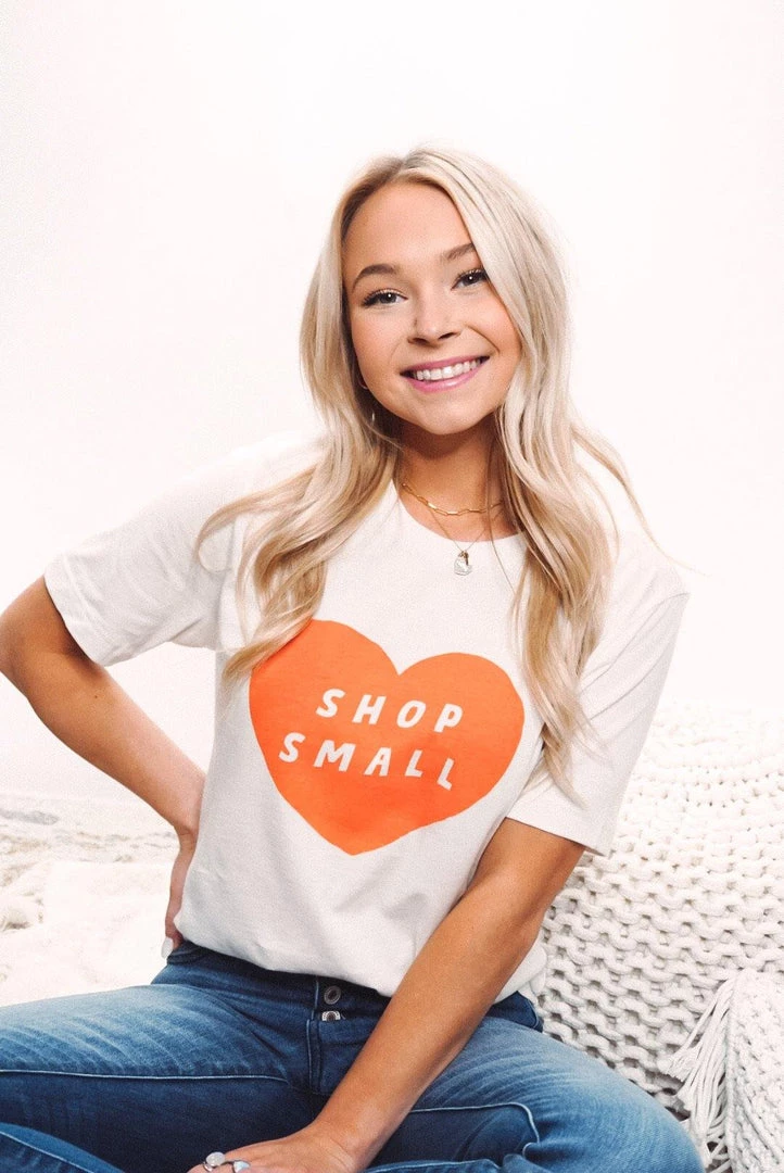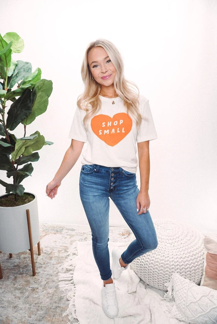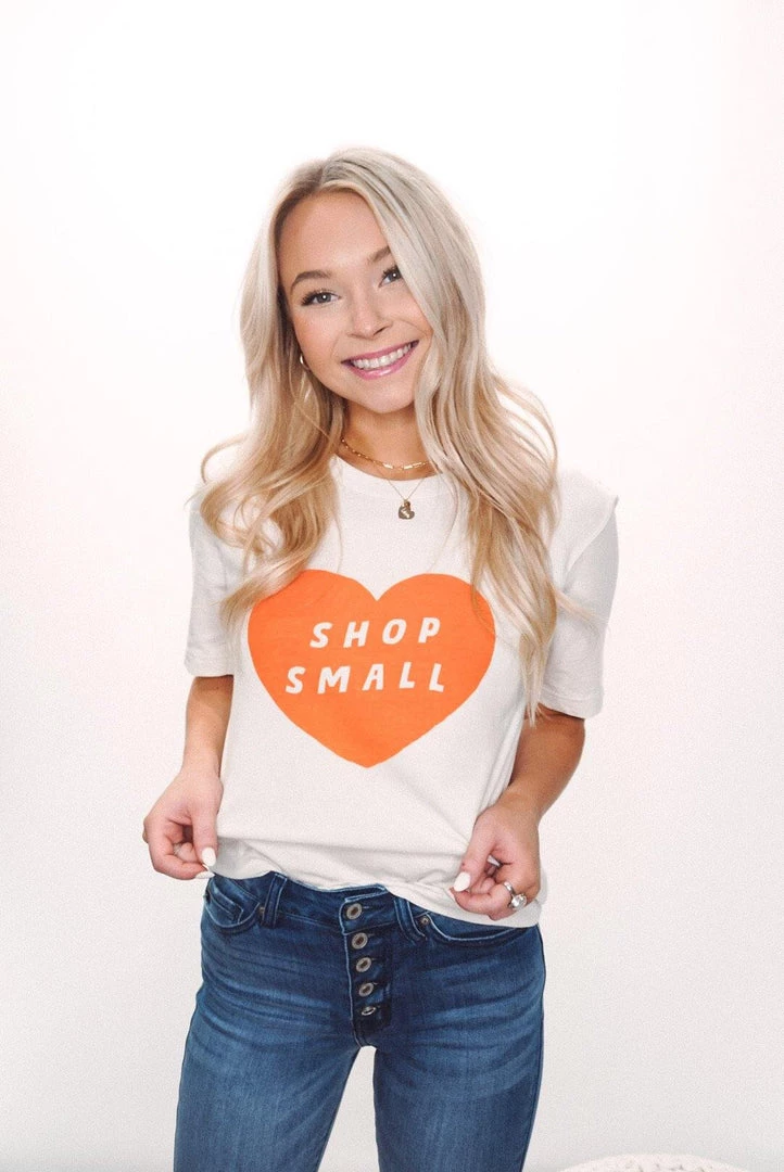 Probably our favorite tee ever… show your live for small businesses with this cute graphic tee! Featuring a relaxed fit, soft cotton fabric, short sleeves, and a cute heart “shop small” graphic! Available in 2 color combos and both pair perfectly with denim or leggings!
