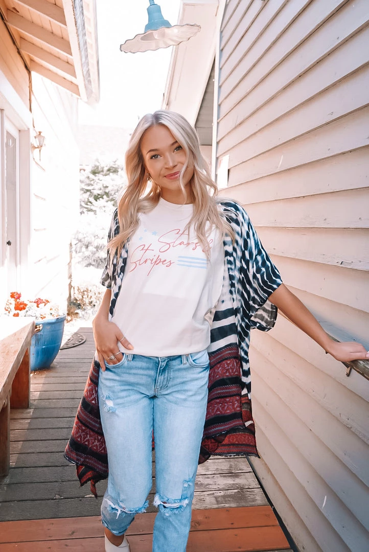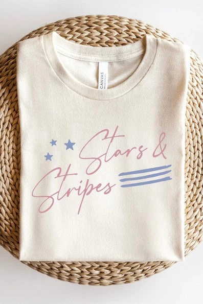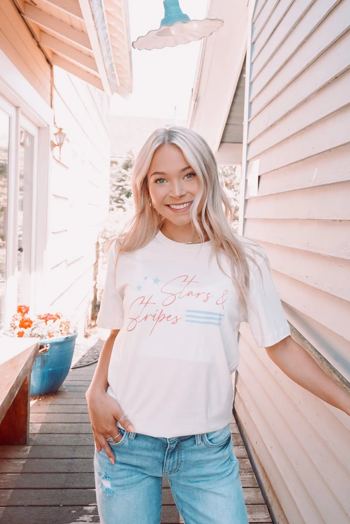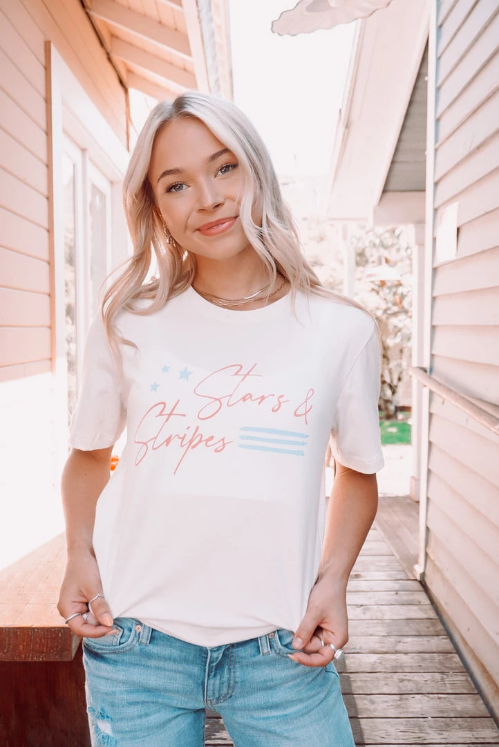 Show your love for our country in this stars & stripes graphic! Featuring a vintage white color, short sleeves, relaxed fit, and a soft feel.