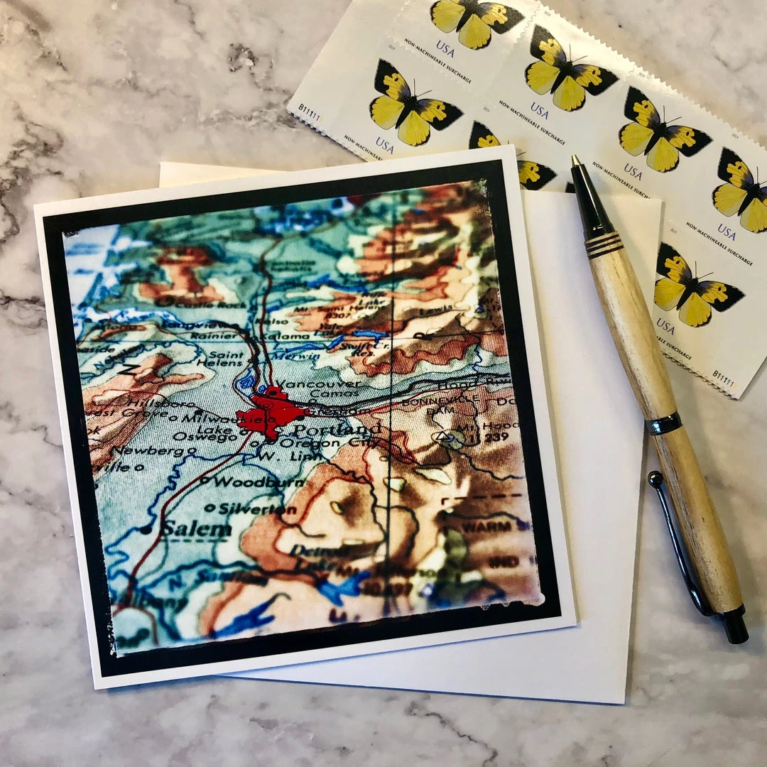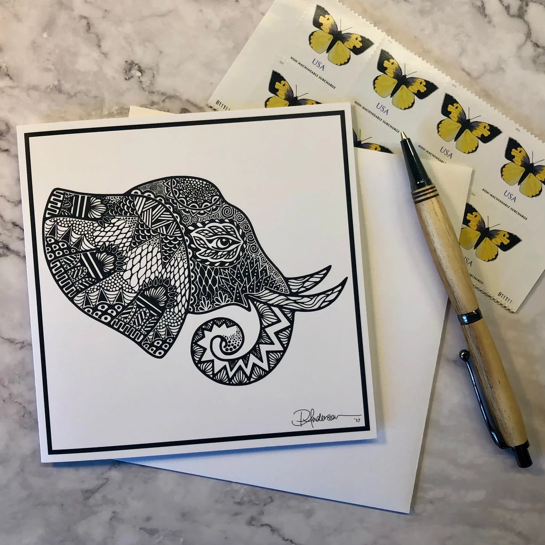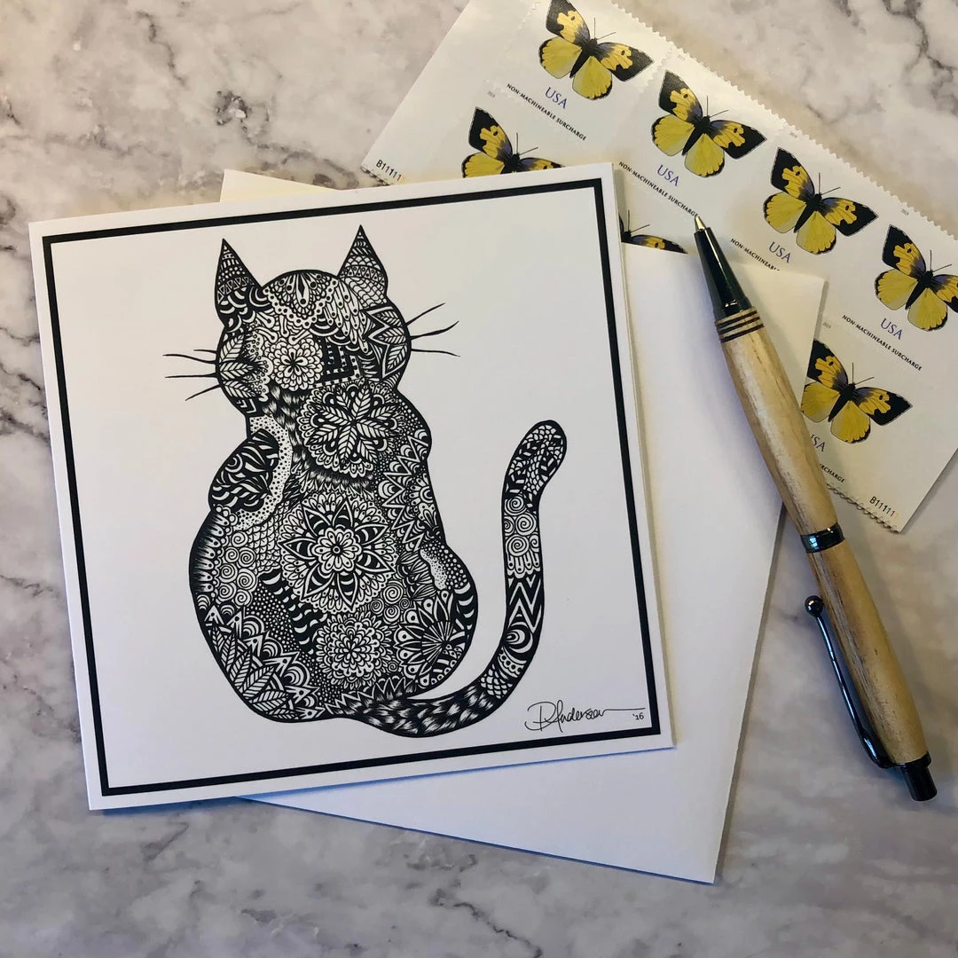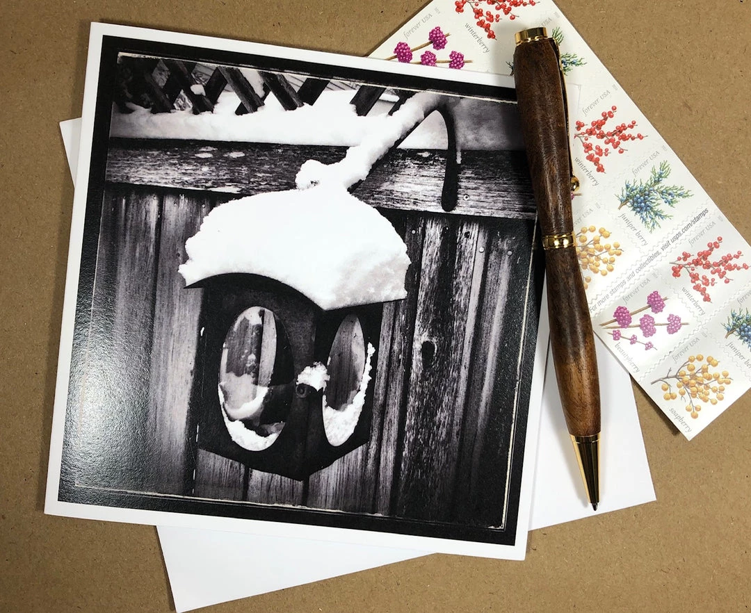 Each card is 5.25” square using 100 lb cougar cover heavy card stock. Envelopes are 5.5” square. Greeting cards are all blank inside.