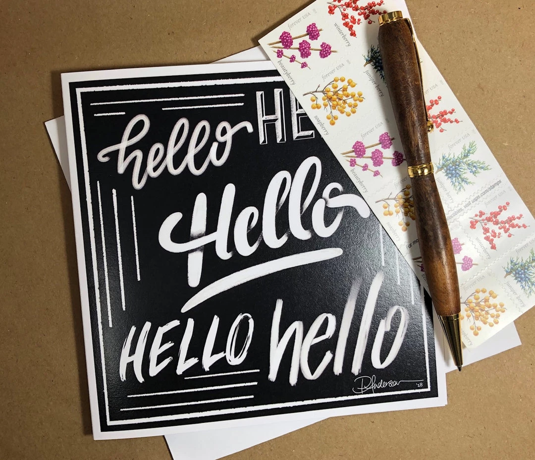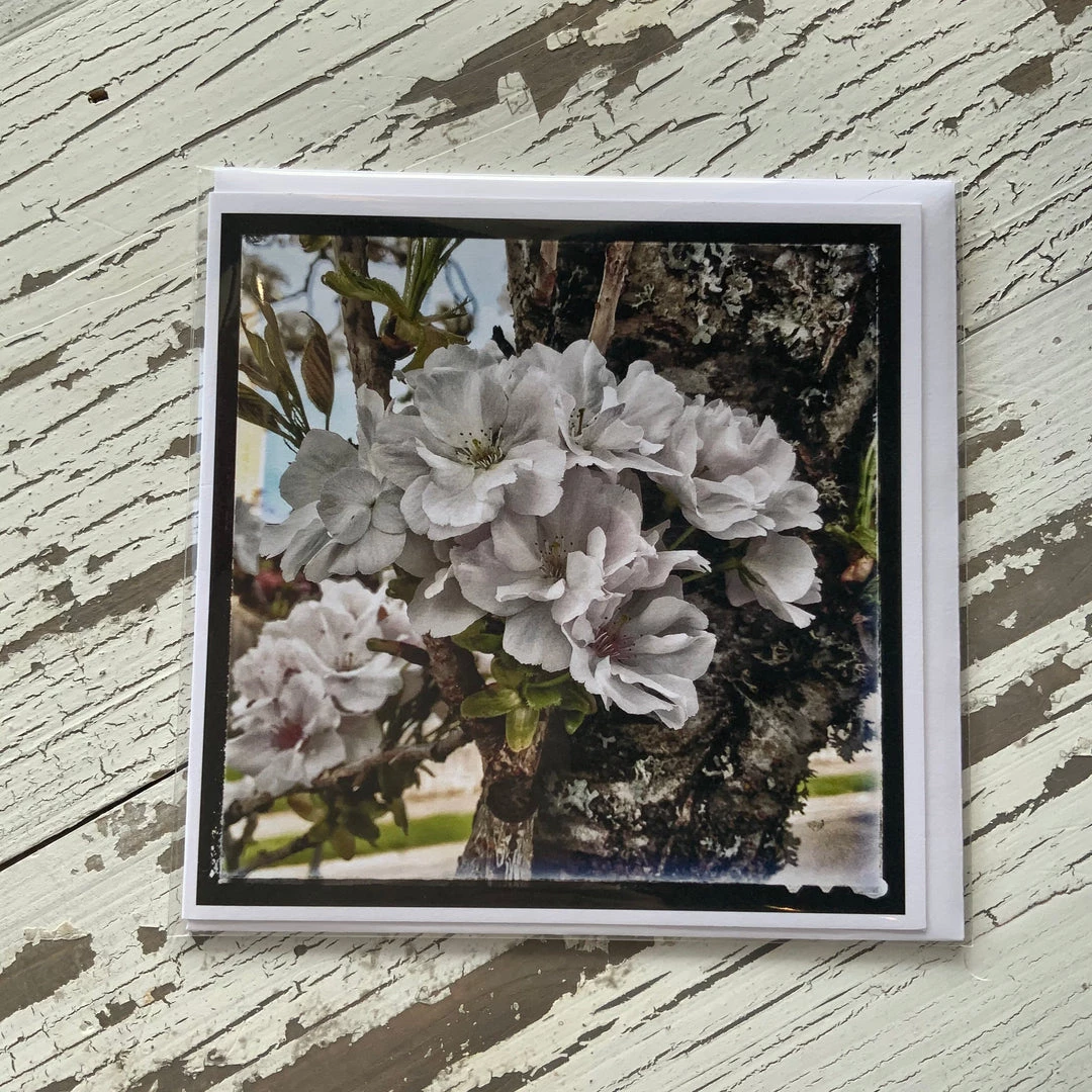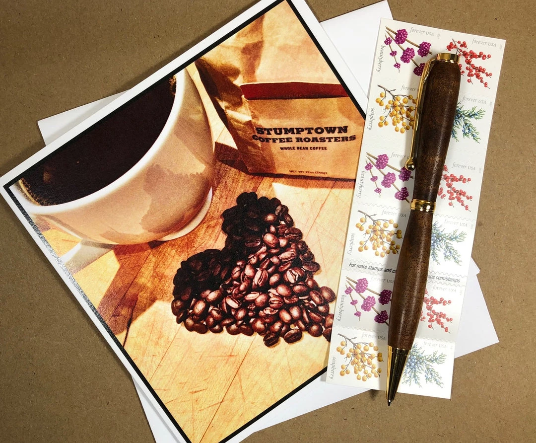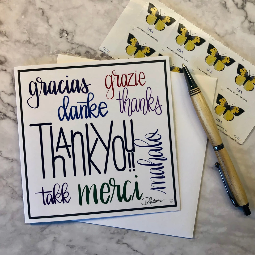 Each card is 5.25” square using 100 lb cougar cover heavy card stock. Envelopes are 5.5” square. Greeting cards are all blank inside.