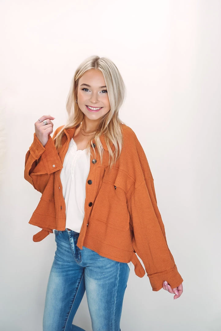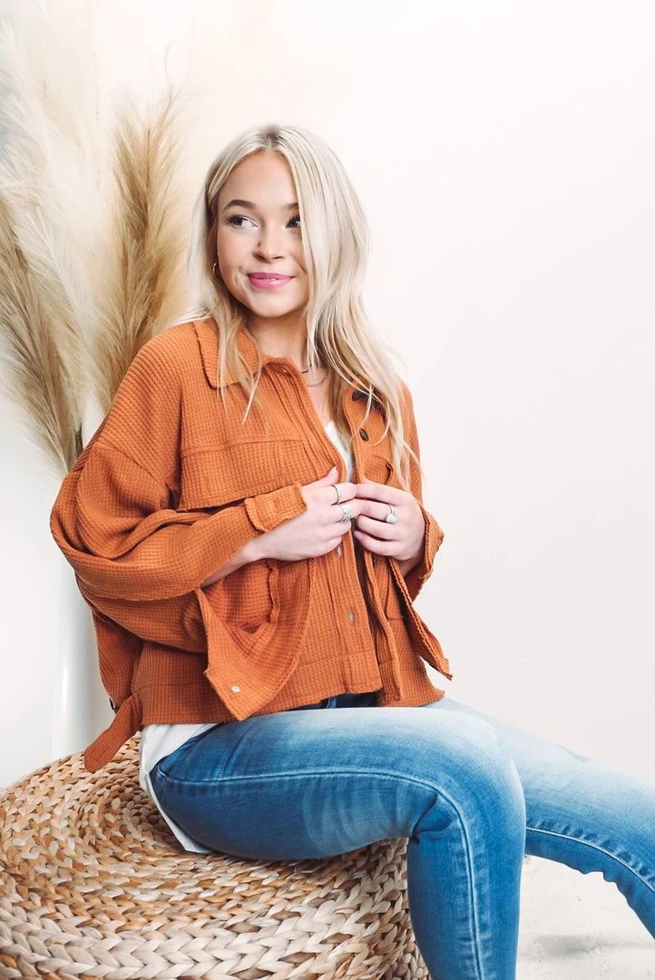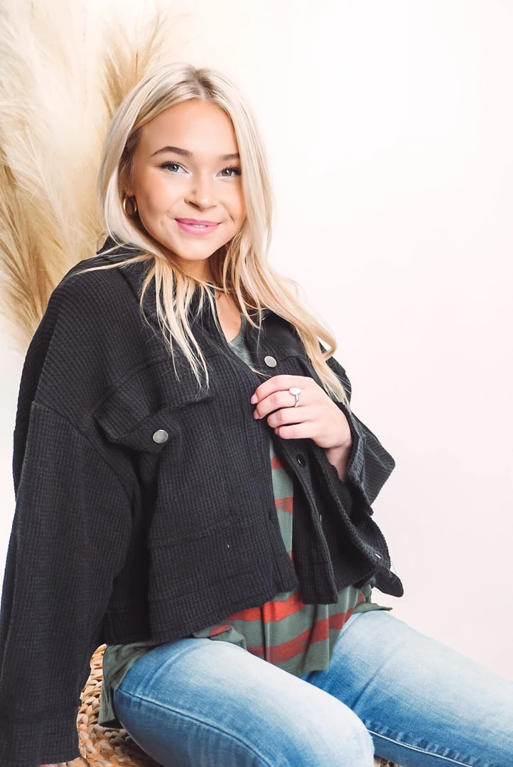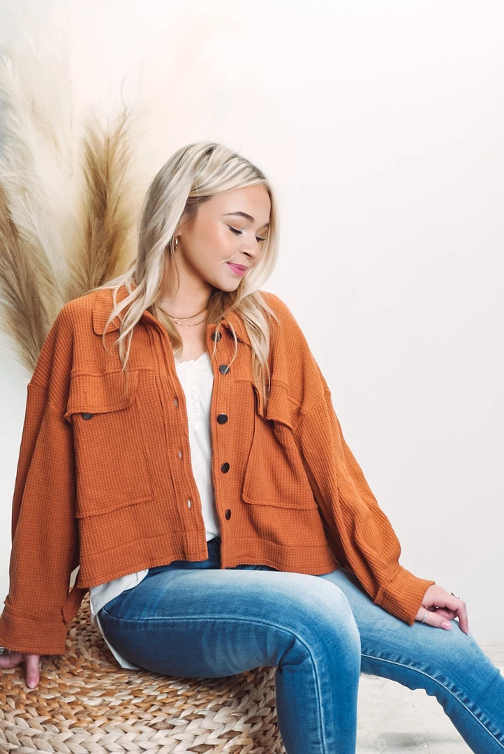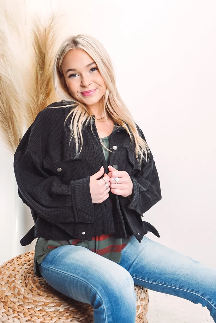 A cute and comfy layer that is such a versatile style! Designed in cropped jacket with big pockets, long sleeves, an oversized fit, featured in thermal knit. Available in 3 colors this jacket can be layered over just about anything paired with your favorite bottoms!