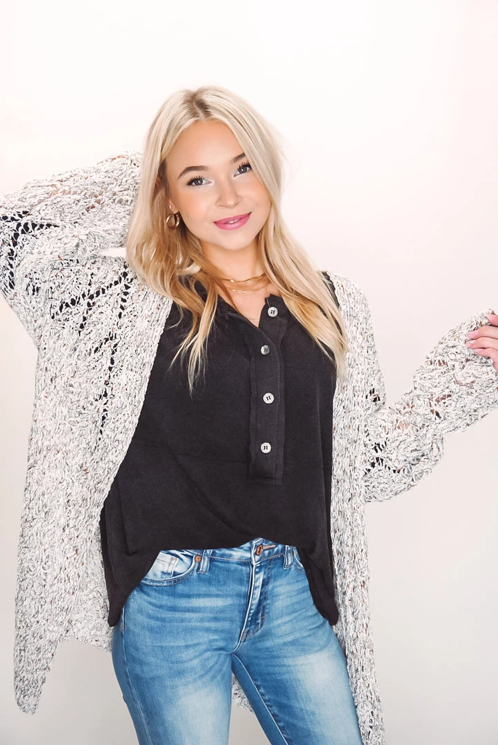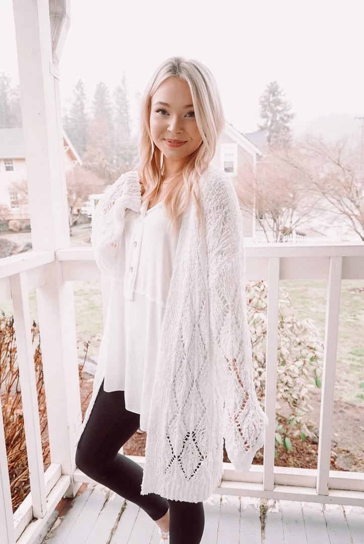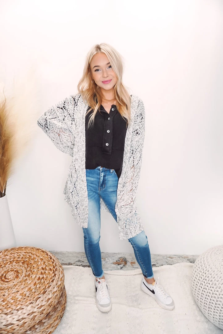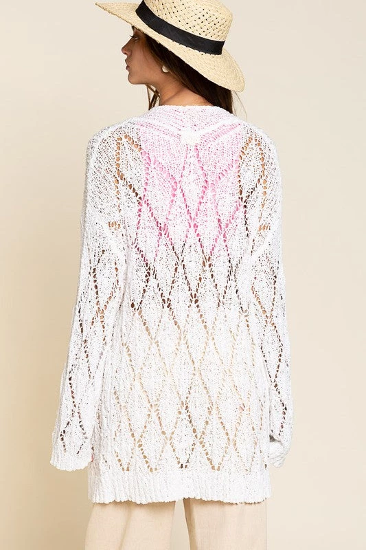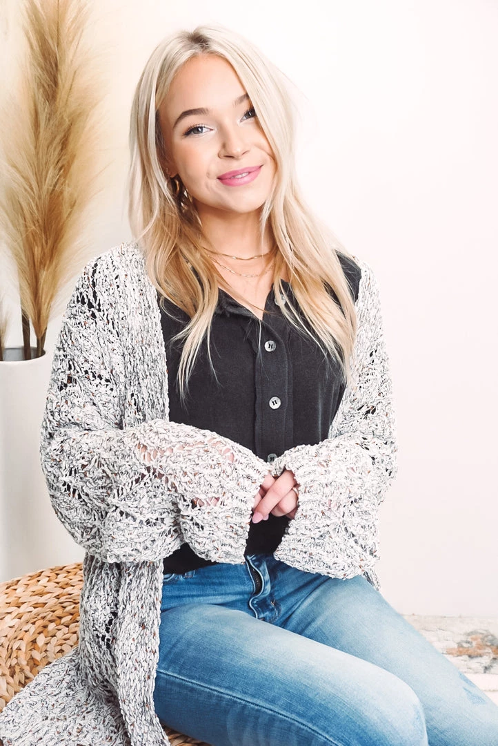 This layer is such an effortless yet stunning style! Designed in open front lightweight, summer confetti sweater cardigan with stretchy loose diamond shape weave, long length sleeve, relaxed fit, and clean hemline.
