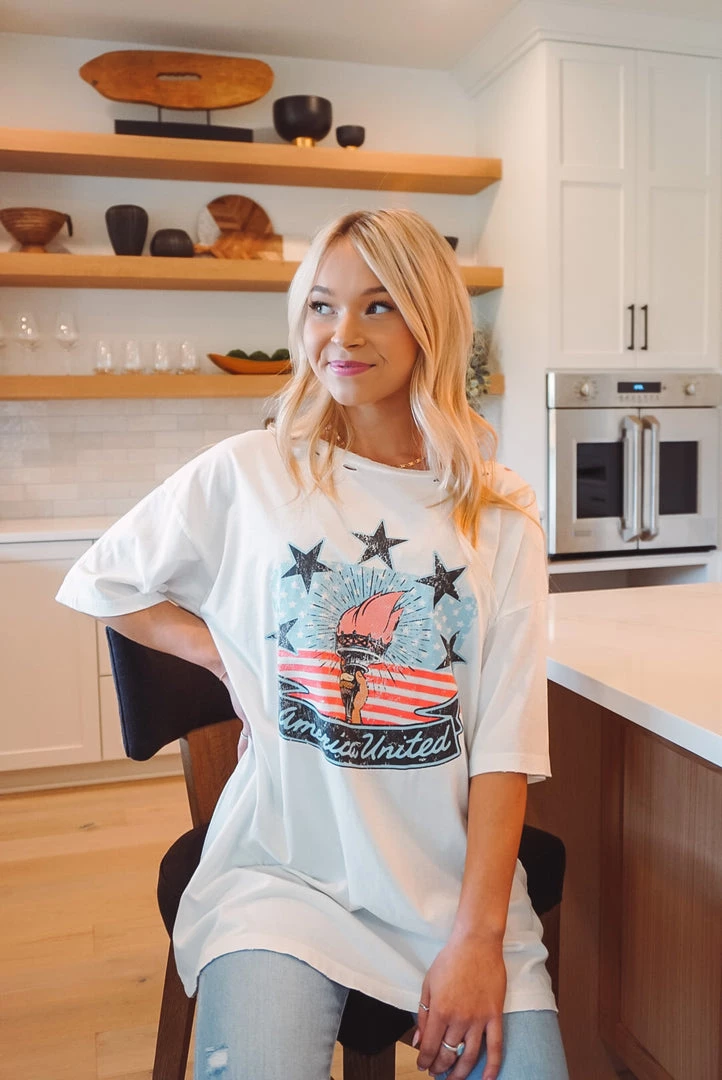 America United! This distressed tee features a round neckline, short sleeves, vintage style graphic, dropped shoulders, distressed detailing on neck, cuffs, and hem, and a loose-relaxed fit. Pair with a variety of bottoms for an easy wear & patriotic look!