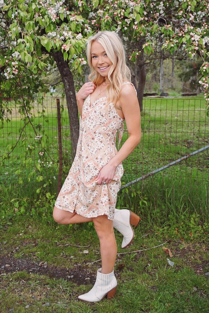 Say hello to your new rodeo ensemble! A floral print-woven mini dress featuring a sweetheart neckline, sleeveless style, shoulder straps, front twist & button detailing, and a darling self-tie back. Pair with your favorite pair of boots or sandals for a stunning spring & summer style!