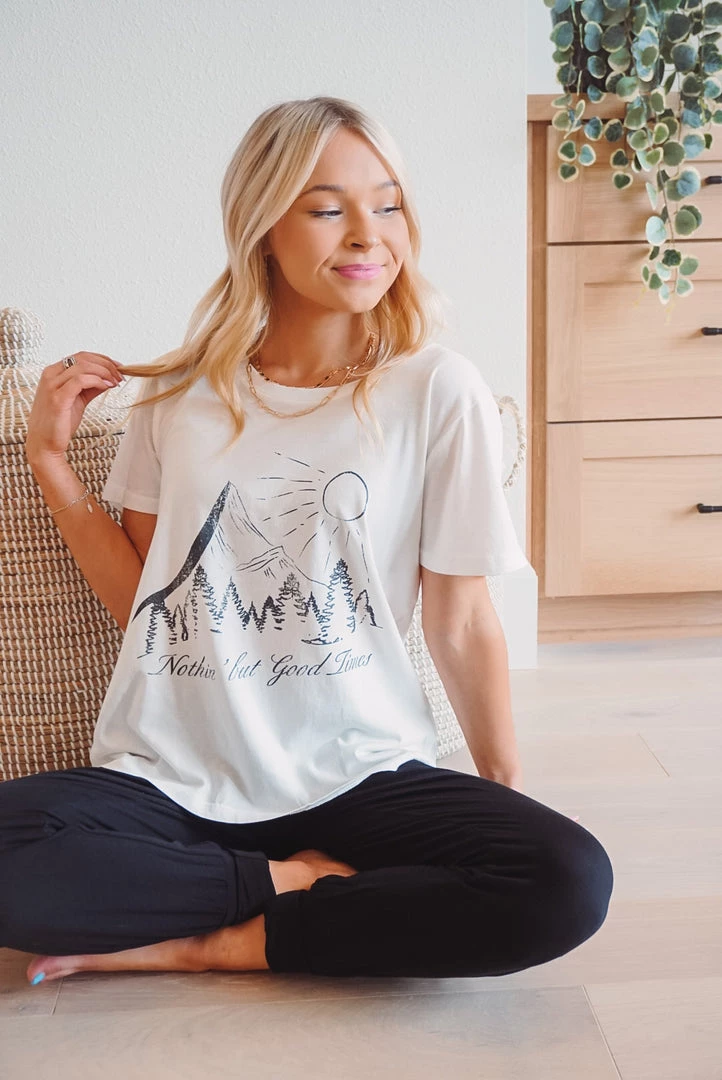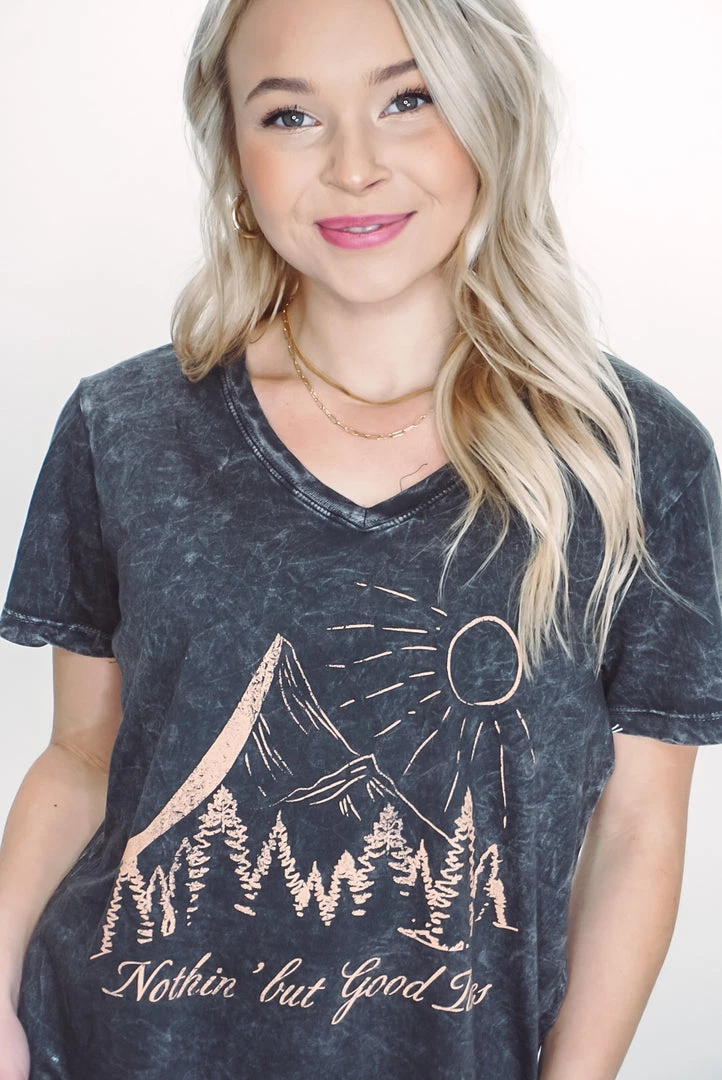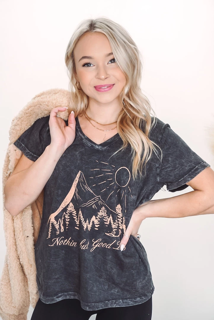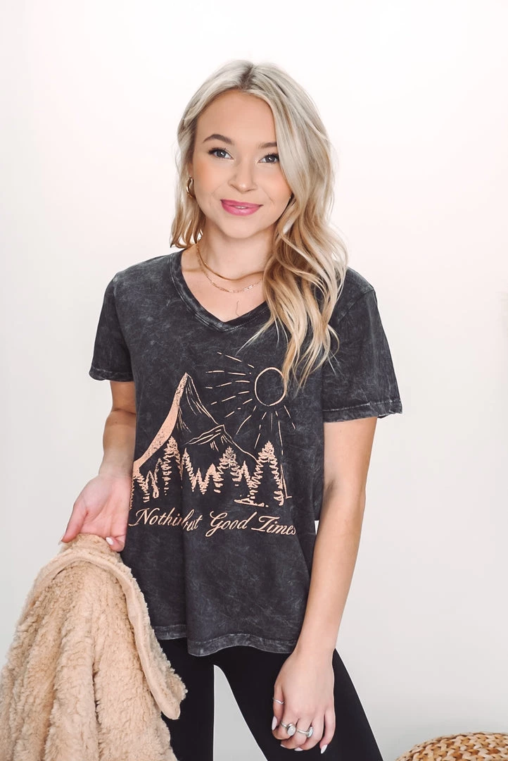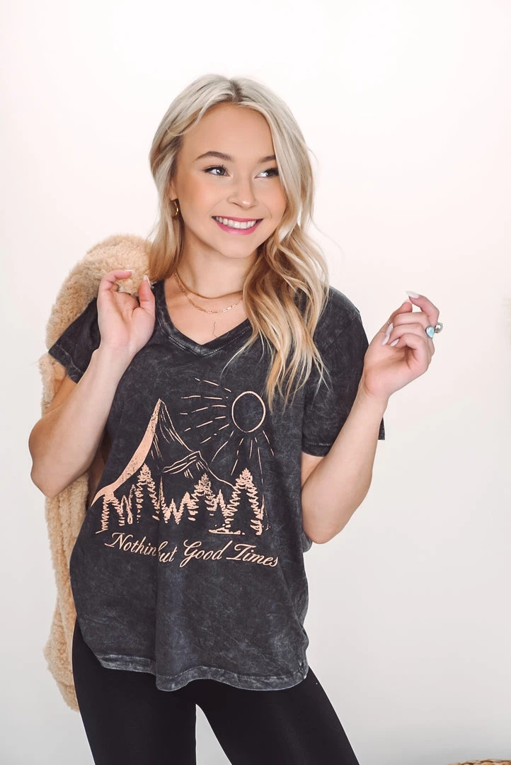 We love a good graphic tee! The Nothin’ But Good Times Tee is a mineral-washed graphic tee following featuring a forest and mountain sunshine graphic with the text “Nothin’ but good times”,V neckline, short sleeves, & a relaxed fit. Pair with any bottom layered under a jacket or cardigan for a unique yet darling ensemble.