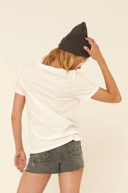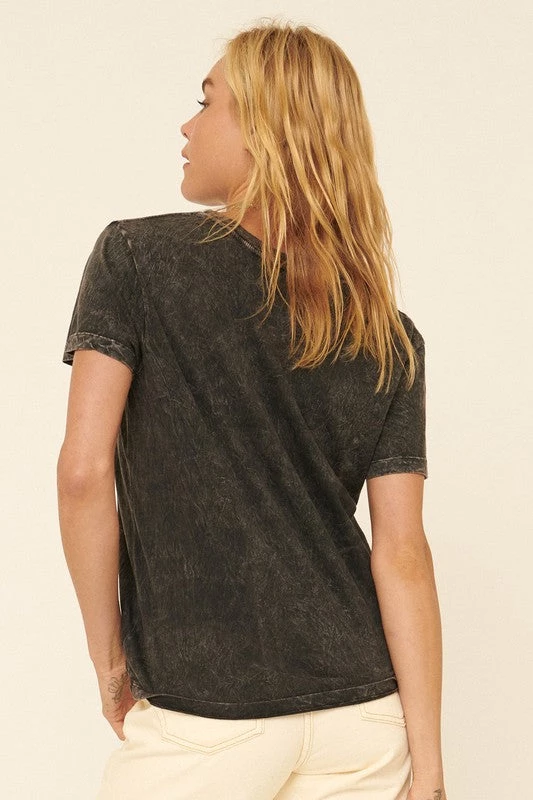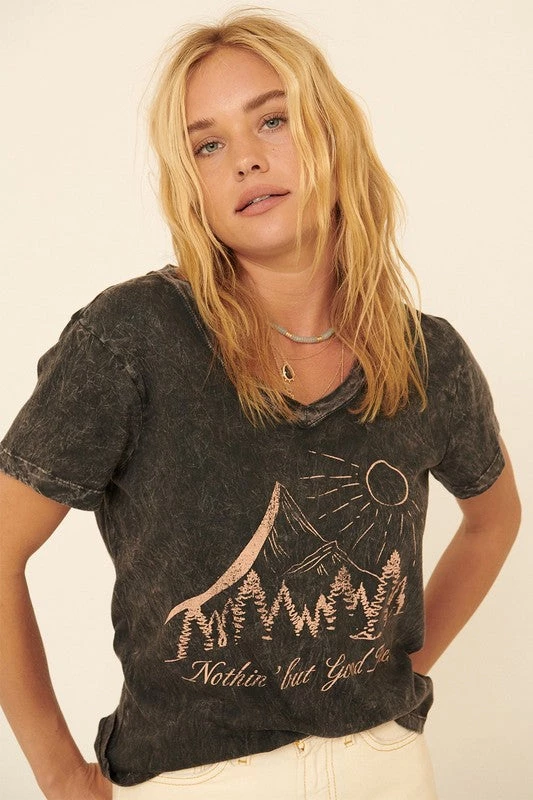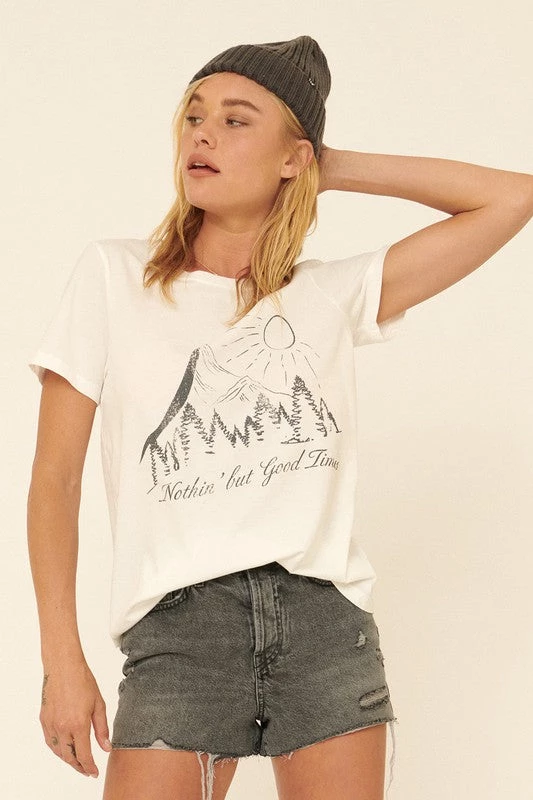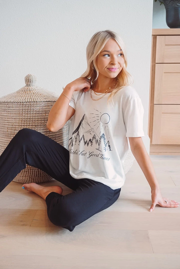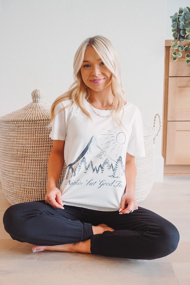 We love a good graphic tee! The Nothin’ But Good Times Tee is a mineral-washed graphic tee following featuring a forest and mountain sunshine graphic with the text “Nothin’ but good times”,V neckline, short sleeves, & a relaxed fit. Pair with any bottom layered under a jacket or cardigan for a unique yet darling ensemble.