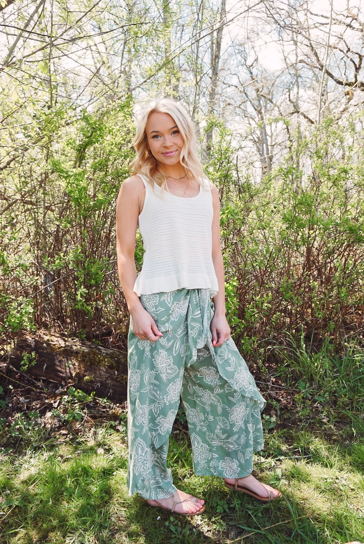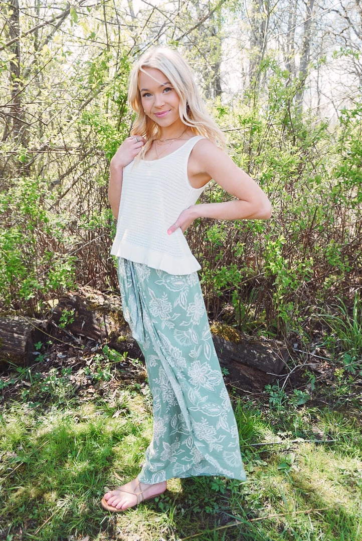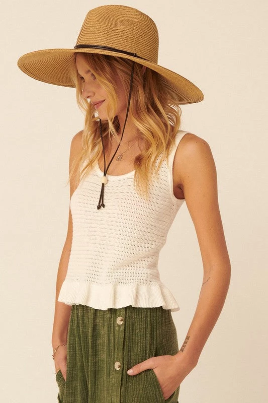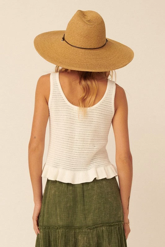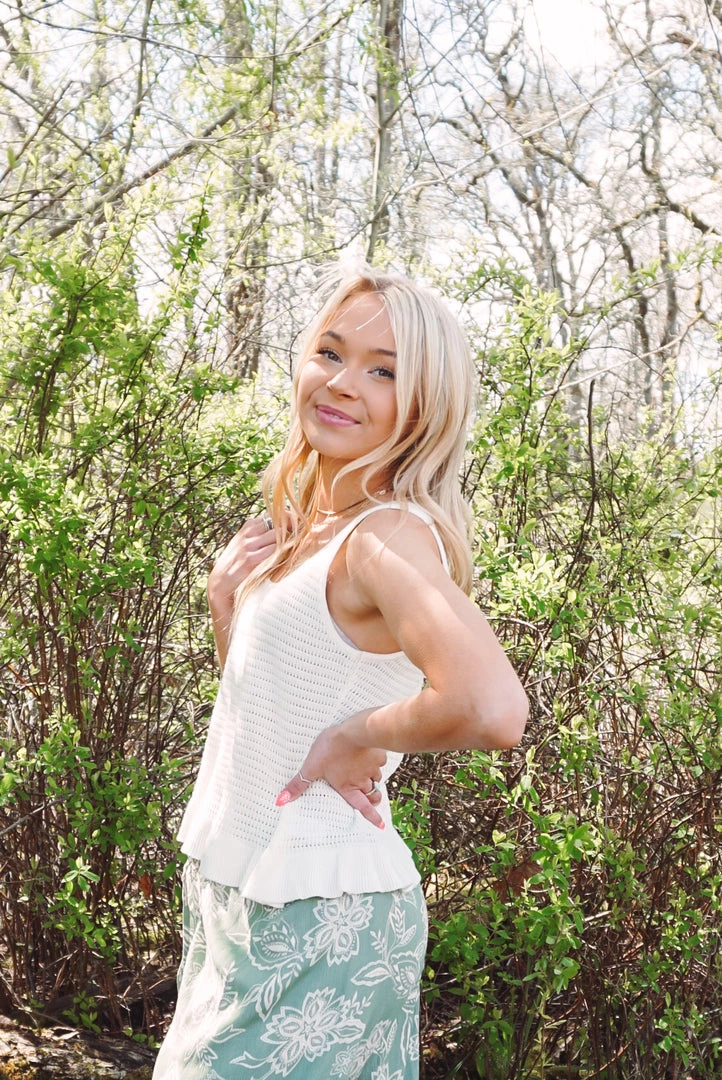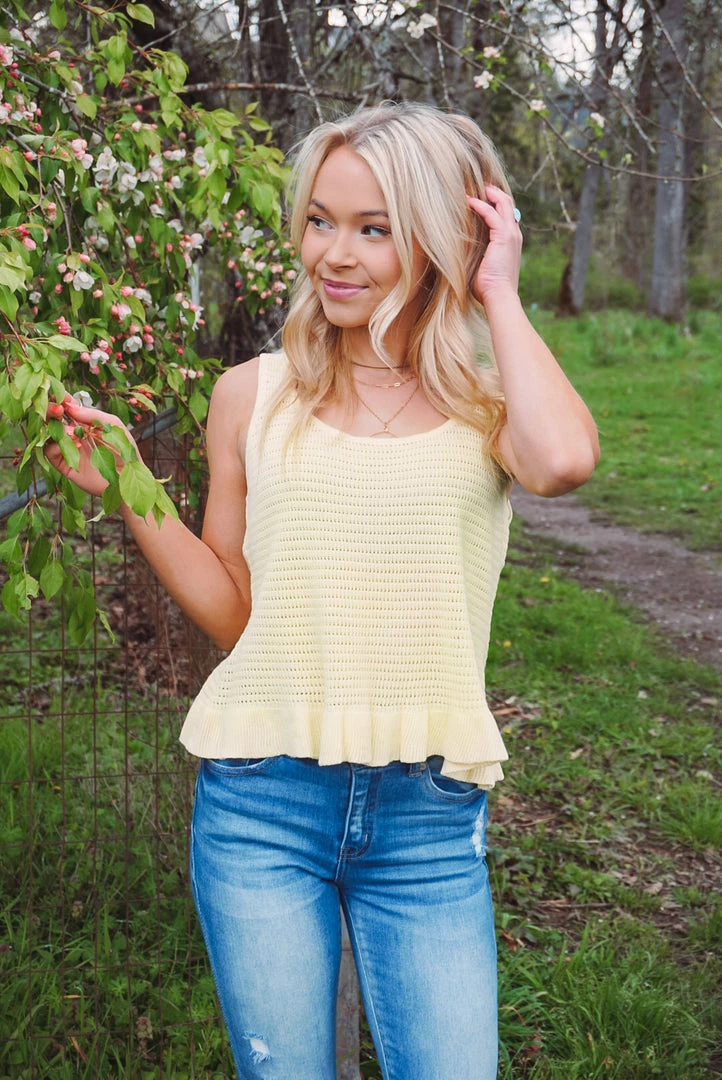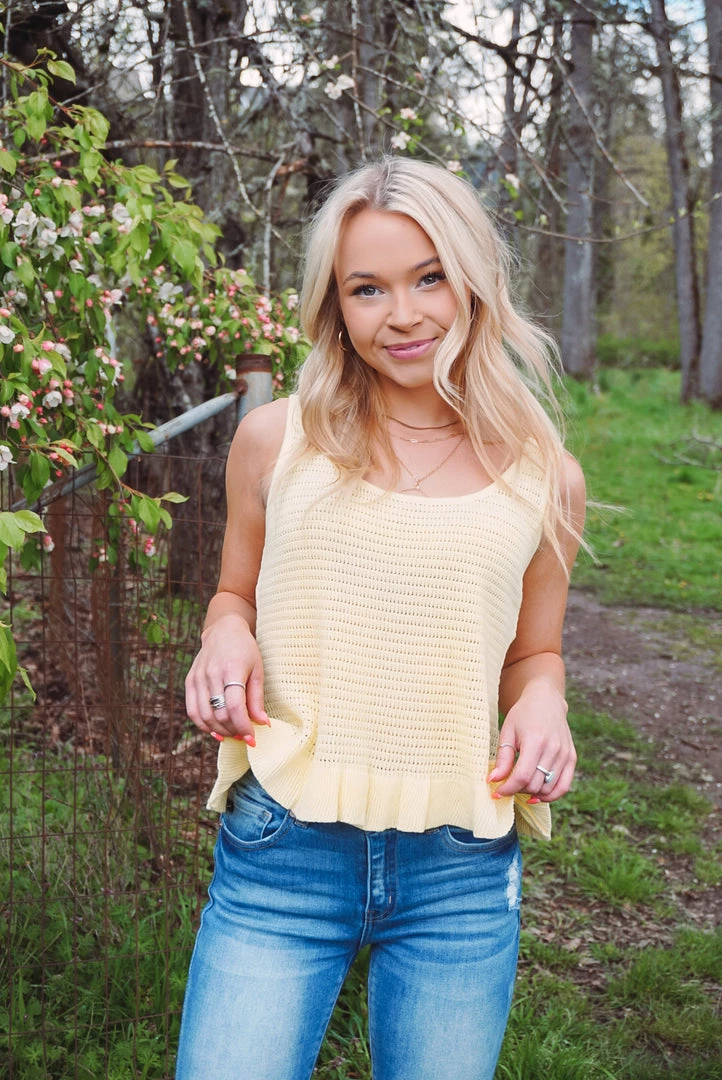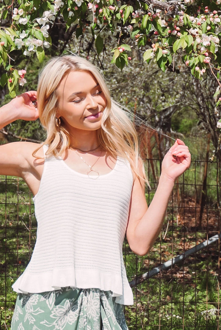 How sweet is this little knit tank? The Quincy Tank features an eyelet knit, darling ruffle hem, scoop neckline, sleeveless style, and a fitted silhouette. Available in 2 colors, this tank can be paired with a variety of bottoms adding a unique texture to your look!