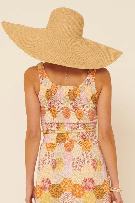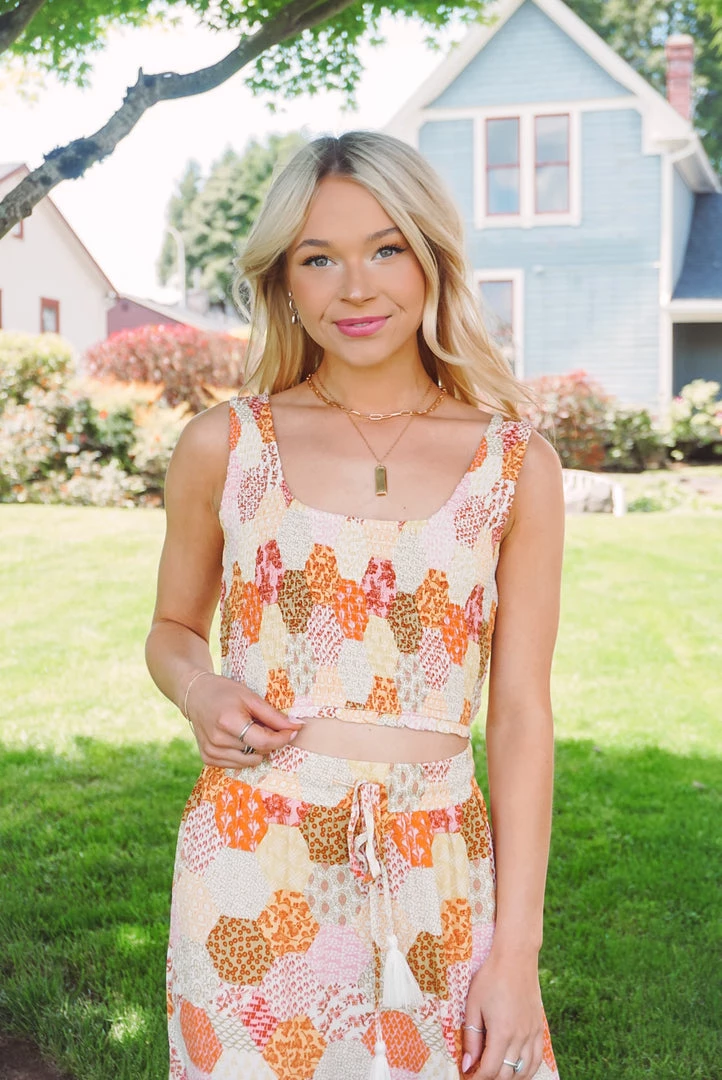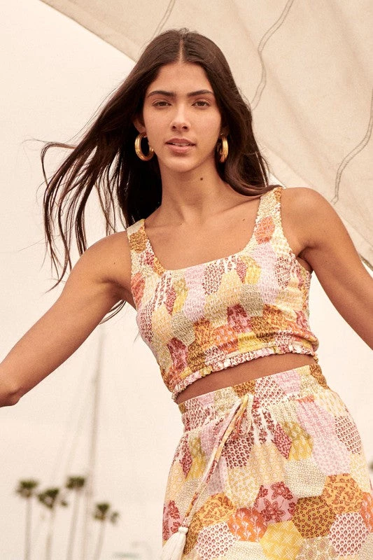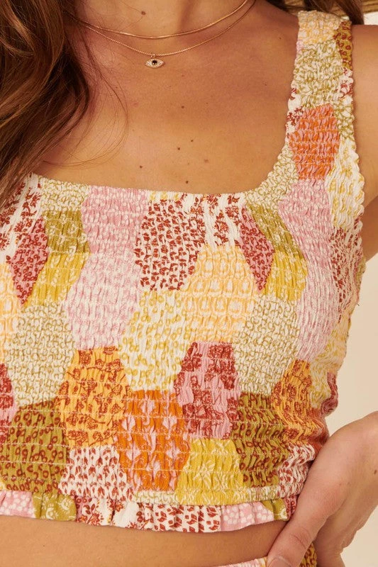 We love this colorful patchwork tank! The Trend Setter Tank features a scoop neckline, sleeveless style, smocked design throughout, cropped length, ruffled hem, and a fitted silhouette. Pair with the ‘Set A Trend Skirt’ for a matching set!